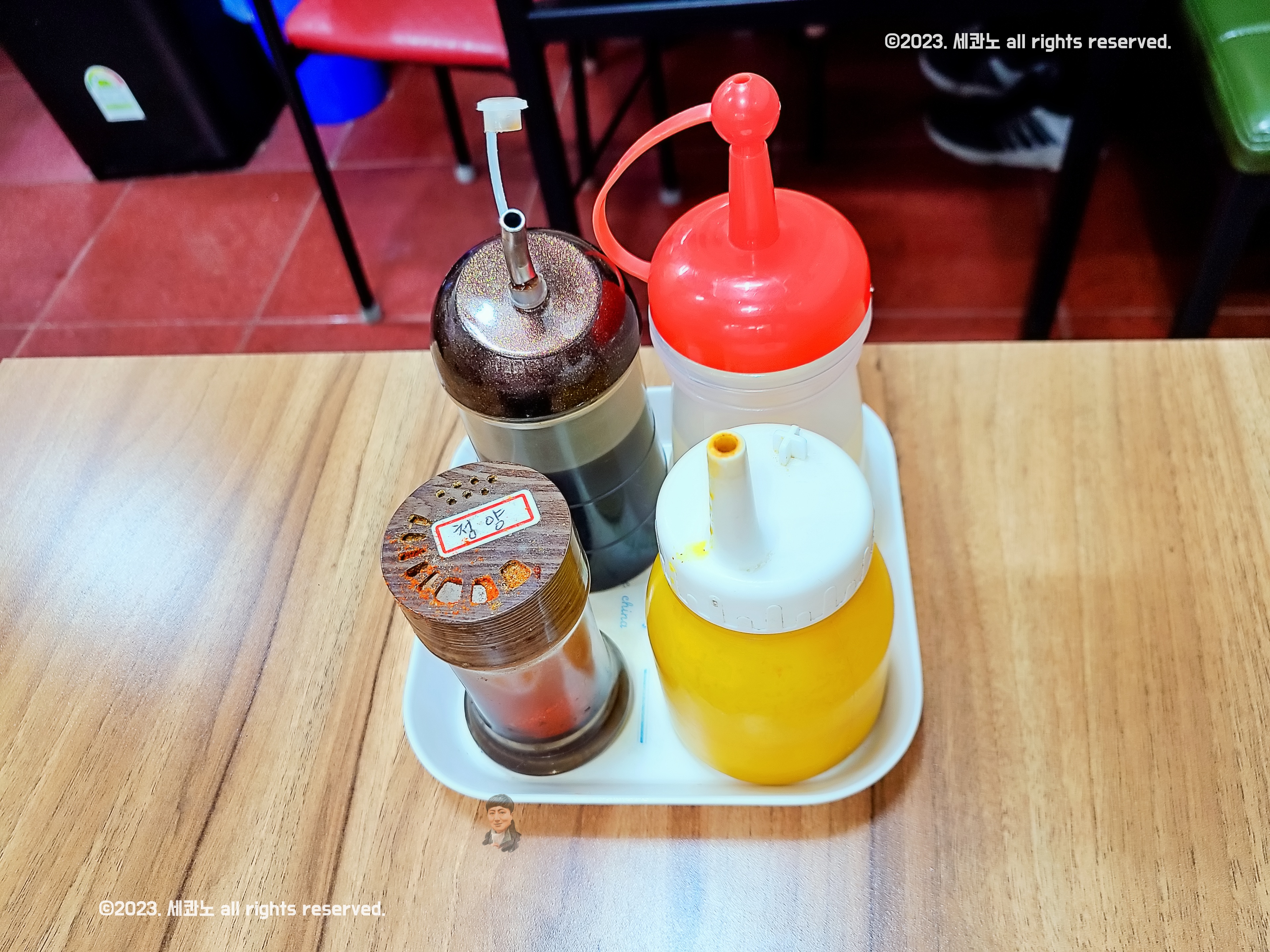 테이블에는 간장, 식초, 청양고추가루, 겨자가 준비되어 있었고