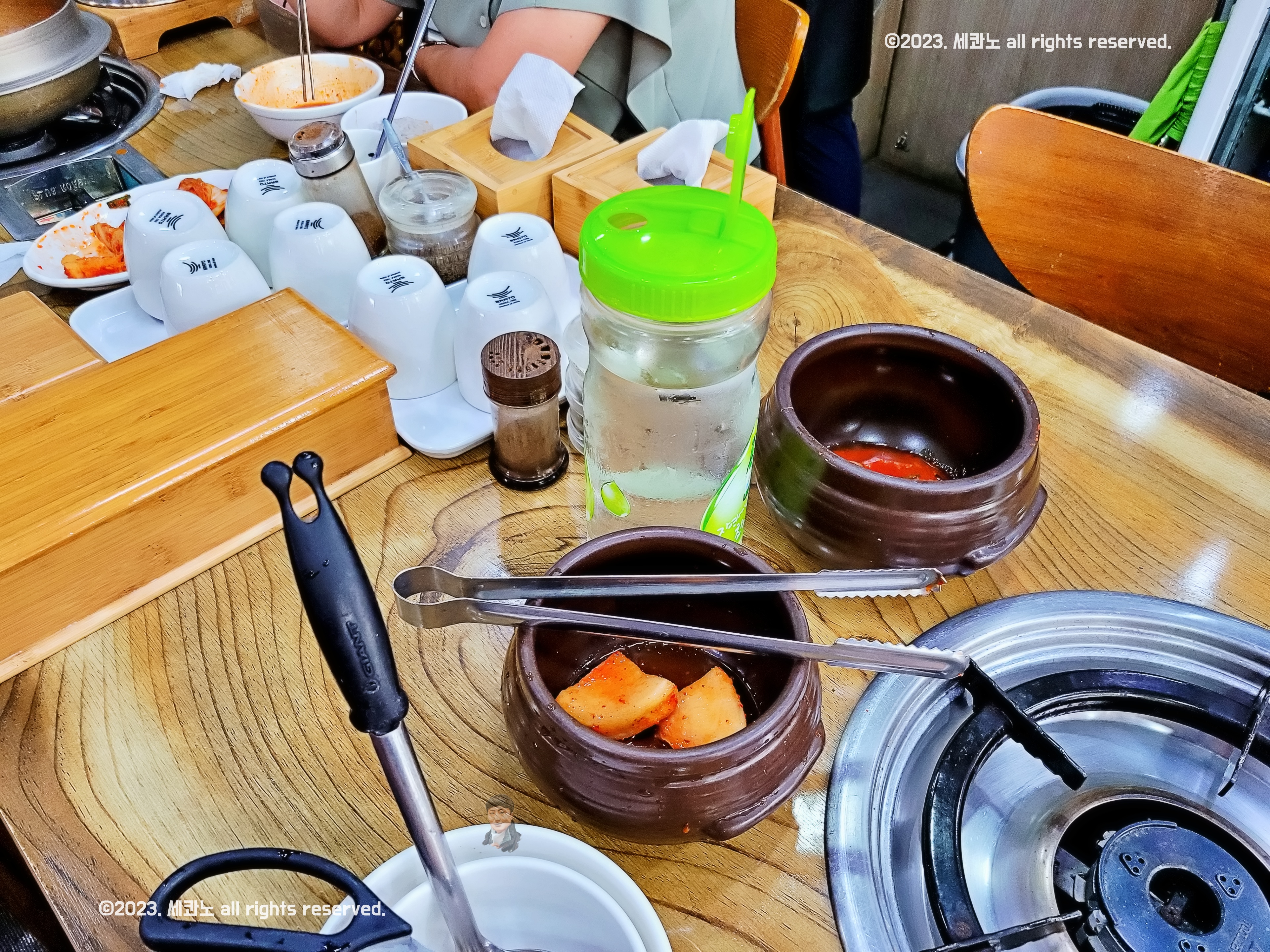 테이블에는 산초와 들깨가루가 준비되어 있었고