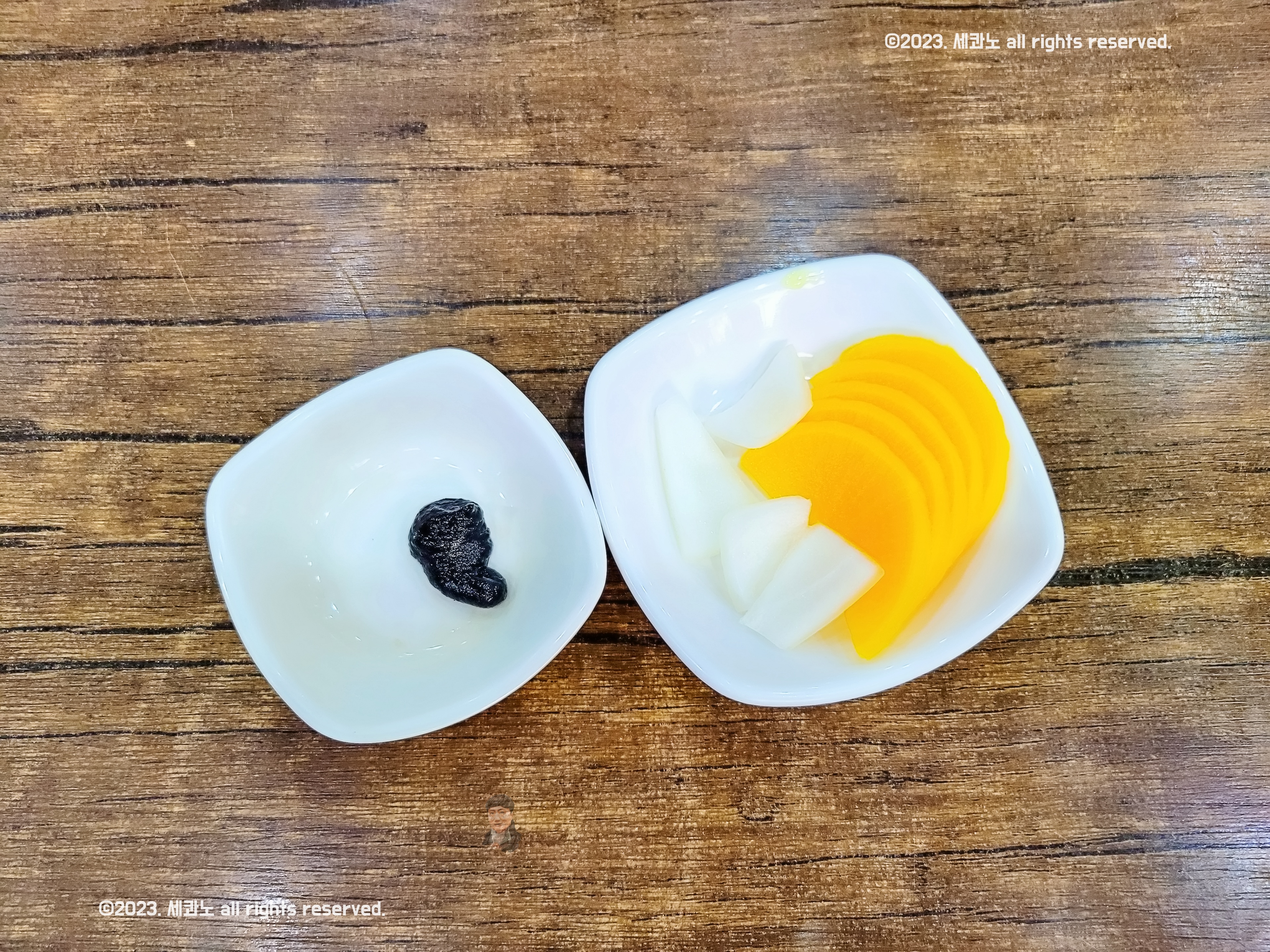 테이블에는 간장과 식초, 고춧가루가 세팅