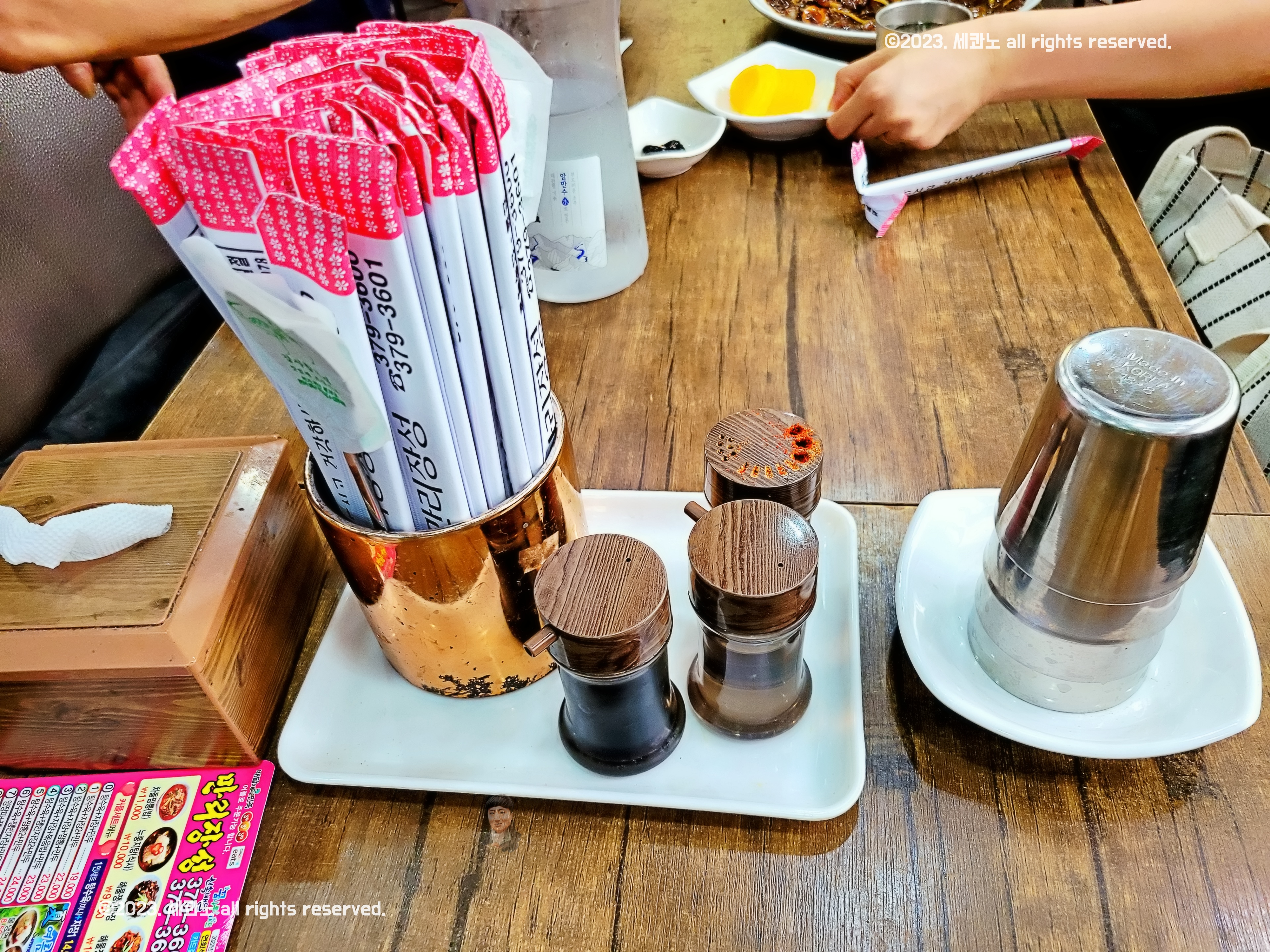 테이블에는 간장과 식초, 고춧가루가 세팅