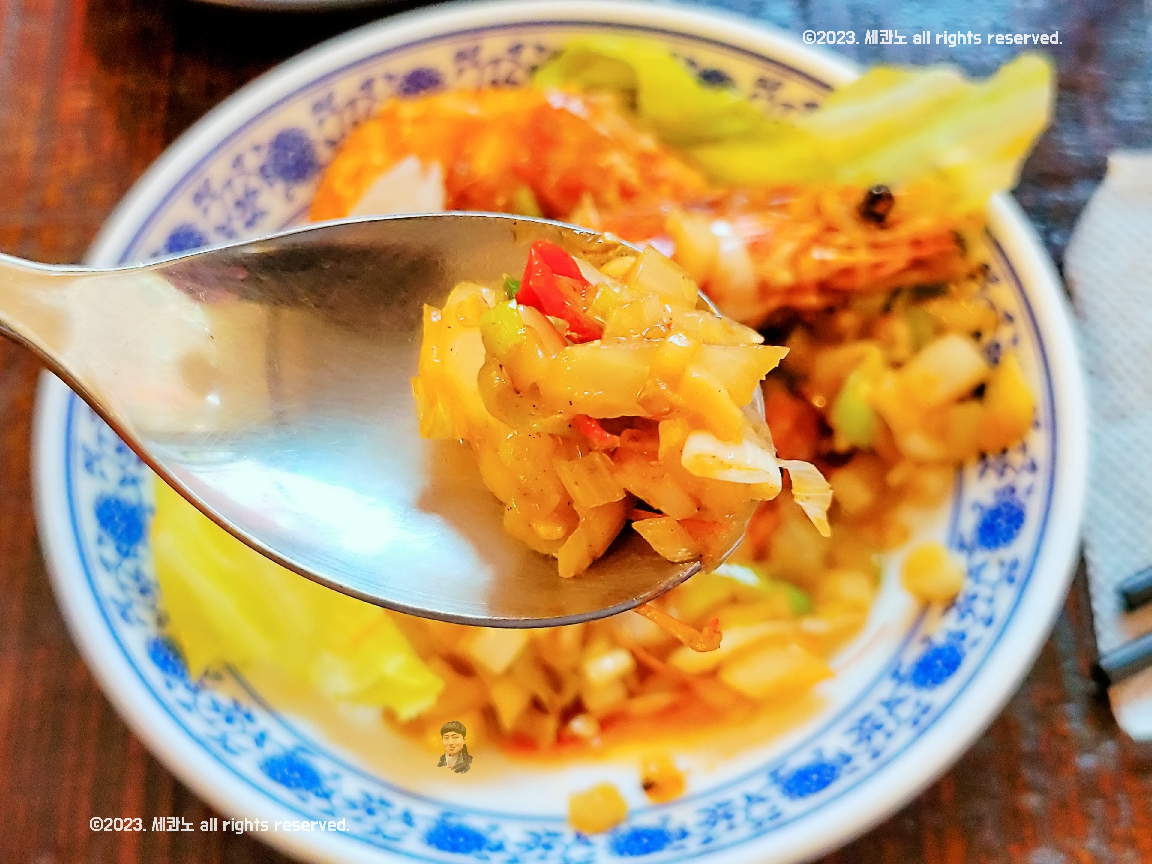 후추를 비롯해 대파, 청양고추, 홍고추, 마늘, 양배추 등에 함께 볶았다.