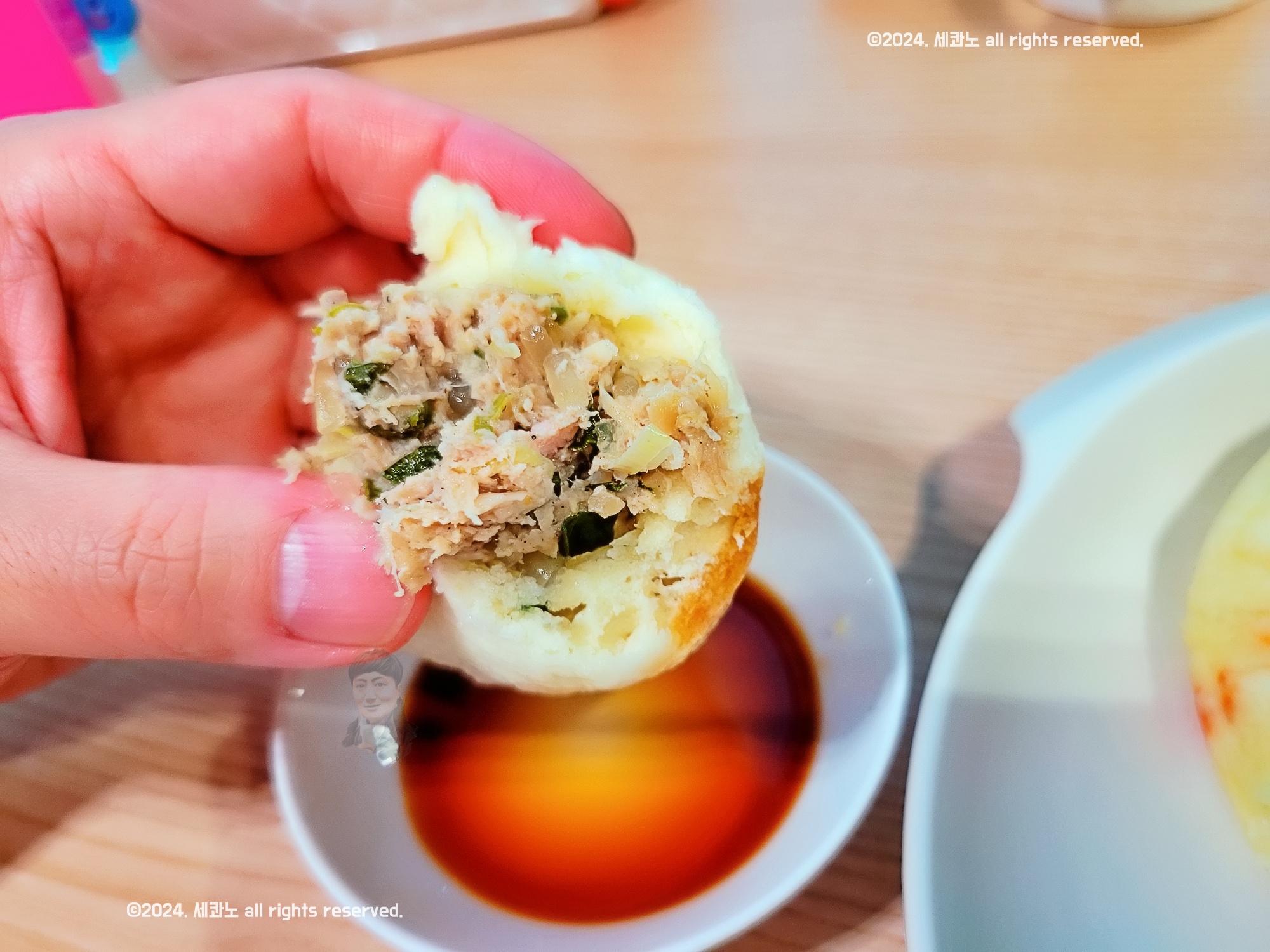 고기 왕만두를 간장 찍어 먹으니