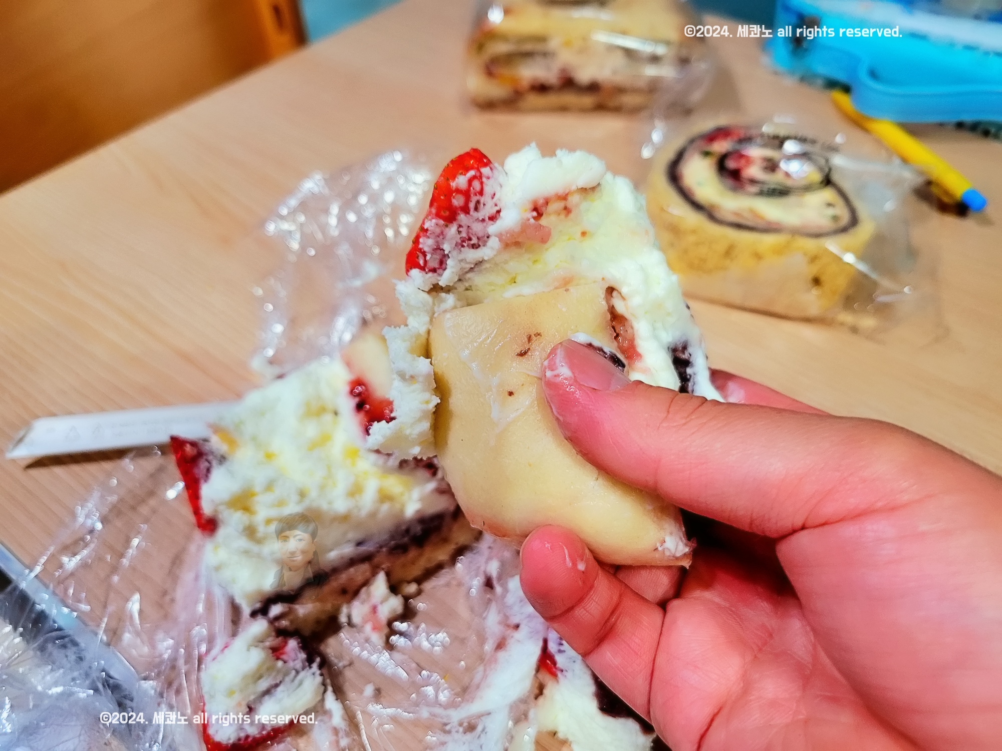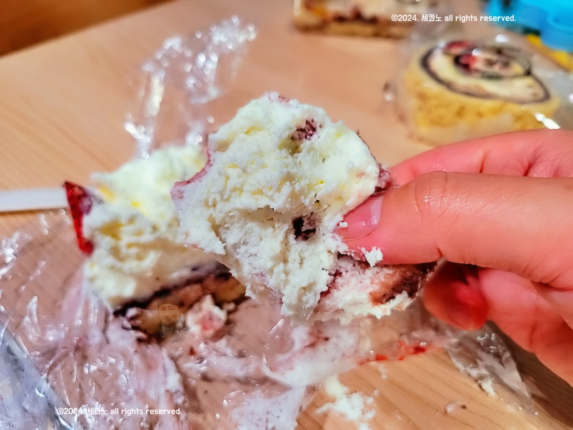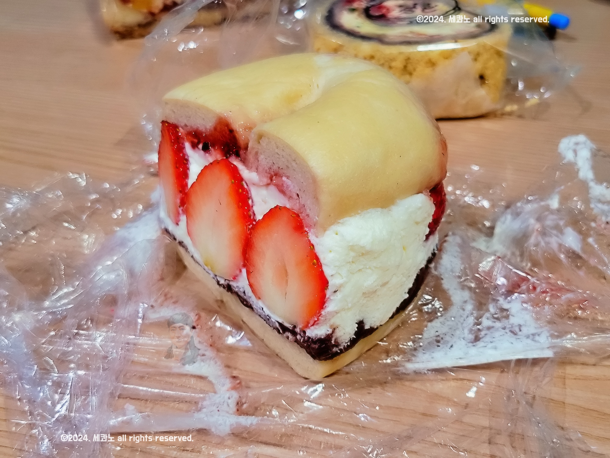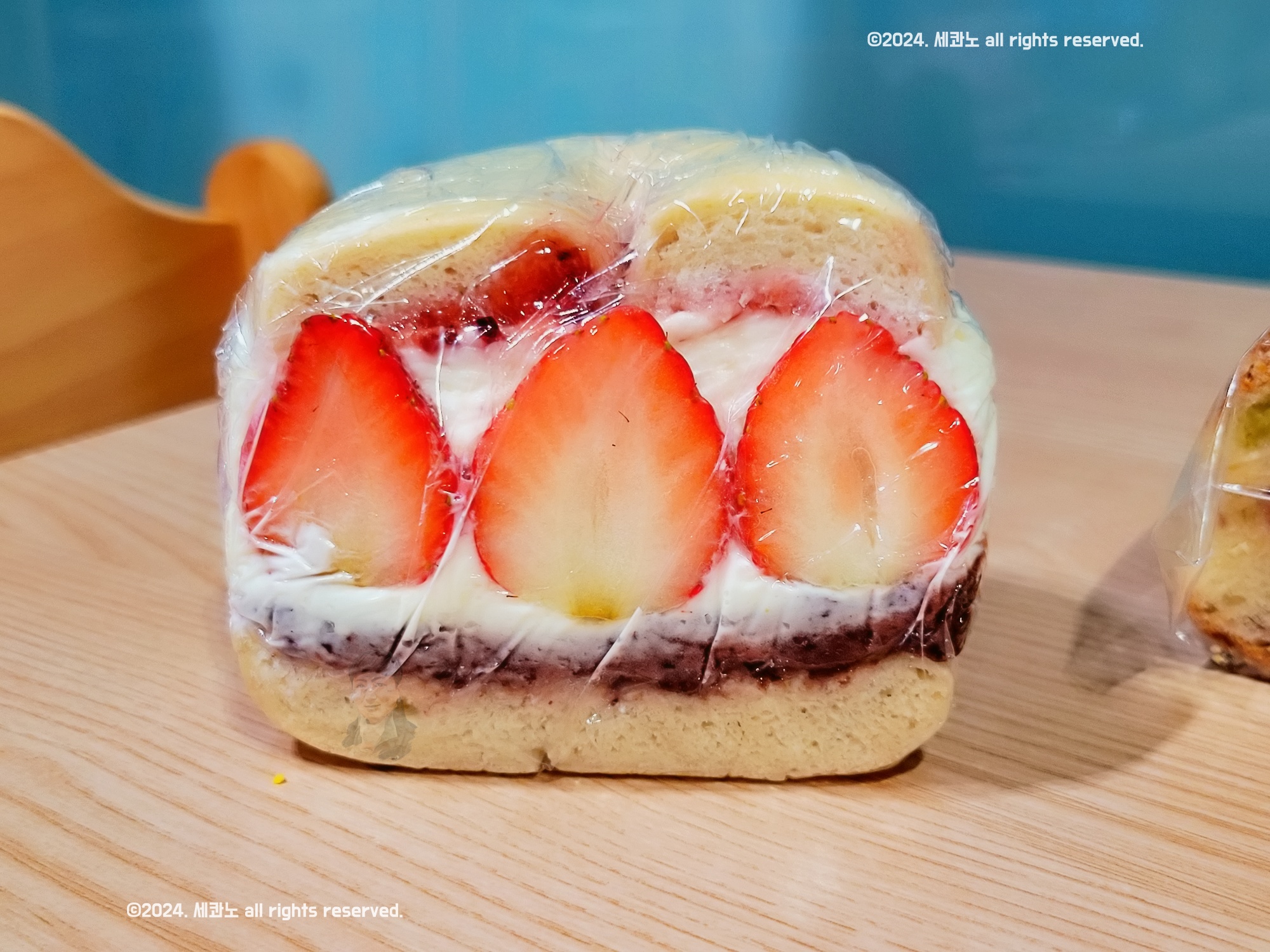 두툼한 빵 안쪽에 얇게 딸기잼과 크림 펴바른
