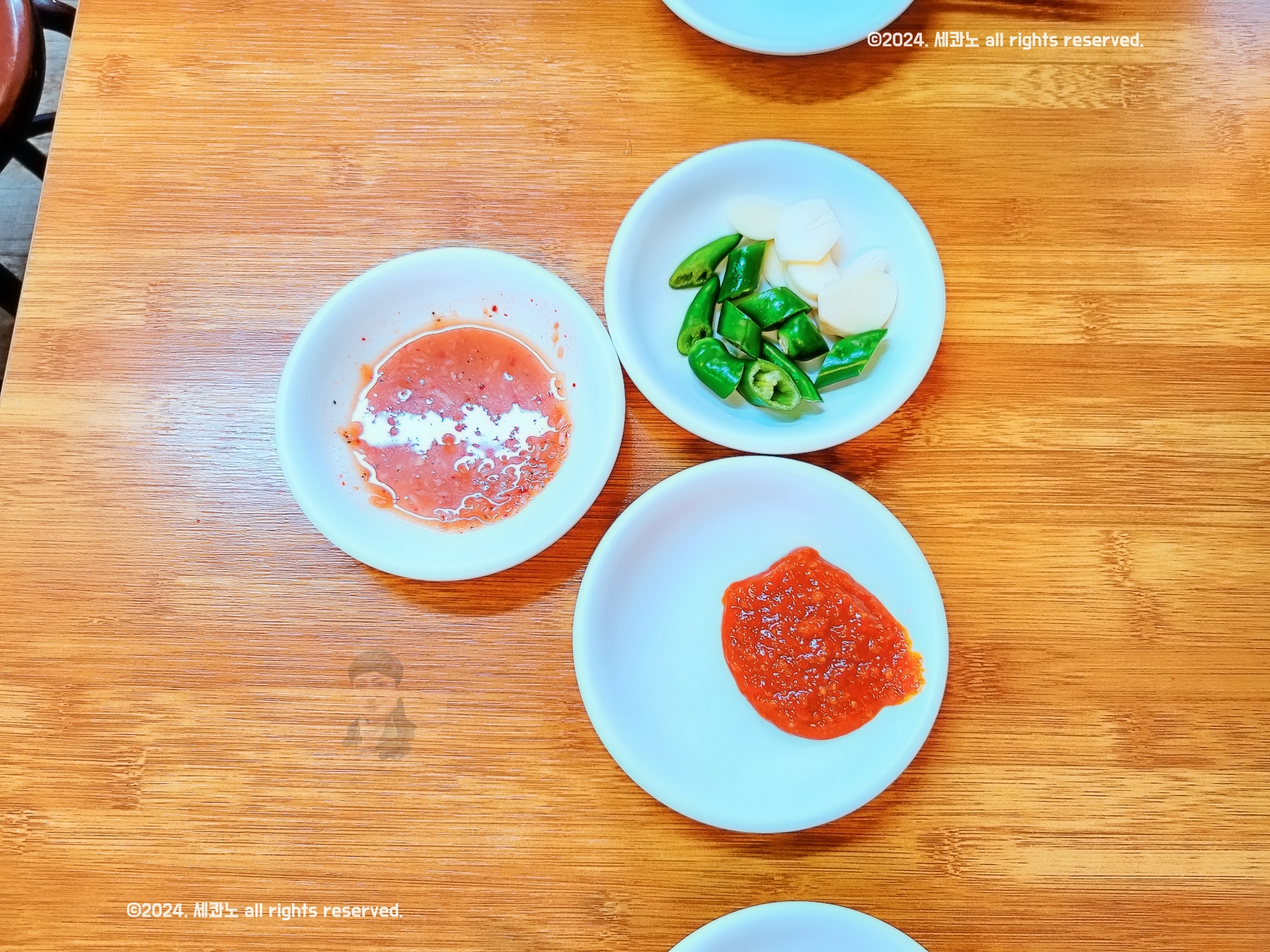 보쌈을 시켜서 그런가 마늘과 고추, 쌈장, 새우젓이 나왔다.