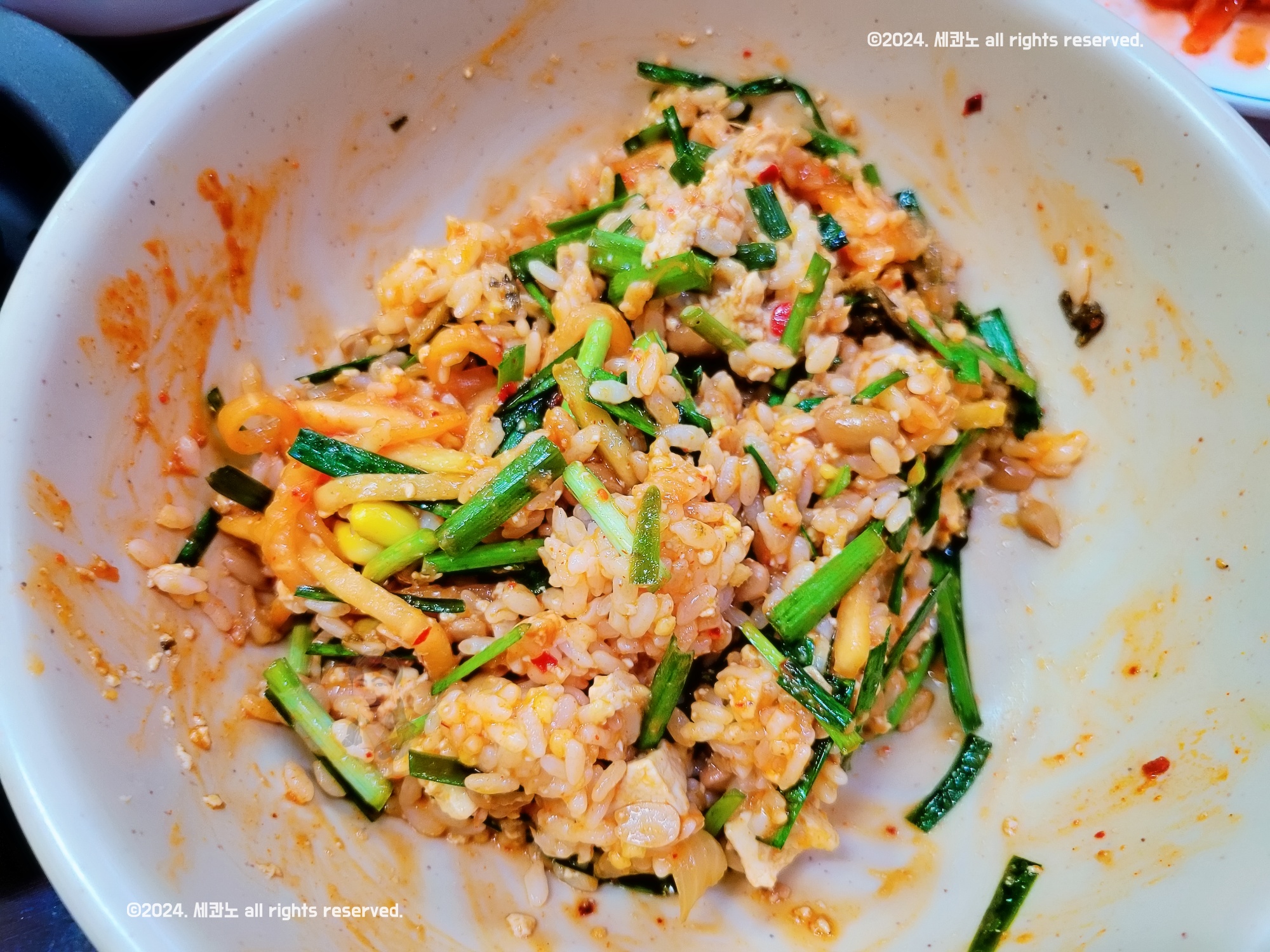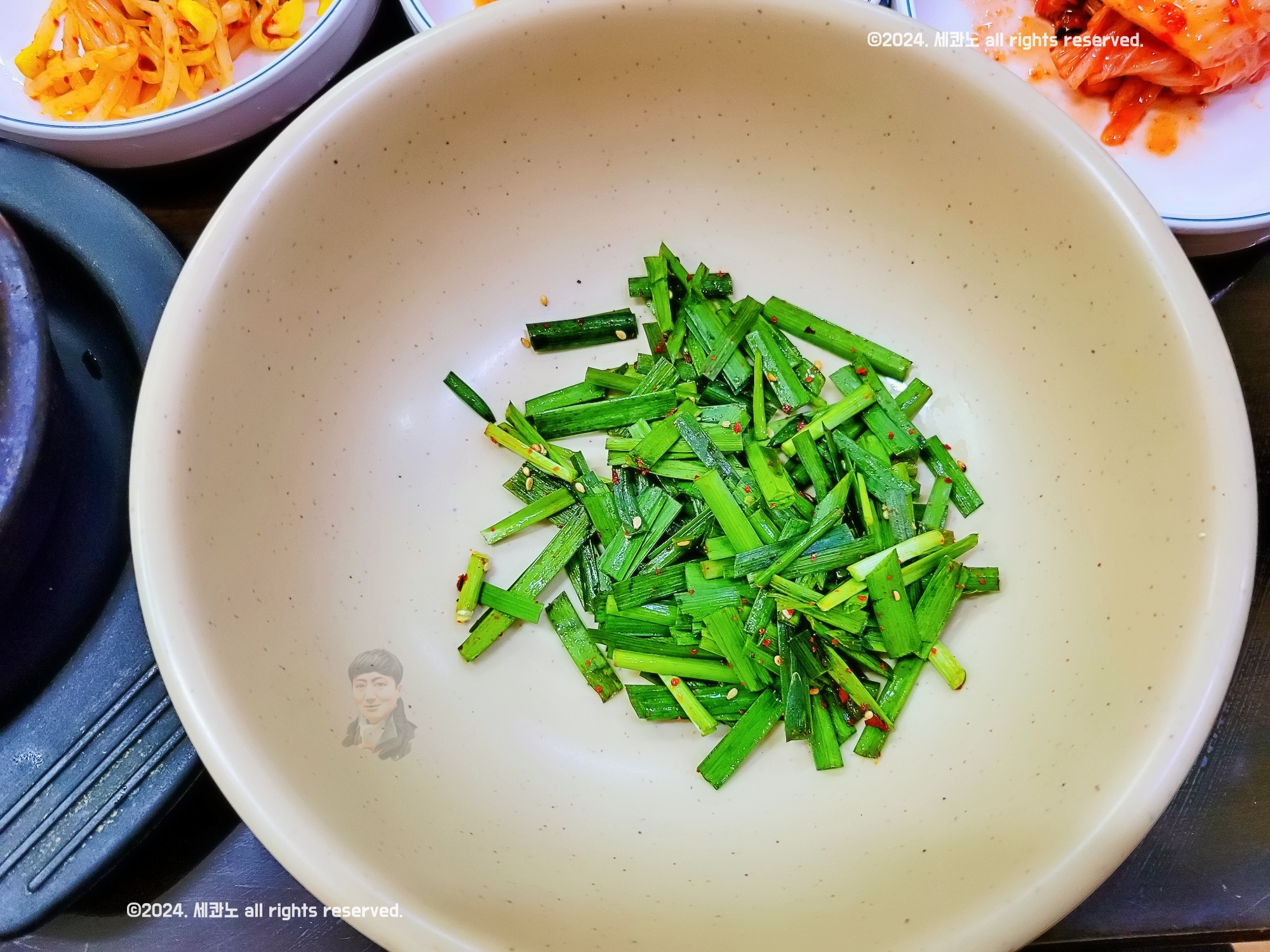 살짝 무쳐낸 부추가 조금 들어가 있다.