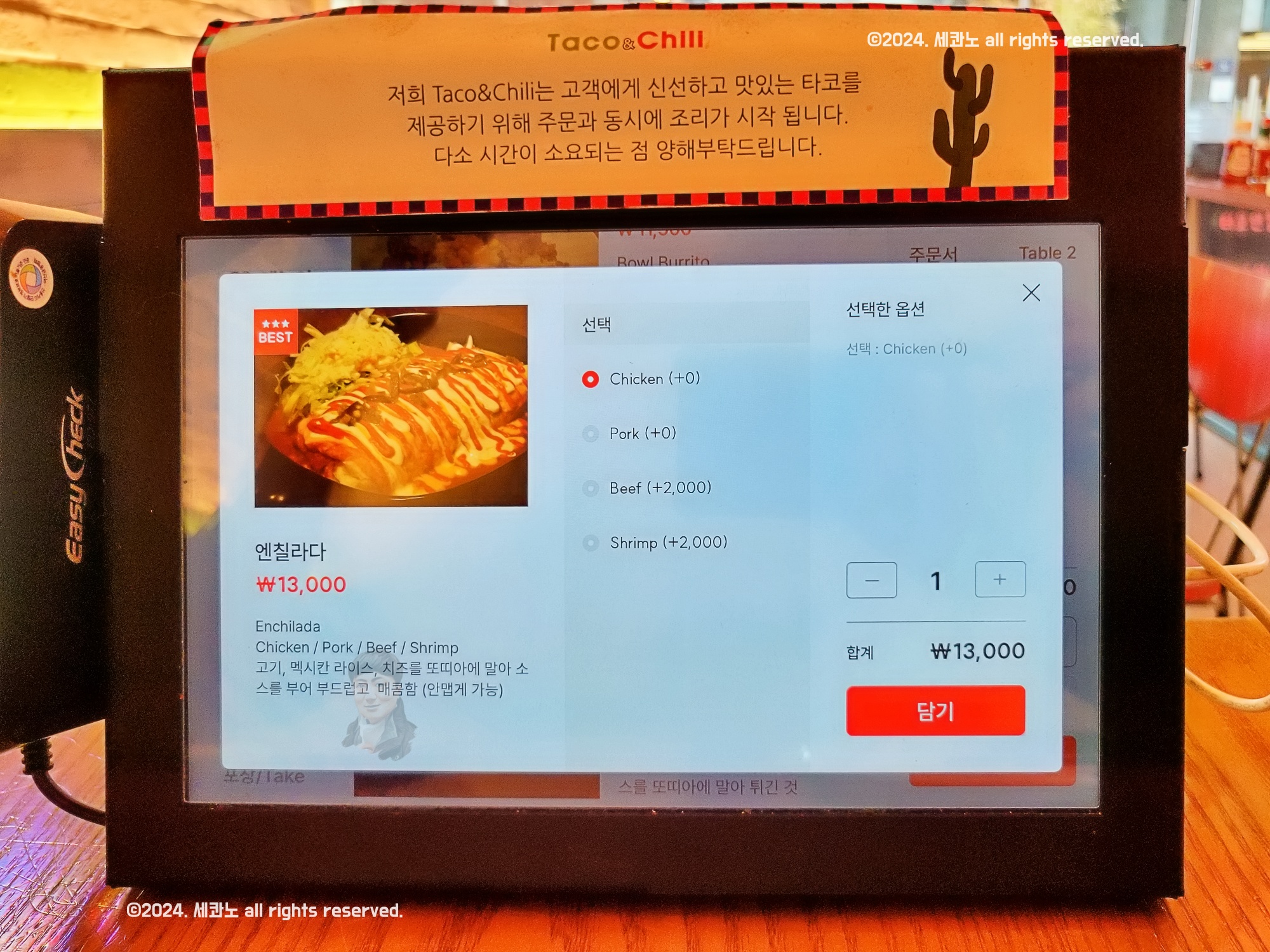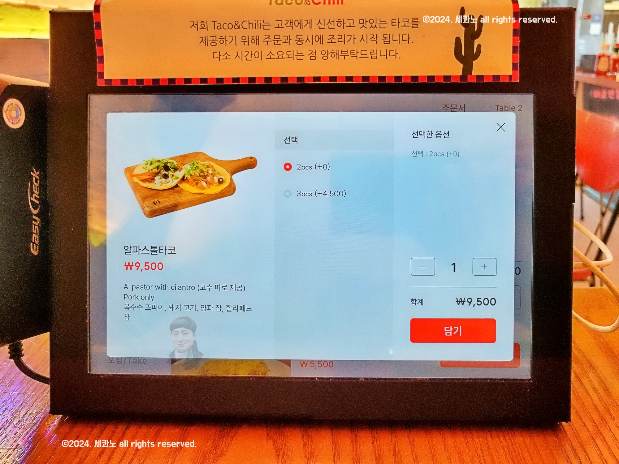 대표메뉴 : 알바스톨타코 2pcs 9,500원. 엔칠라다 13,000원