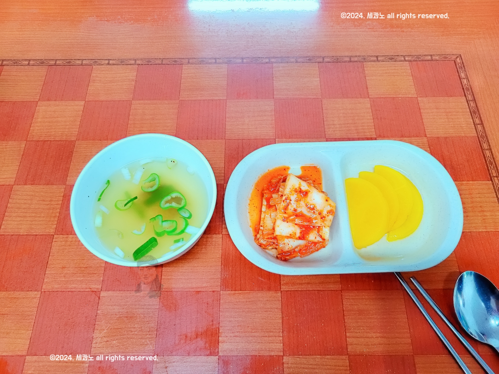 고추, 젓갈, 오징어채무침 등의 반찬이 제공되더라.