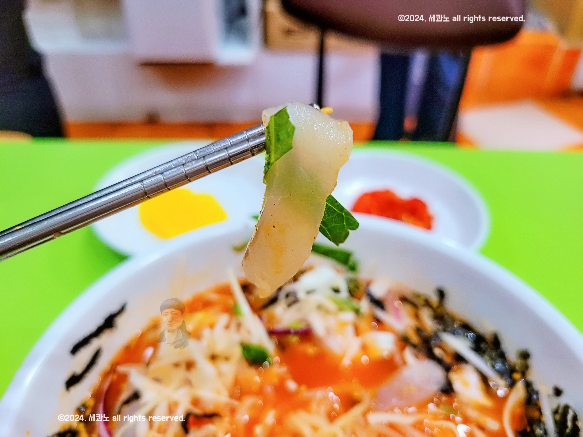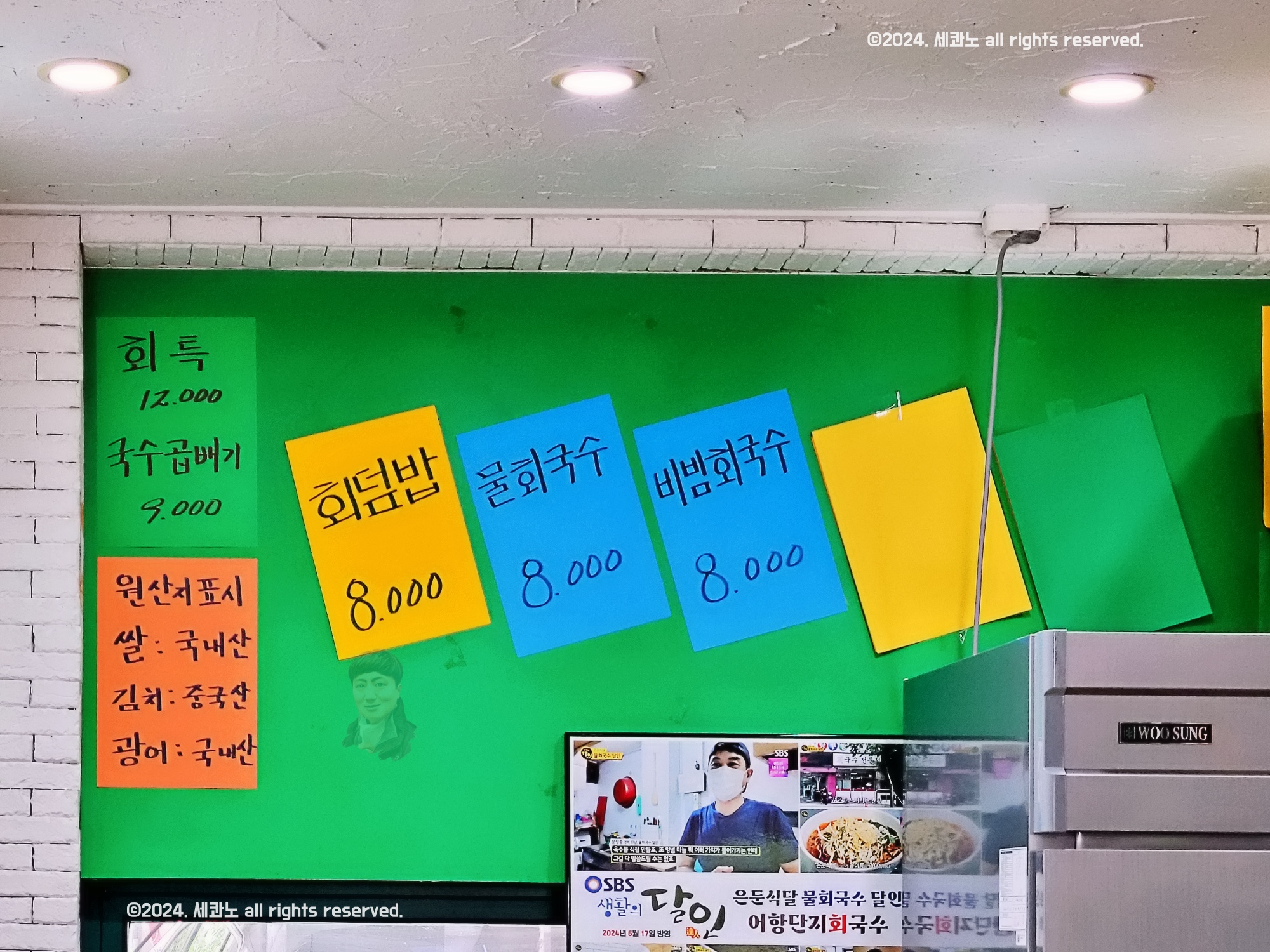 회덮밥, 물회국수, 비빔회국수 각 8,000원이며