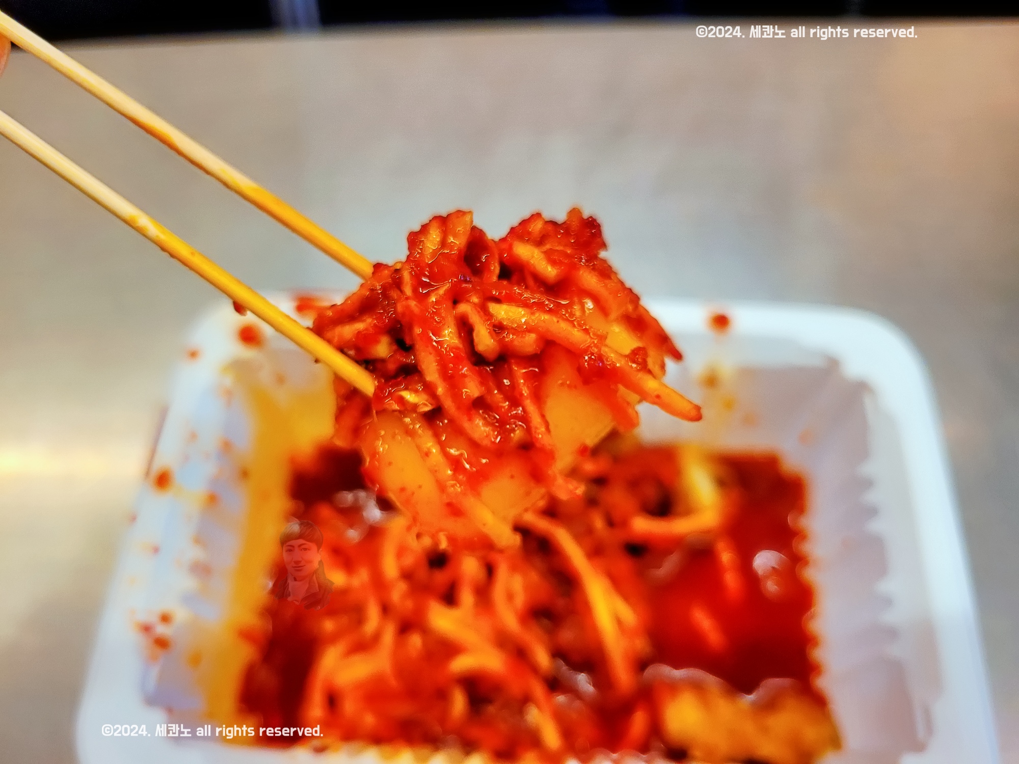 떡과 튀김 위에 무채 가득 올려 먹어주니