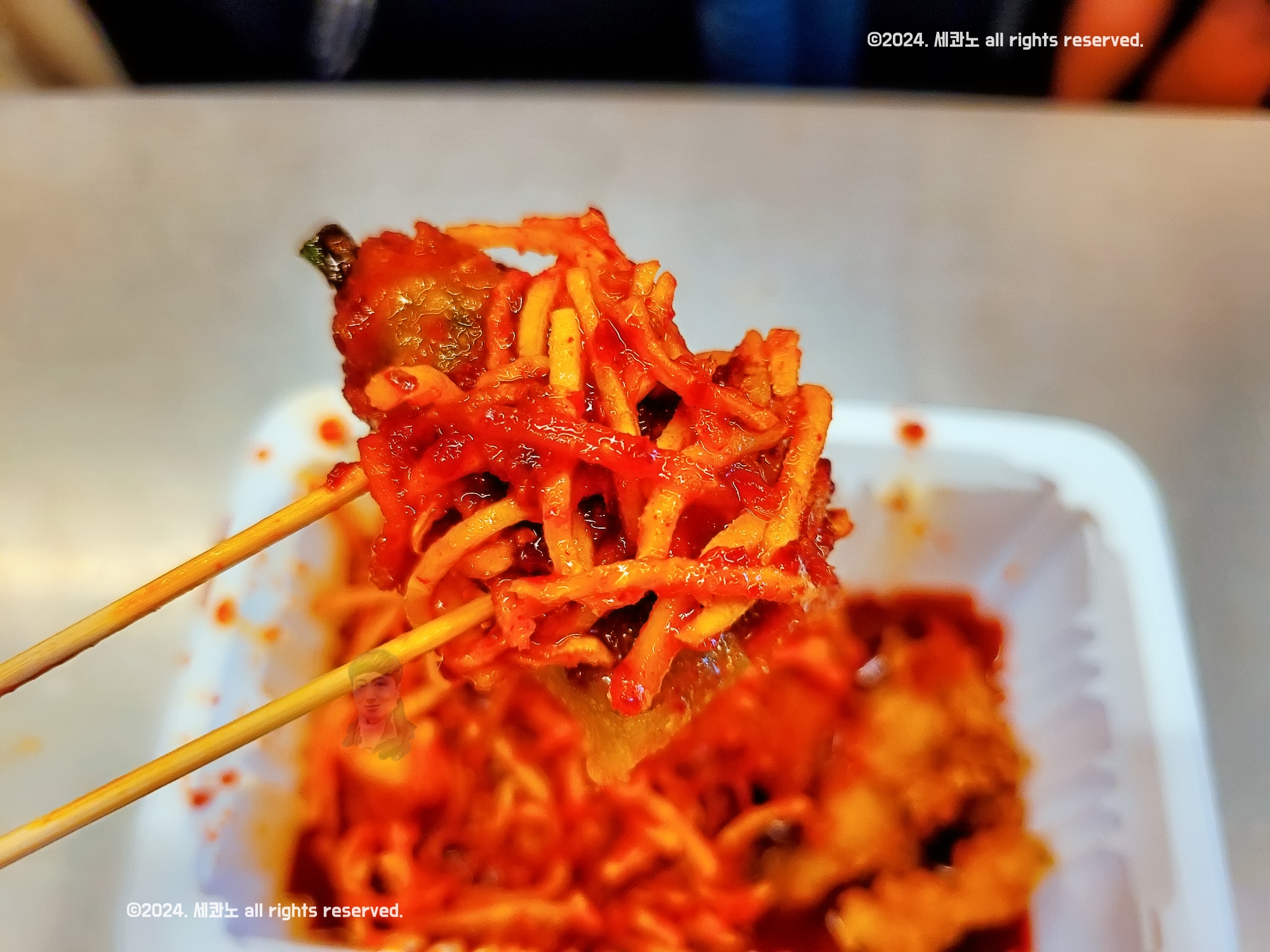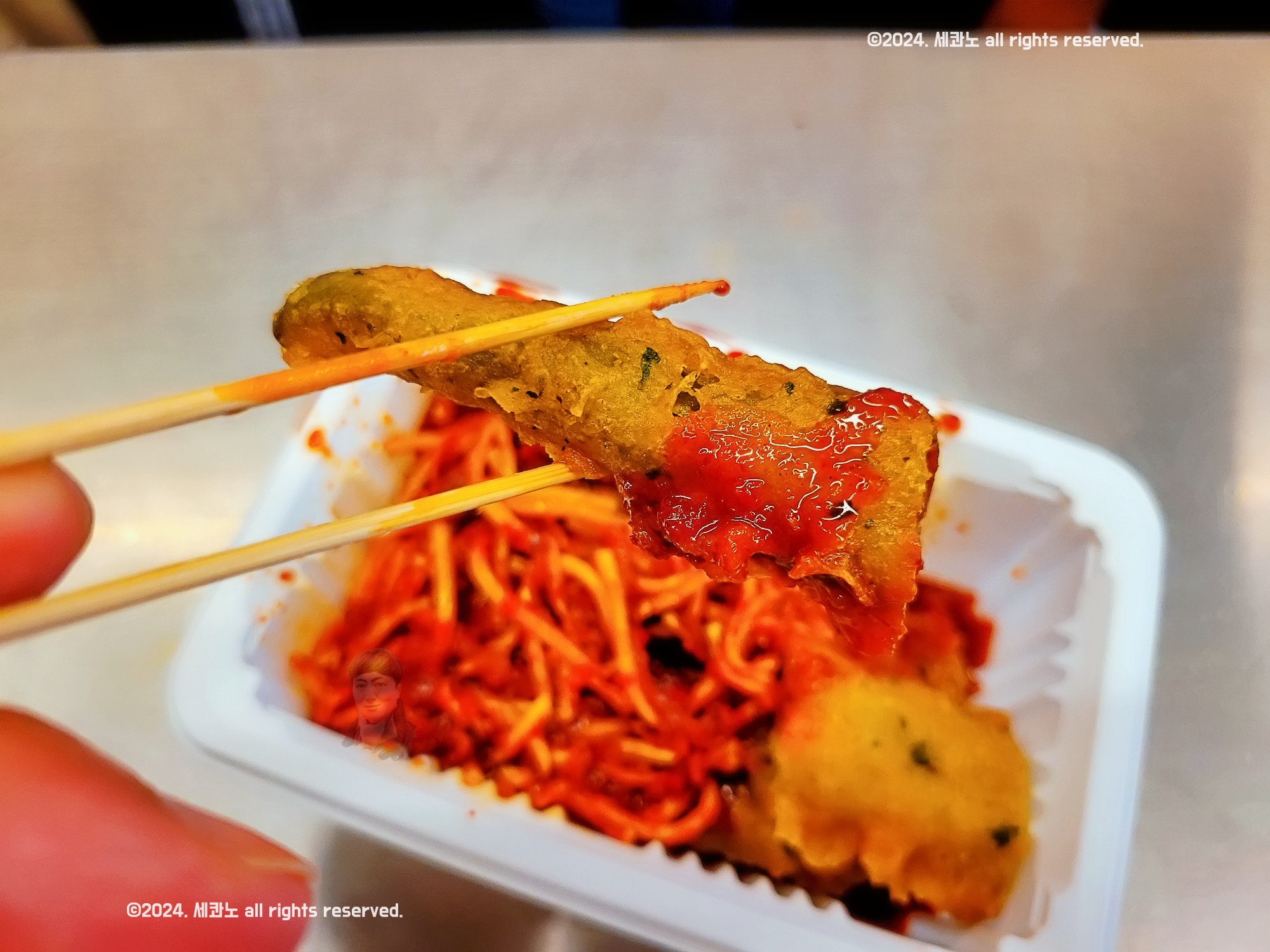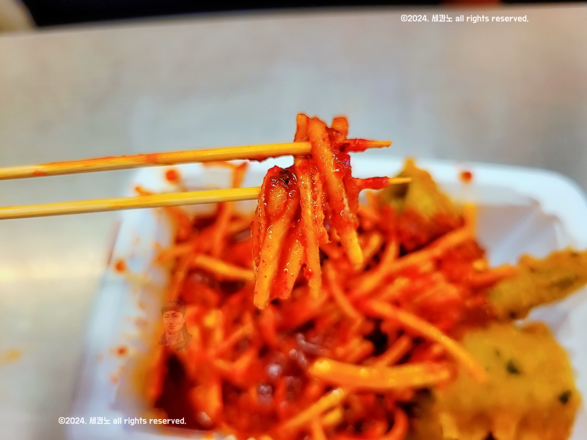 빨간 소스와 함께, 하얀 무채가 가득 쌓여 있었다.