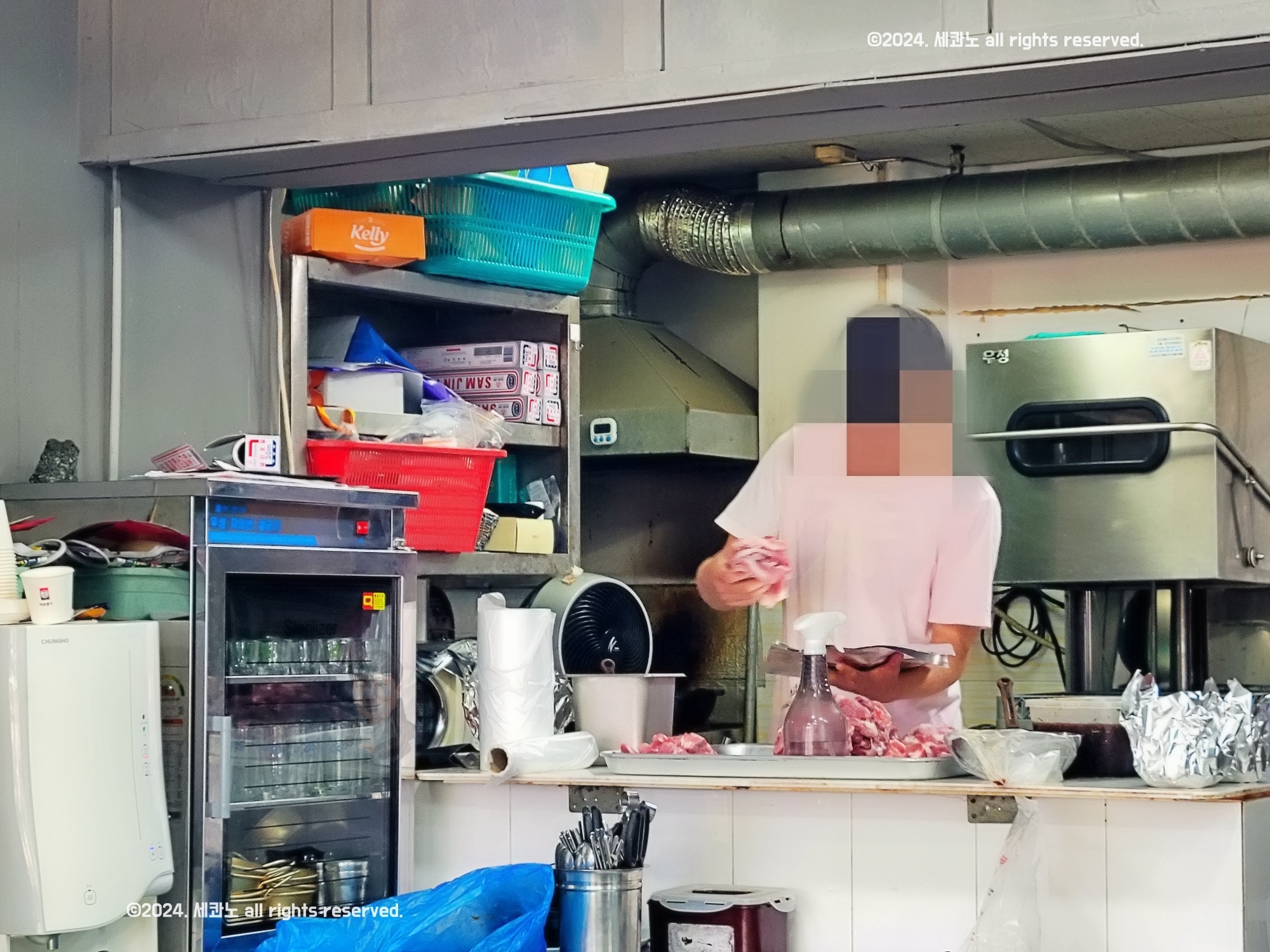 아마 저녁 장사를 위해 고기 손질 중으로 보였는 데