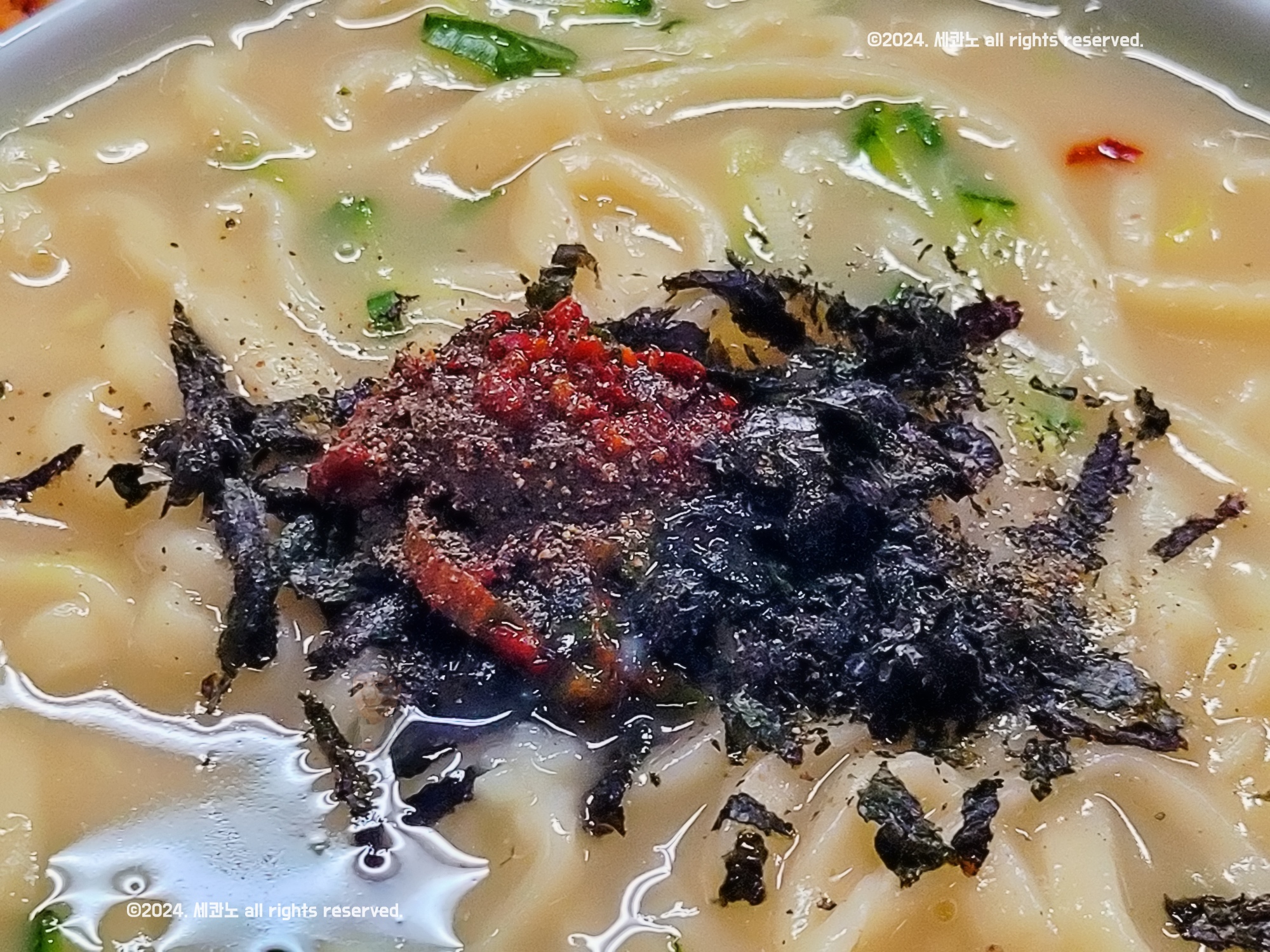 가운데 김가루, 다데기, 후추가 있다.