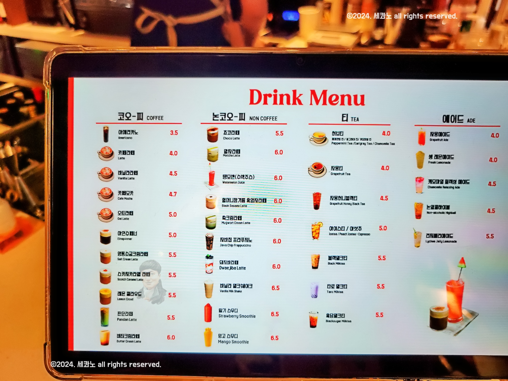 커피를 비롯한 다양한 음료 메뉴가 있다.