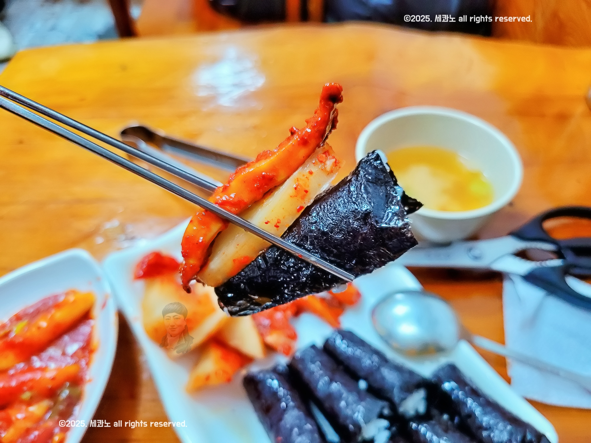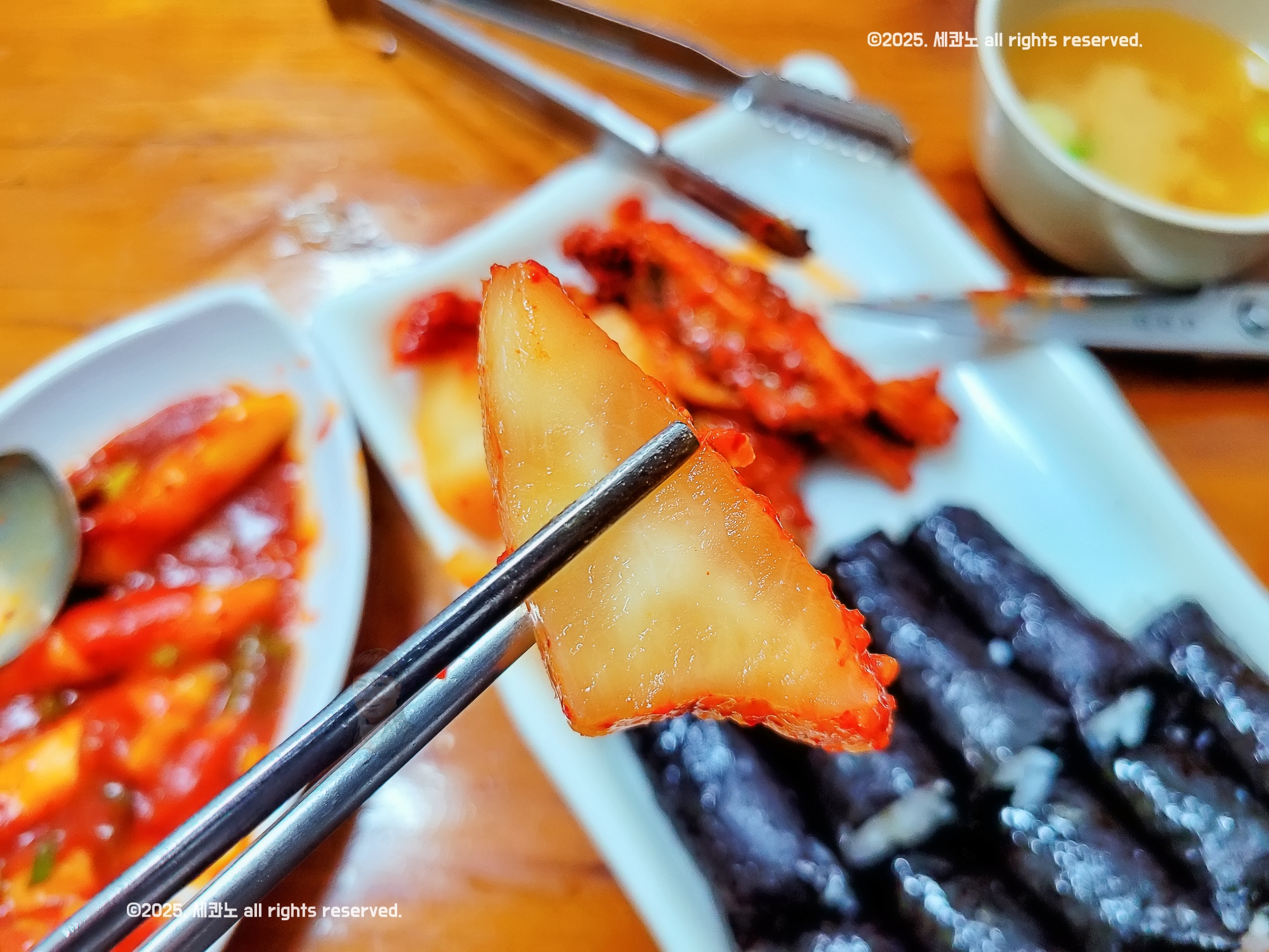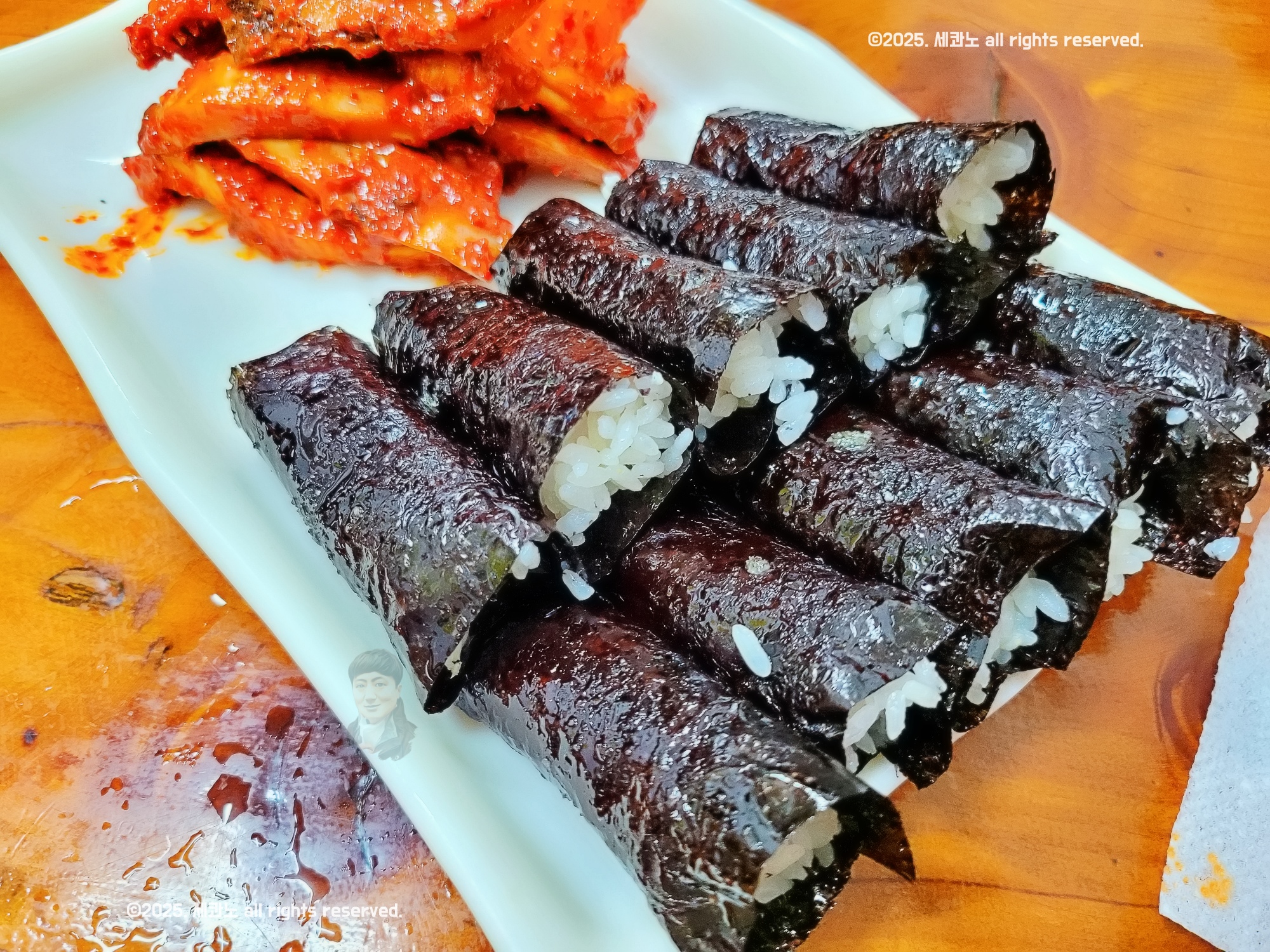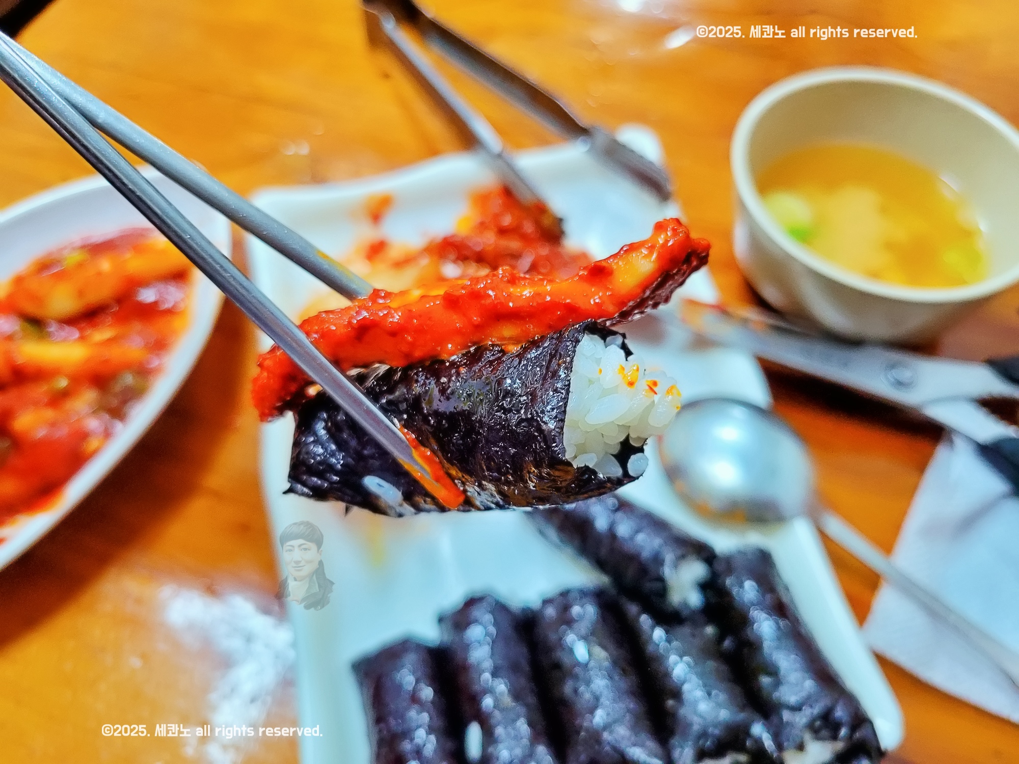 김밥에 섞박지와 오징어무침을 올려 먹다 보면 어느새 게 눈 감추듯 사라진다고.