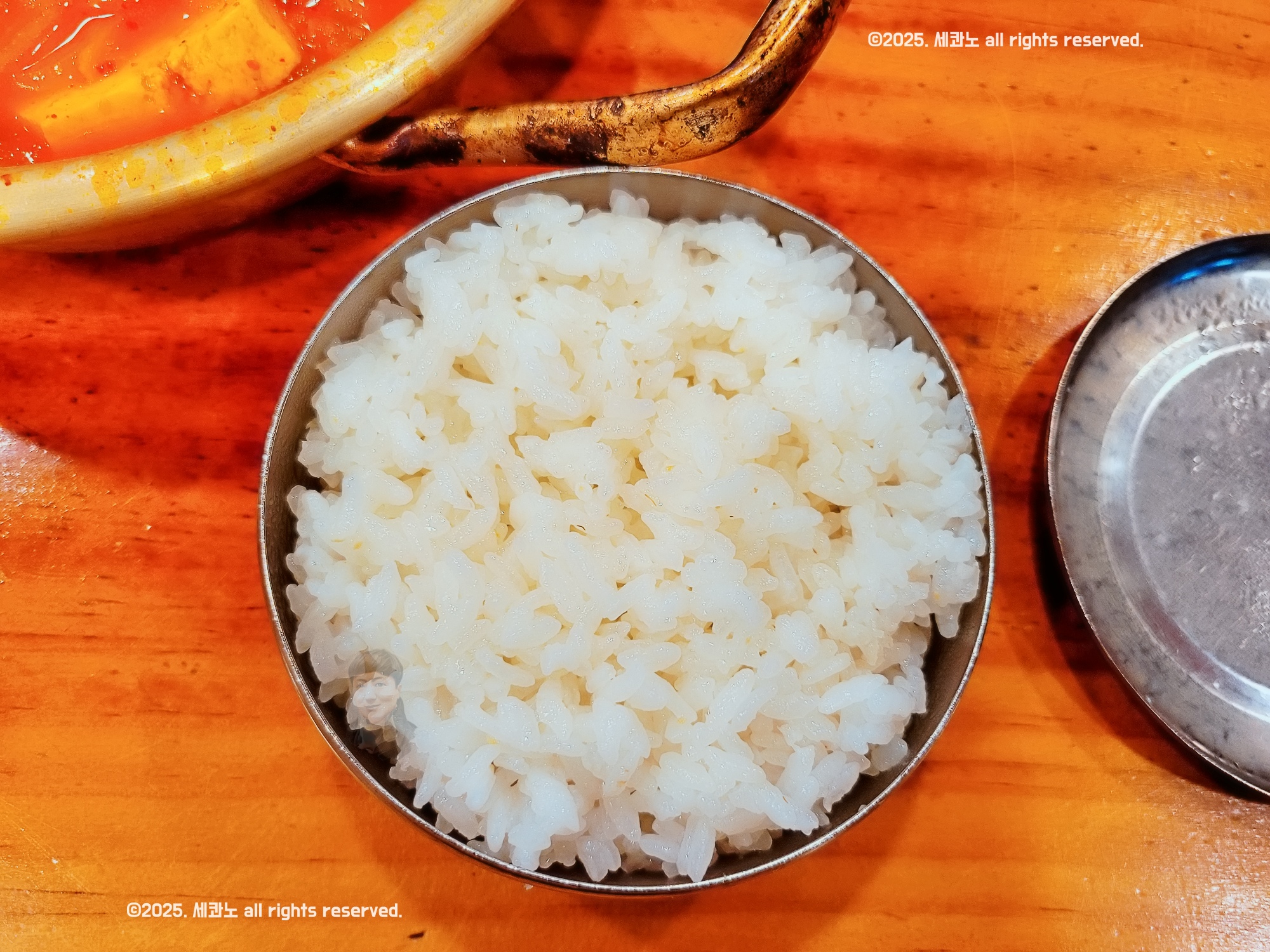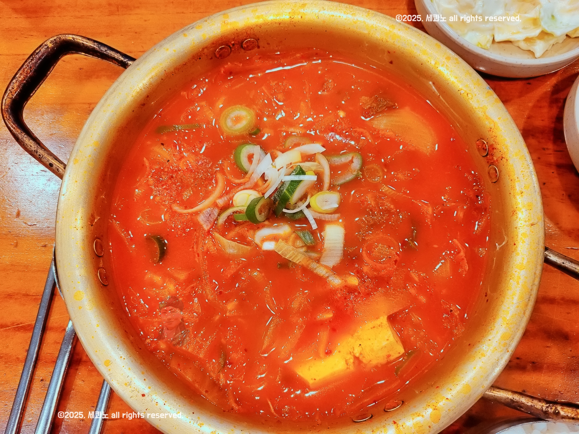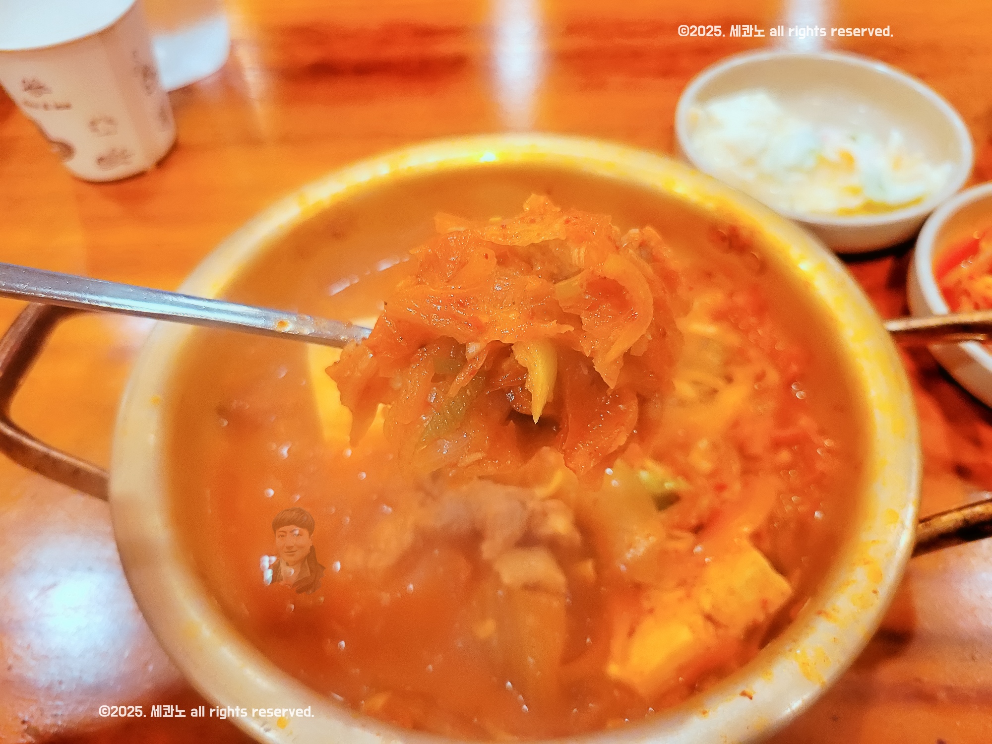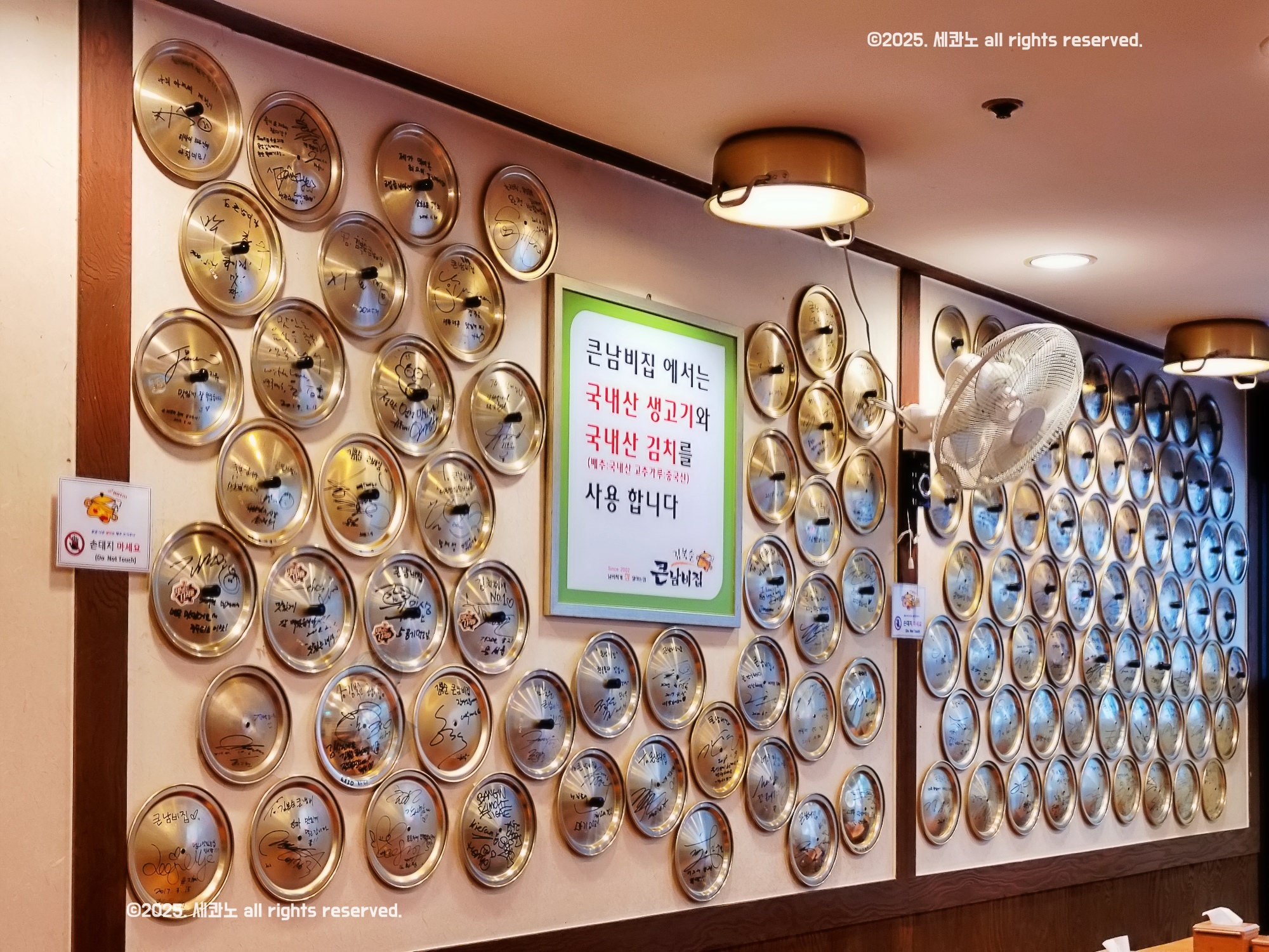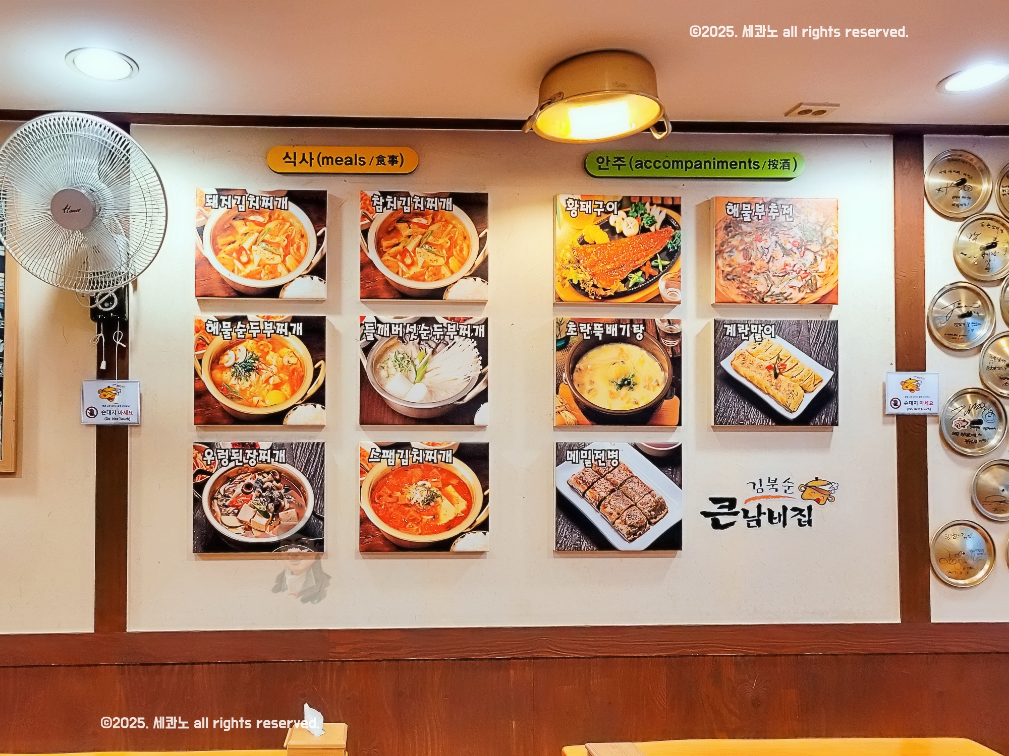 김치찌개에 벽에 냄비 뚜껑 붙어 있는 게