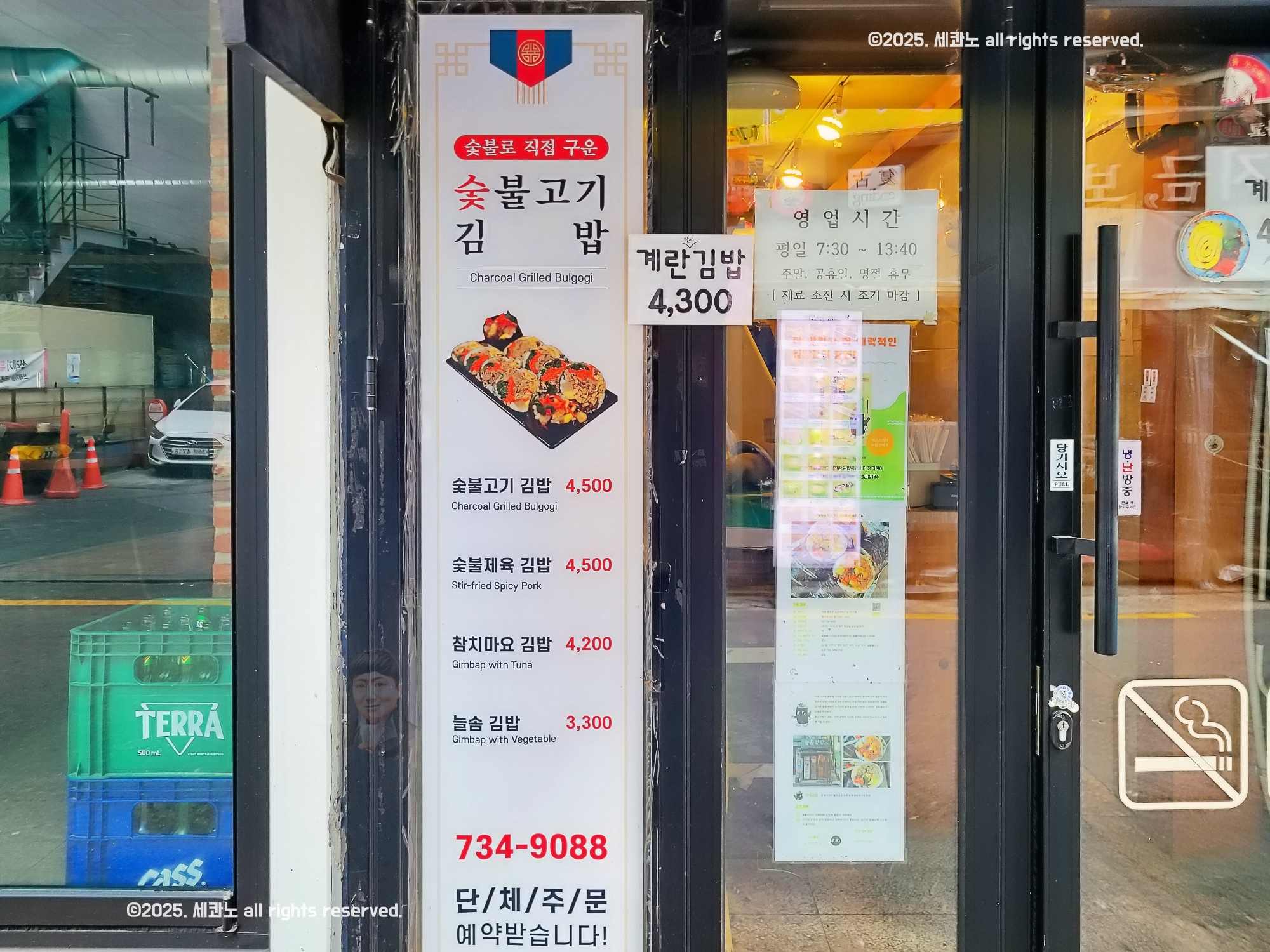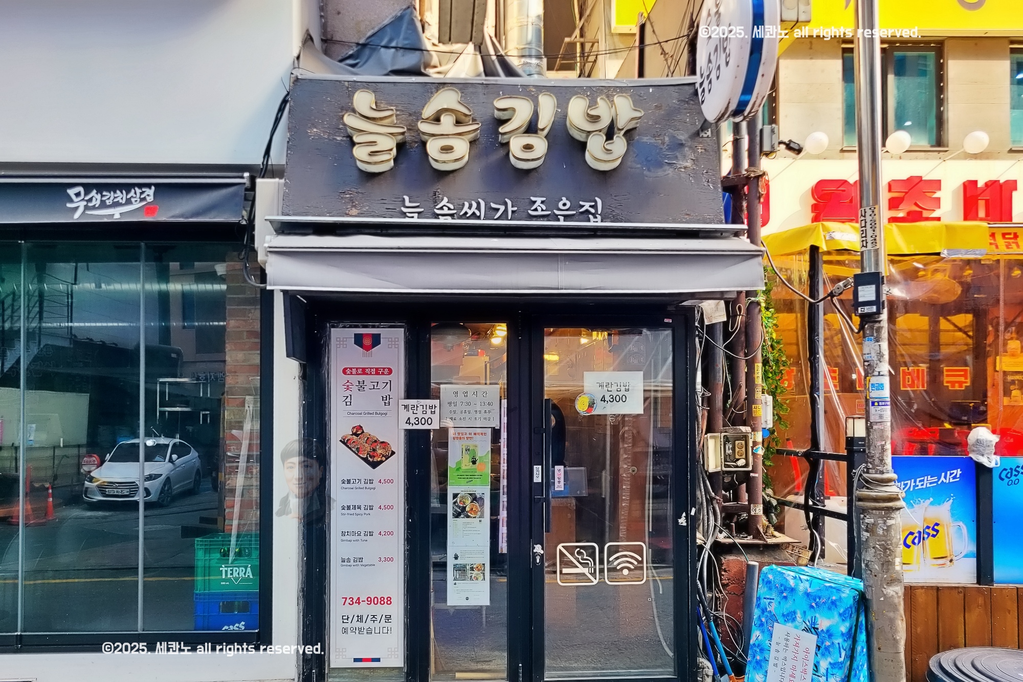 대표메뉴 : 숯불고기 김밥 4,500원. 늘솜김밥 3,300원.