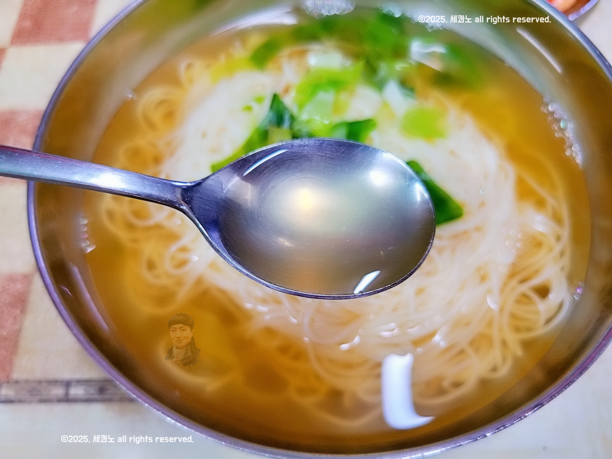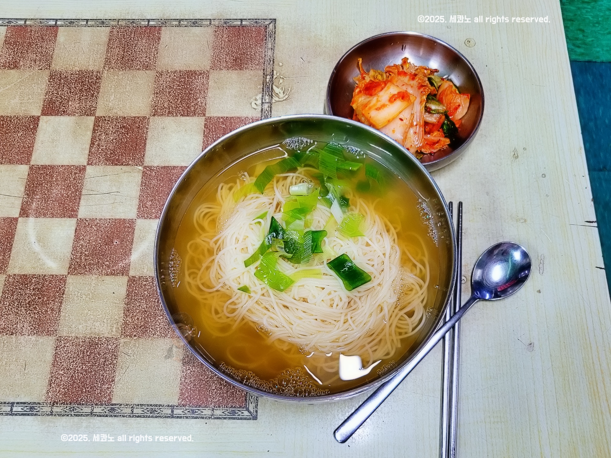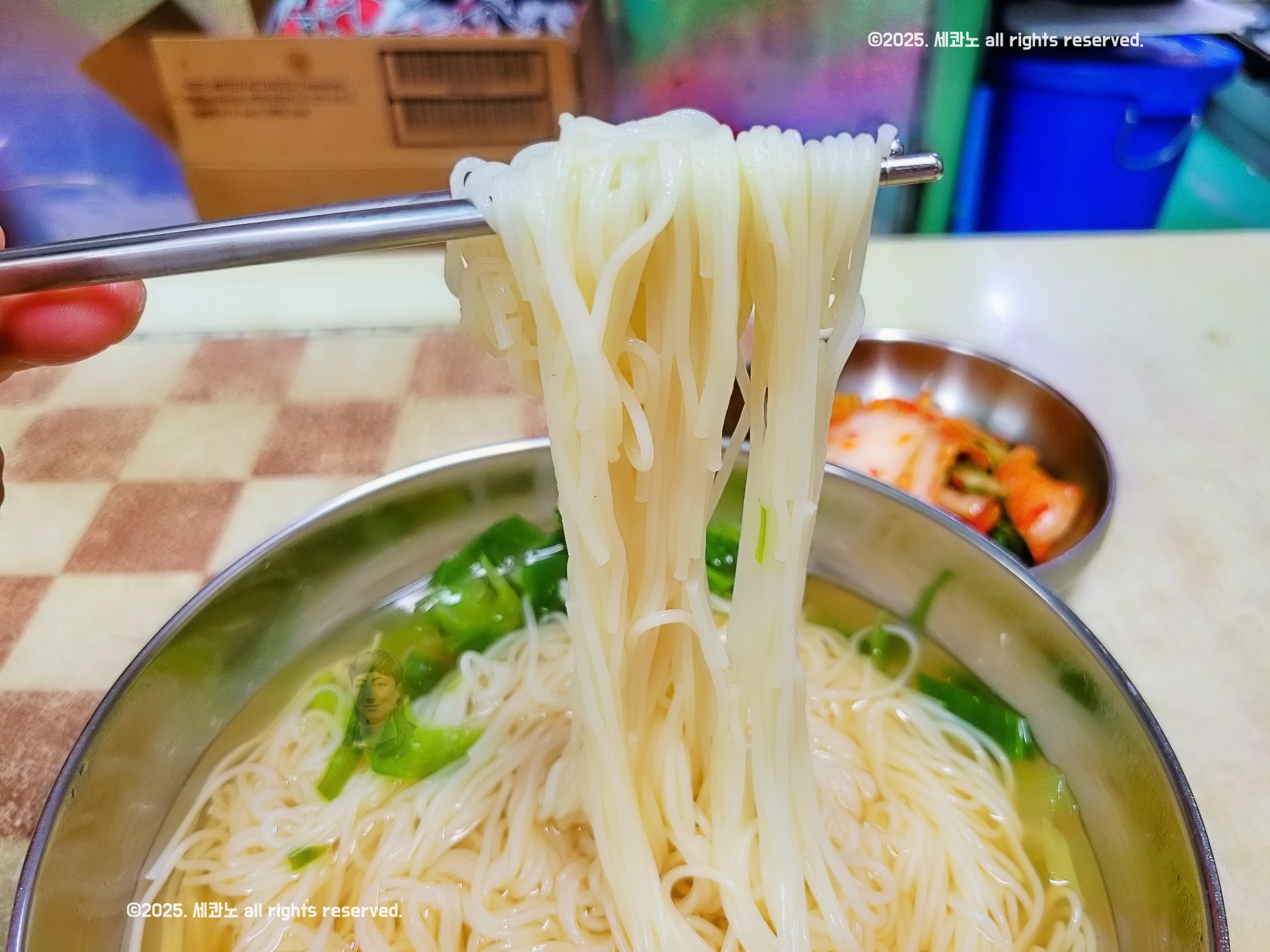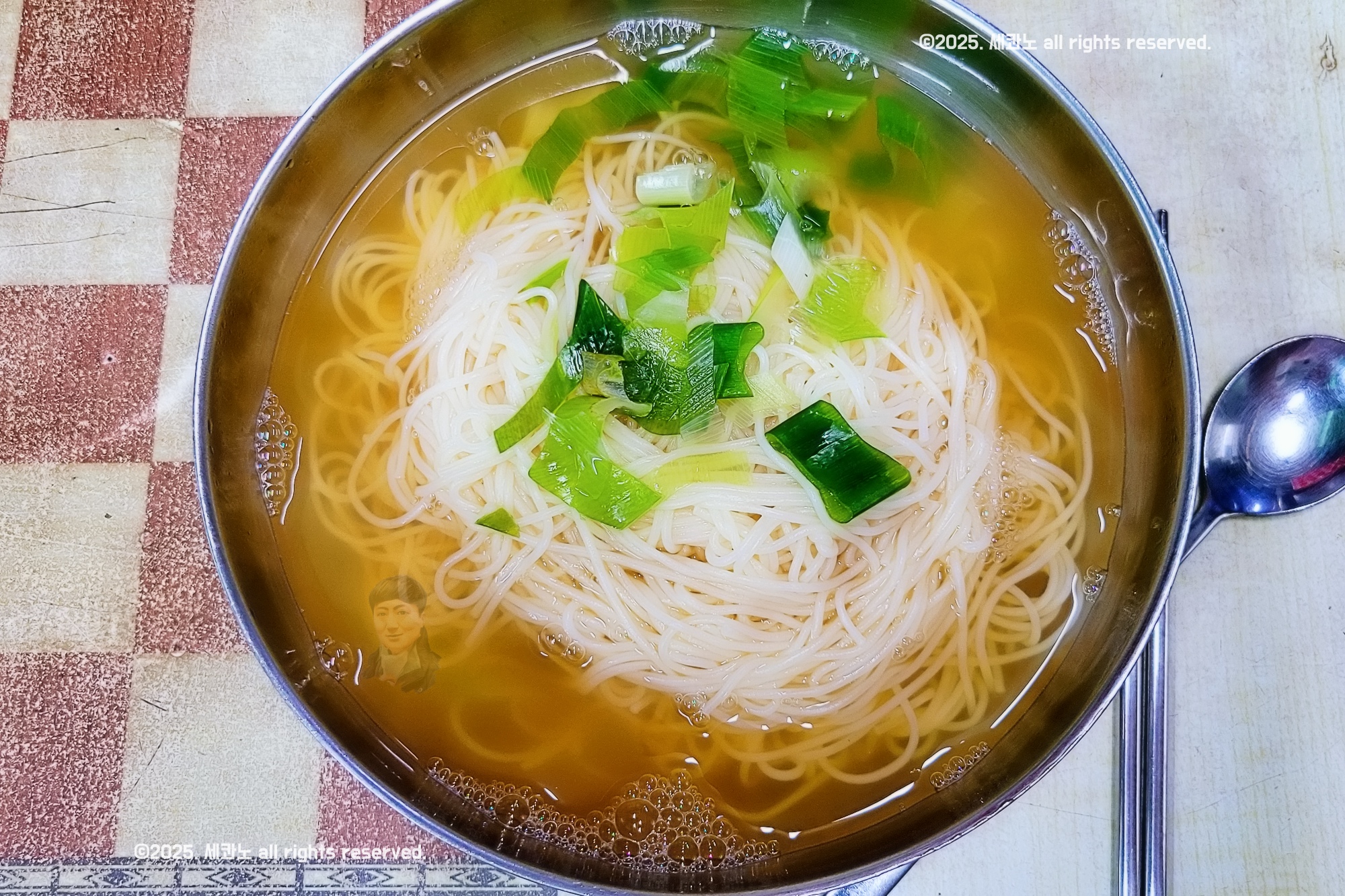 심플한 멸칫국물에 담긴 깨끗한 소면, 간단한 파 고명이 전부!