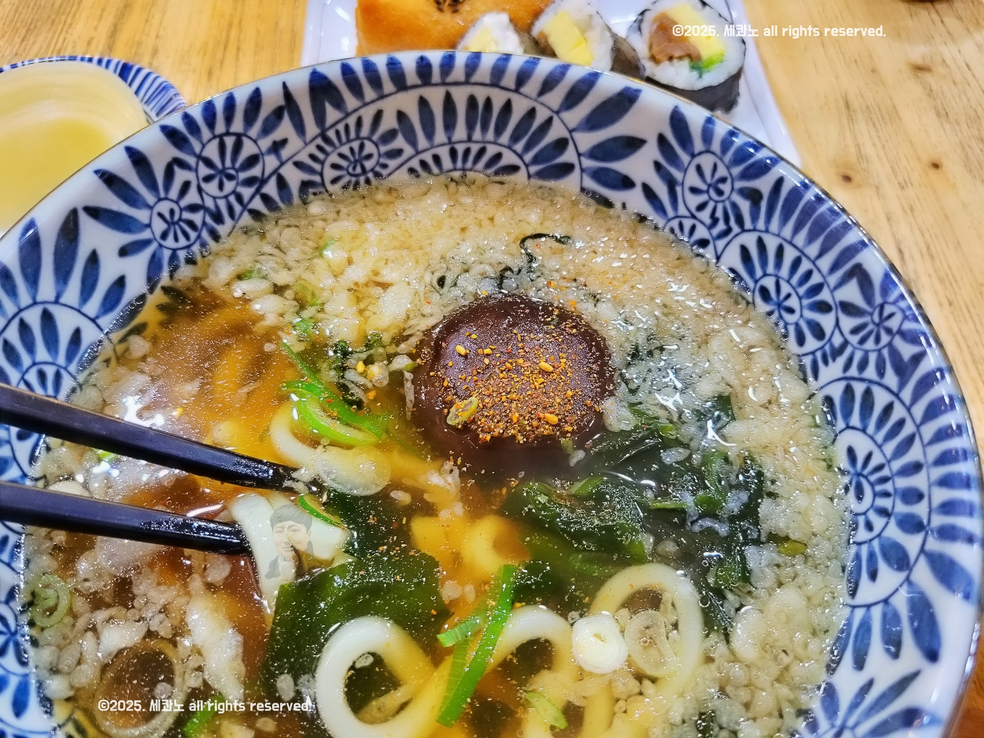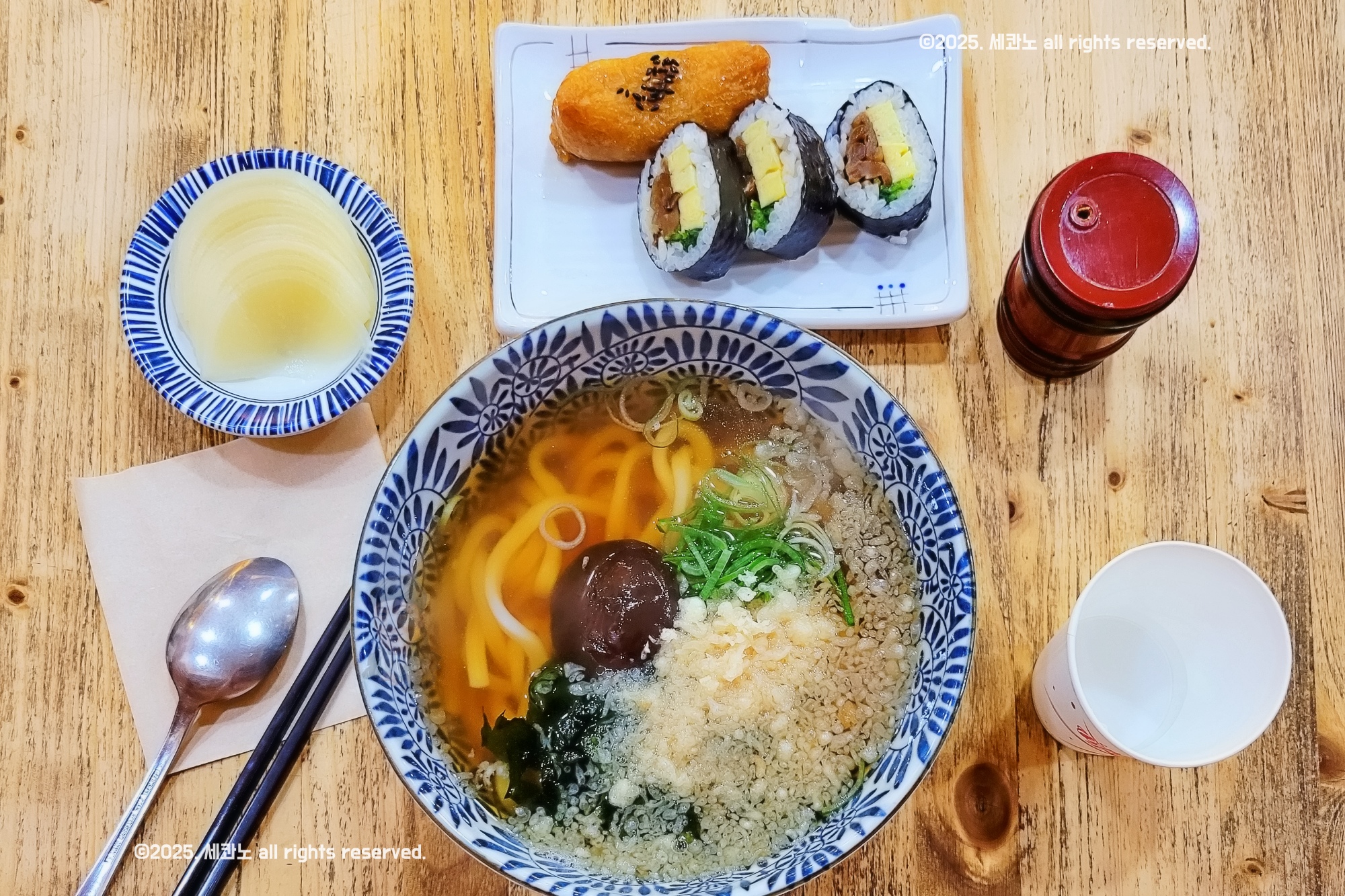 우동에 일본식 김초밥 3개, 유부토밥 1개까지 나오는 모둠.