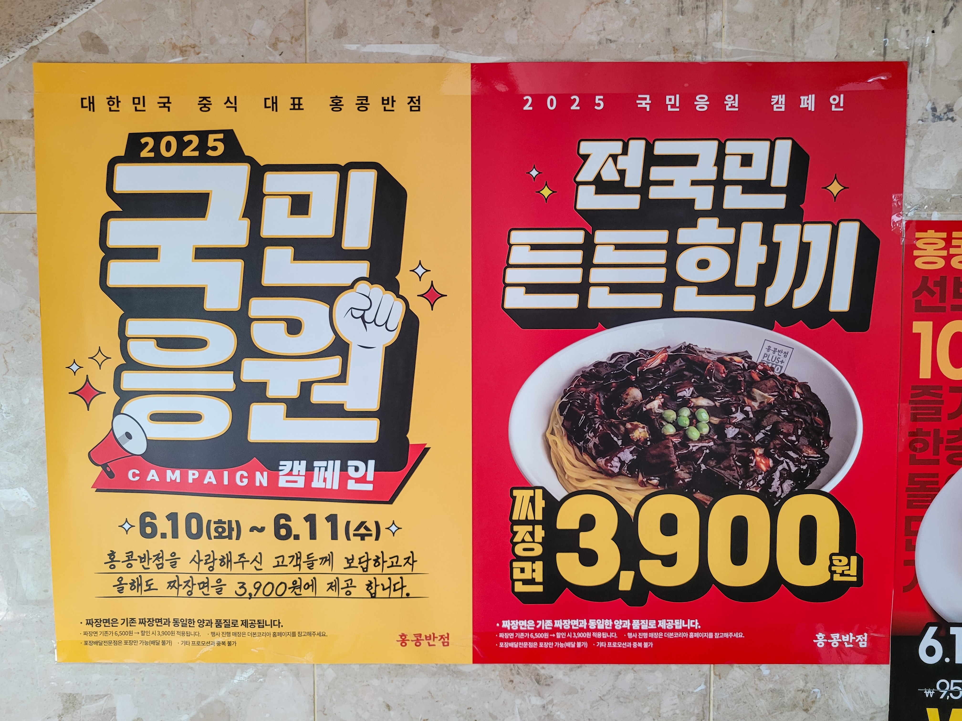빽다방만 이런 이벤트를 하는 게 아니더라고요. 홍콩반점0410에서도 6월 10일, 11일에 짜장면을 3,900원에 판매했어요. 원래 6,500원이니까 거의 40% 할인인 셈이죠.