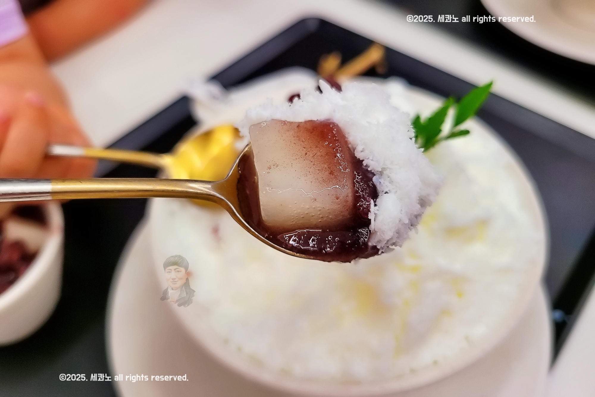 부드러운 얼음가루에 팥과 떡을 곁들이며