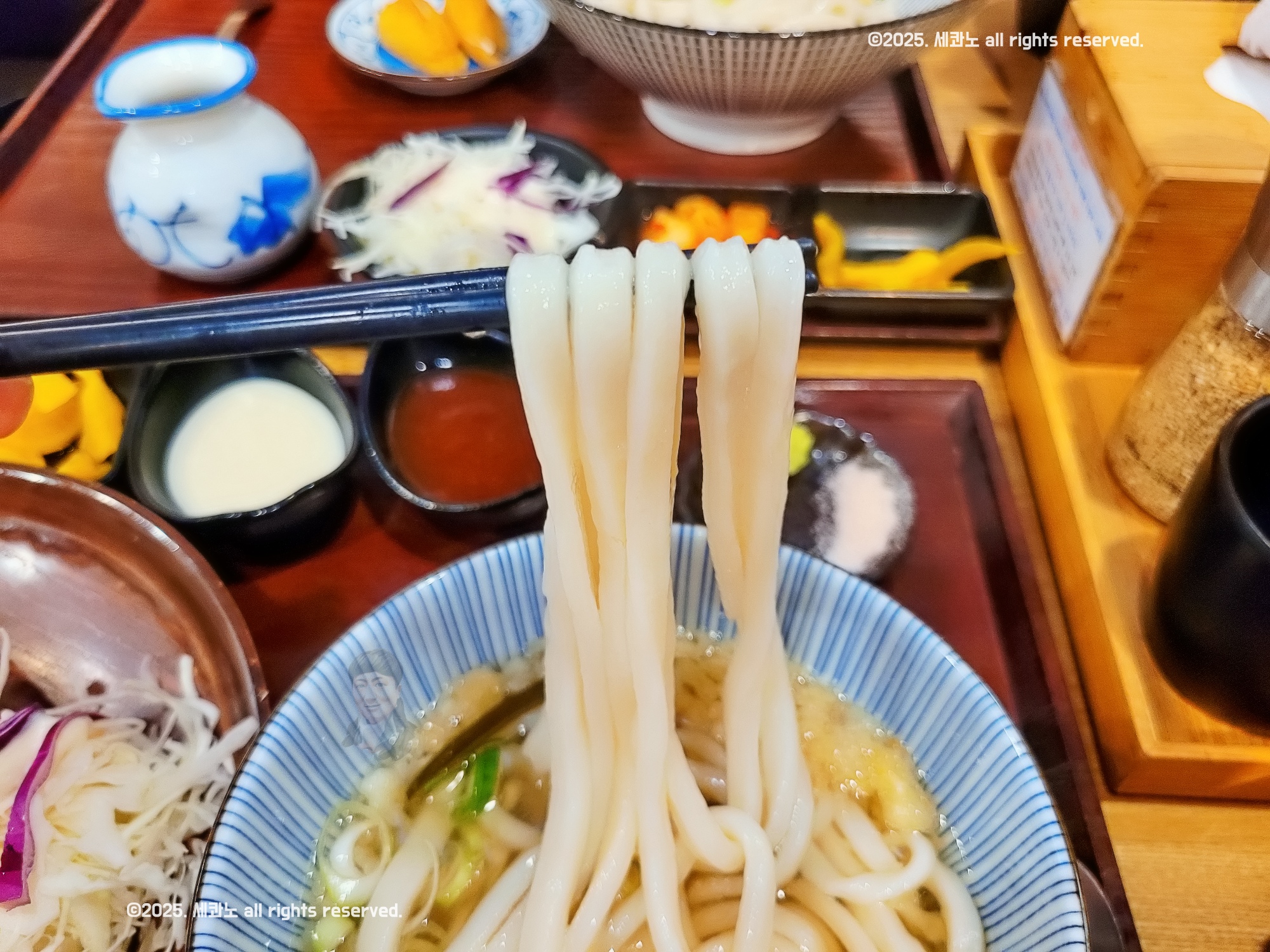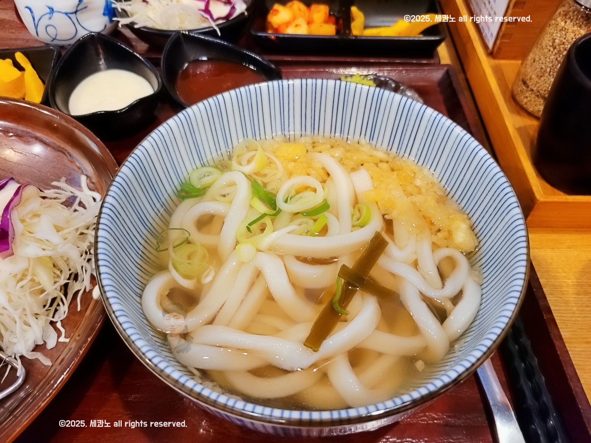 정식에 포함된 따뜻한 가케우동은 국물이 생각보다 깔끔했습니다. 진한 맛을 기대했는데 오히려 담백하고 깔끔해서 더 좋았어요. 면에 힘이 상당해서 우동 좋아하는 분들이라면 분명 만족하실 거예요.