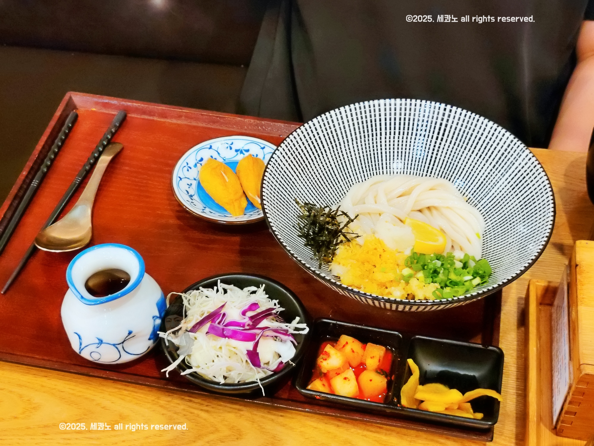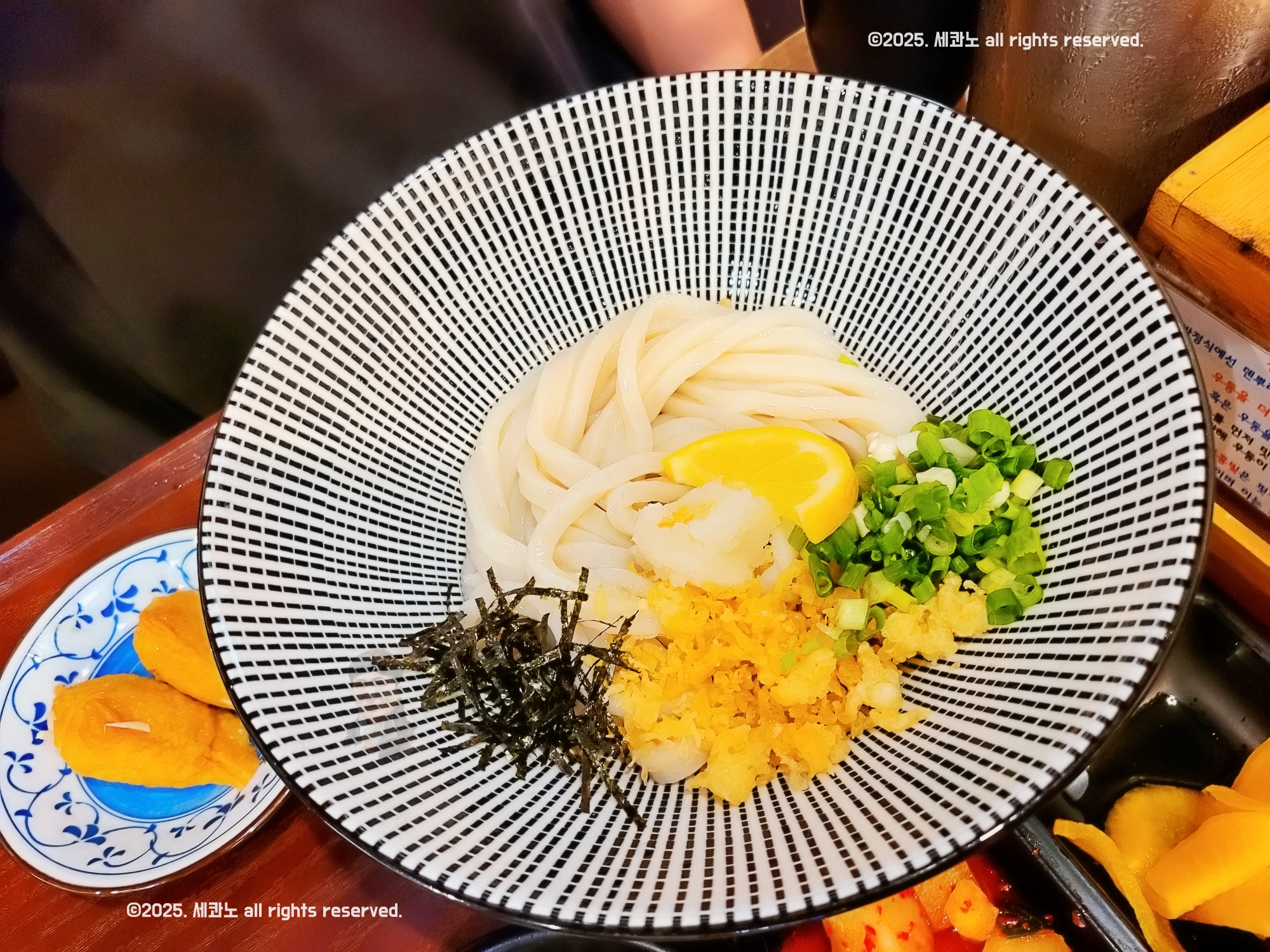 국물 없는 냉우동 스타일인 붓카케 우동이 먼저 나왔습니다. 면 위에는 김, 텐카츠(튀김가루), 파, 마늘, 간무, 레몬이 올라가 있고, 별도로 제공되는 쯔유를 부어서 비벼 먹는 방식이에요.