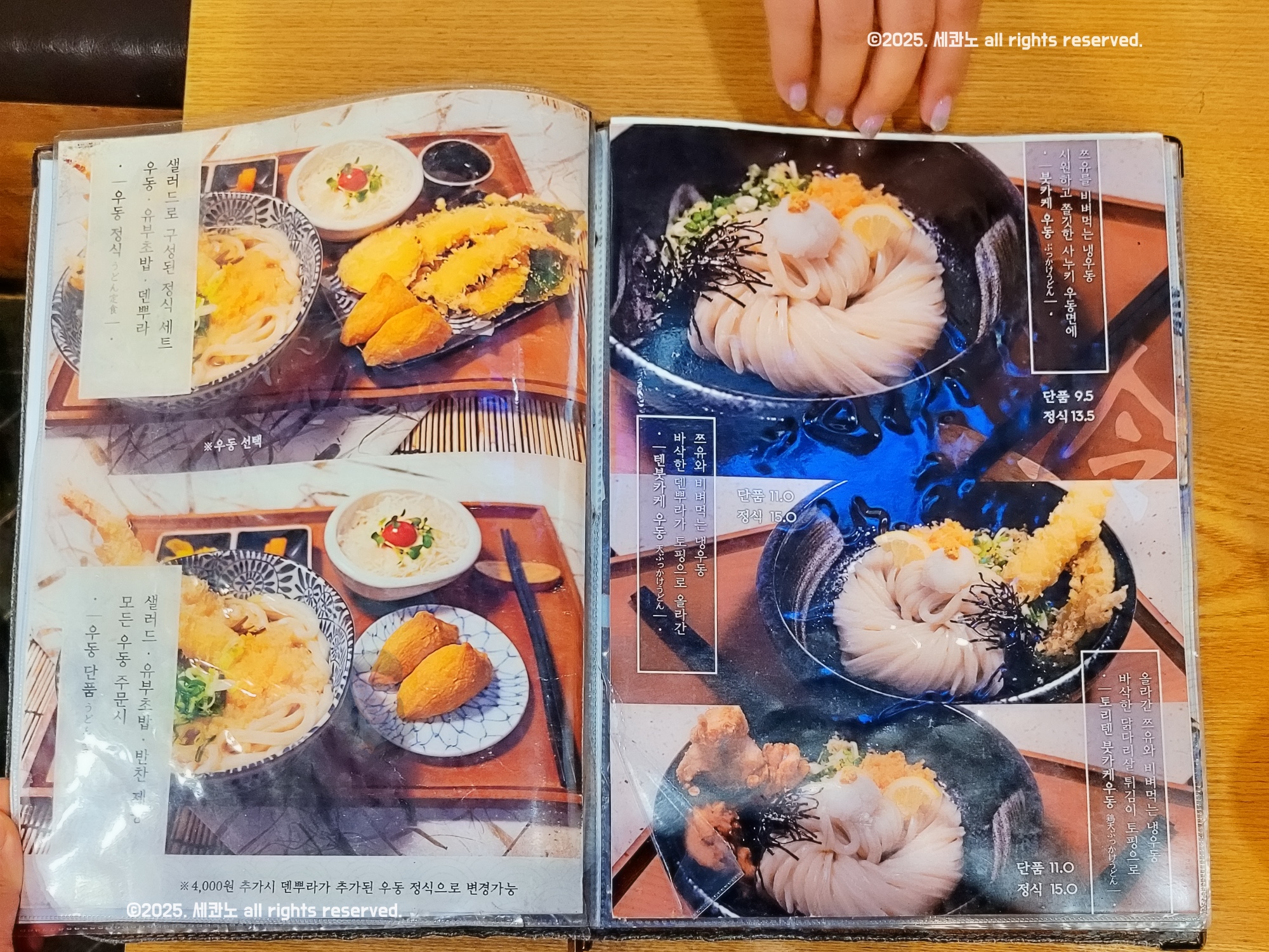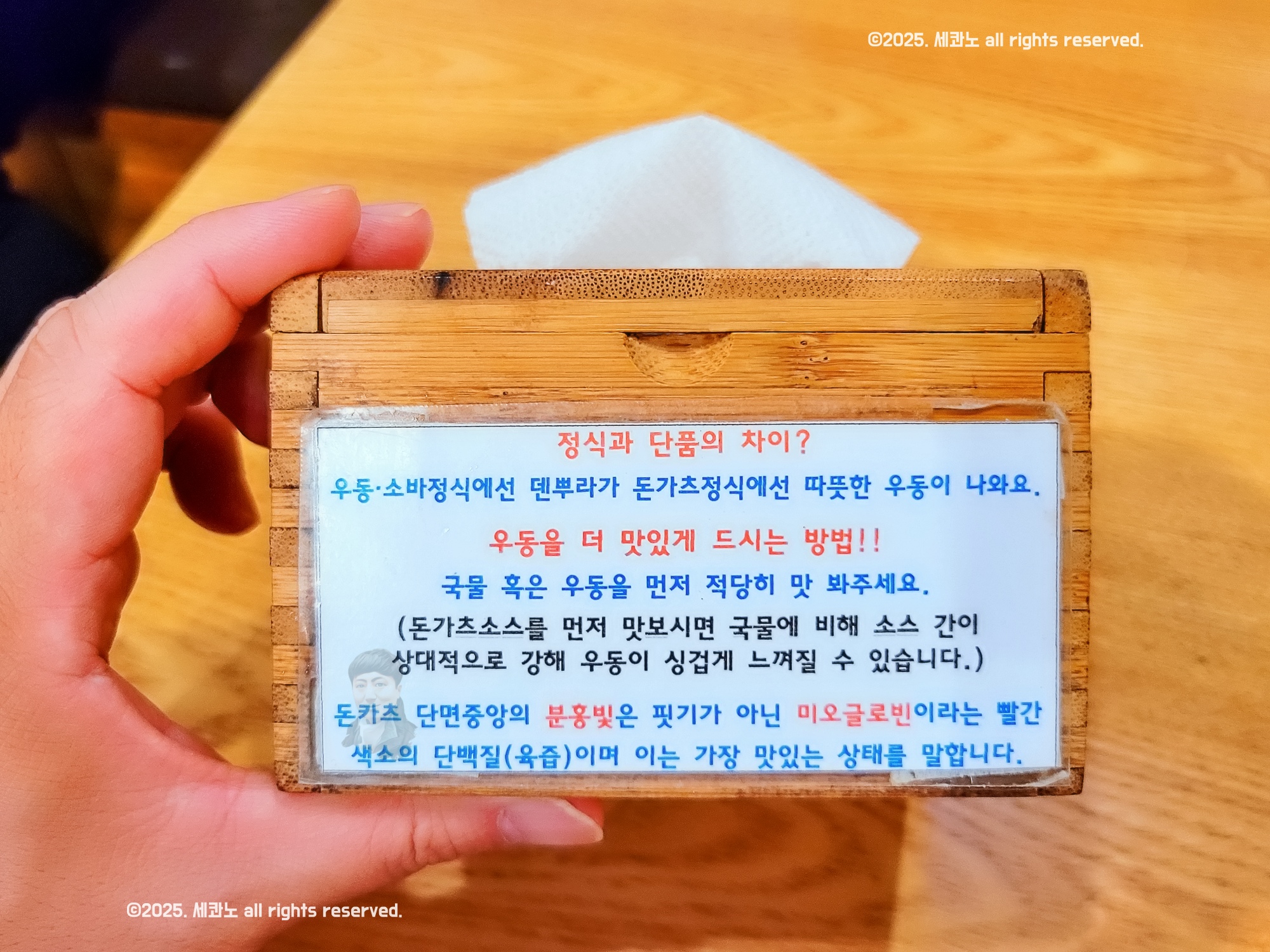 참고사항: 정식과 단품의 차이점, 우동을 더 맛있게 먹는 방법 등이 메뉴판에 친절하게 설명되어 있어서 주문할 때 도움이 됩니다.