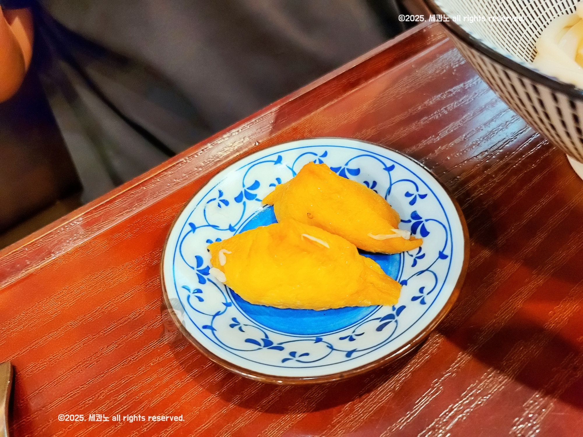 단품 우동에도 유부초밥 2개가 서비스로 제공됩니다. 한입 크기의 작은 유부초밥이지만 이런 세심한 배려가 좋더라고요. 메뉴판에는 샐러드, 유부초밥, 반찬 제공이라고 명시되어 있어요.