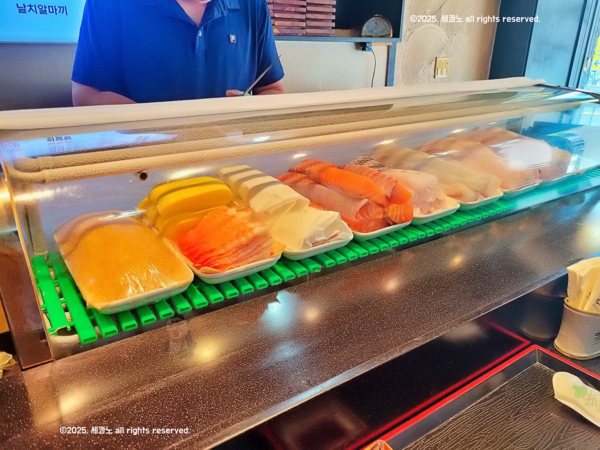 매장 입구에는 그날그날 준비된 신선한 네타들이 진열장에 예쁘게 정렬되어 있어 시각적인 만족감을 줍니다.