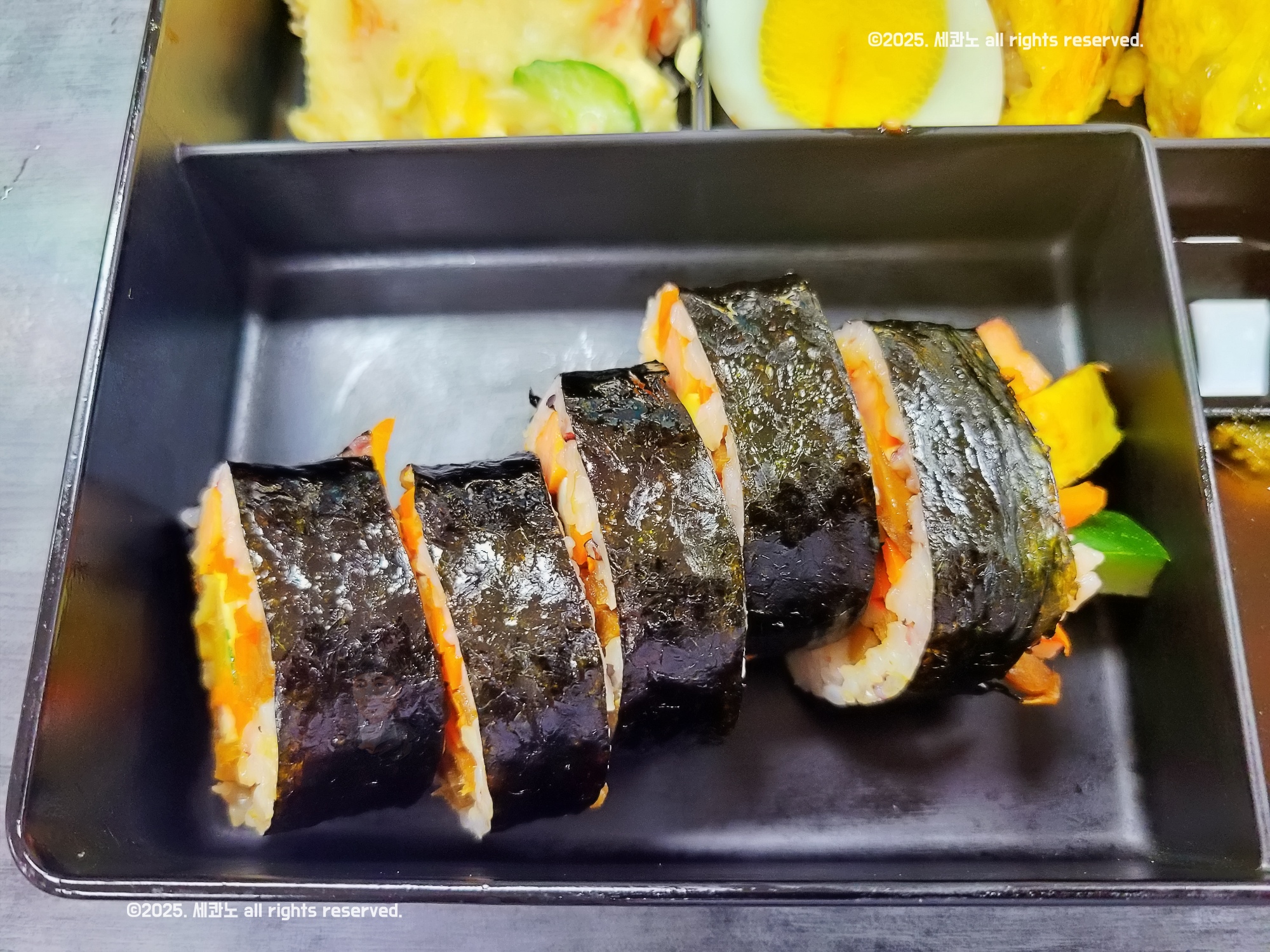 계란과 당근, 우엉, 오이, 맛살, 단무지, 어묵이 보인다.