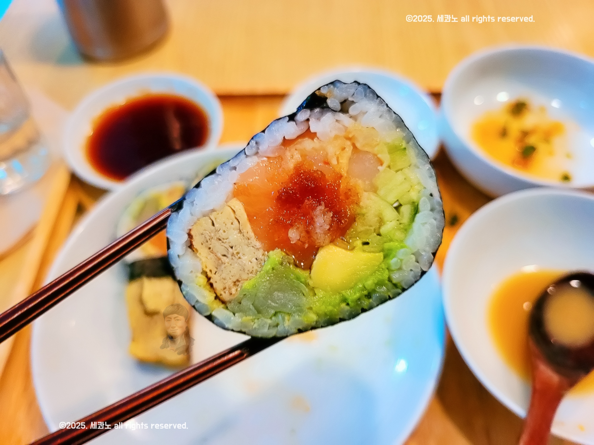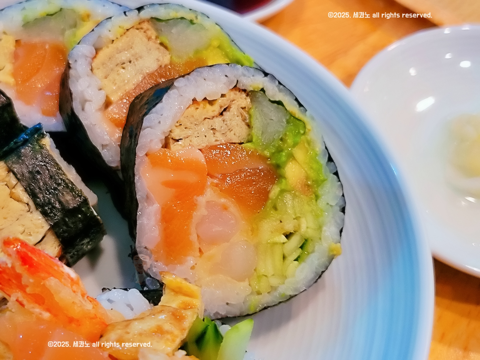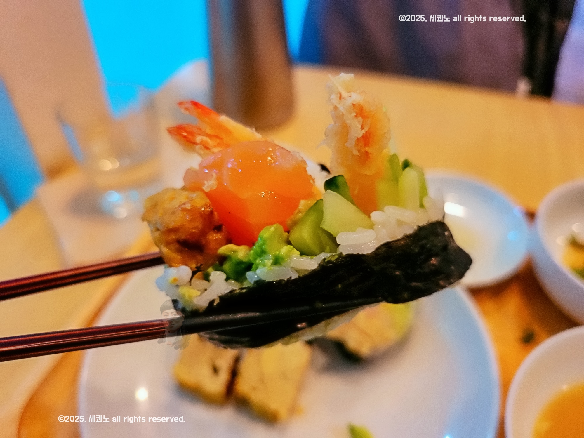 특히 신선한 연어의 부드러움, 바삭한 새우튀김의 식감, 아보카도의 크리미함, 오이의 아삭함이 한입에 다 느껴지는데 이게 전혀 어색하지 않고 자연스럽게 어우러집니다.