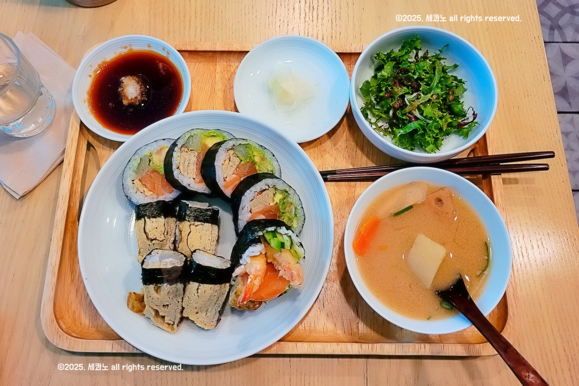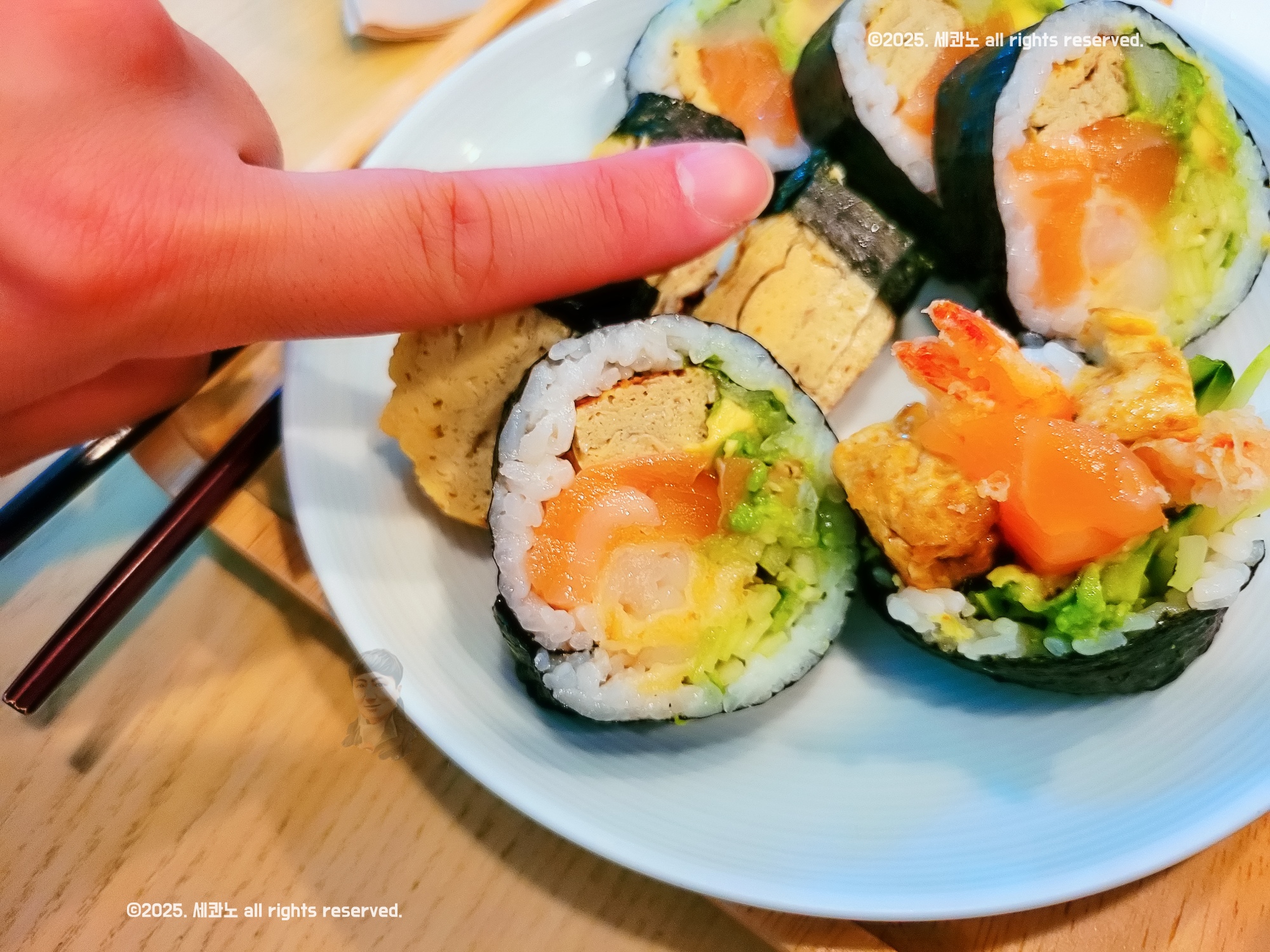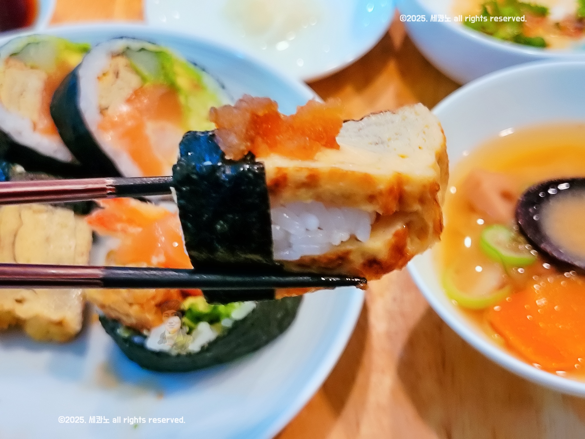특히 신선한 연어의 부드러움, 바삭한 새우튀김의 식감, 아보카도의 크리미함, 오이의 아삭함이 한입에 다 느껴지는데 이게 전혀 어색하지 않고 자연스럽게 어우러집니다.