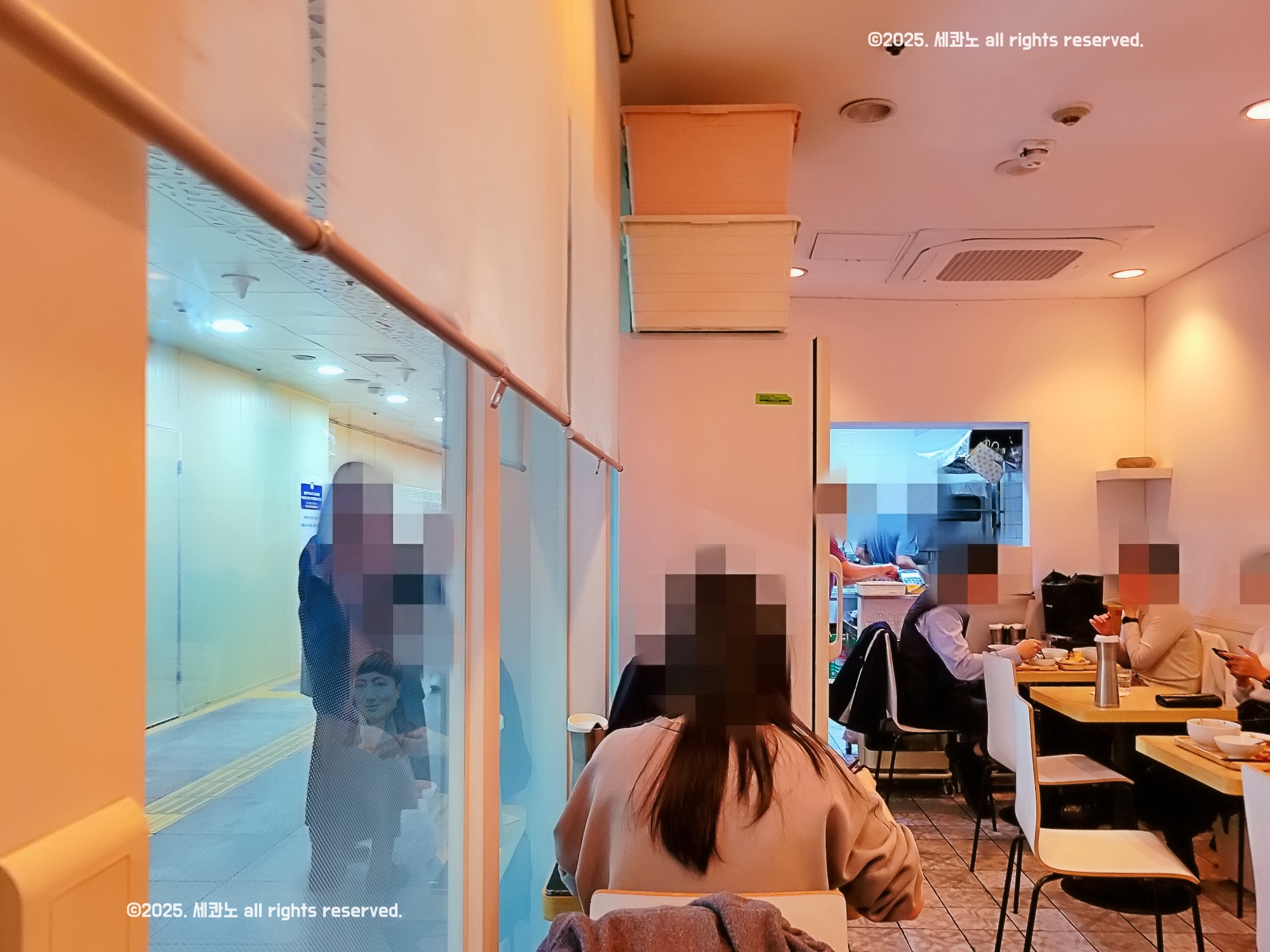 지하철 지하상가에 위치한 만큼 2인석 위주로 길쭉하게 테이블이 배치되어 있습니다. 통창 밖으로 지하상가를 지나다니는 사람들이 보이고, 중간중간 지하철이 지나갈 때 특유의 소리와 진동도 느껴져요.