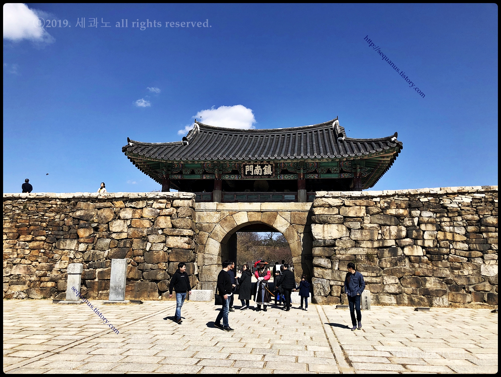 주 출입구인 진남문은 다듬어진 돌로 된 아치형 홍예문이다.