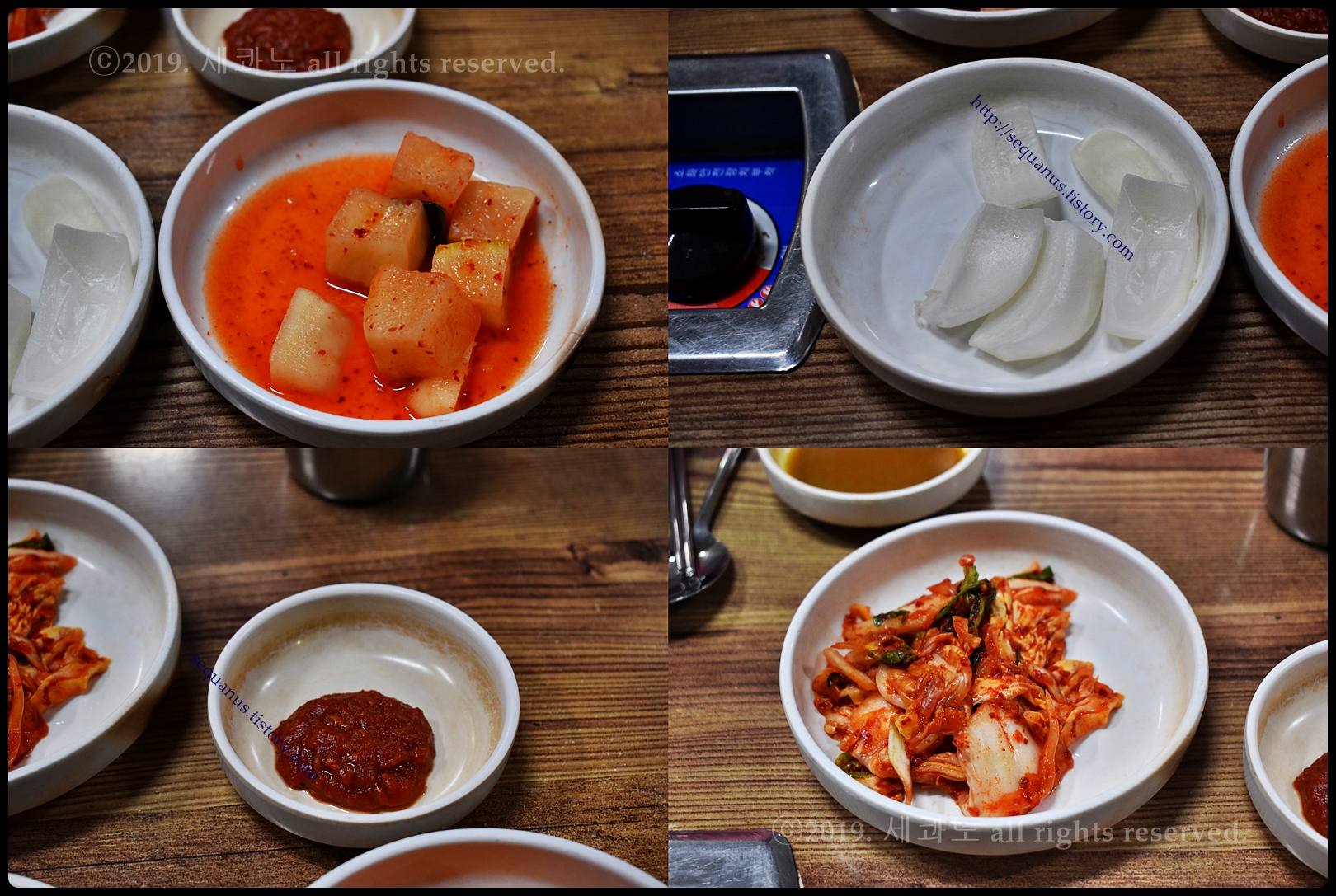 깍두기와 양파, 양파 찍어 먹을 쌈장, 그리고 배추김치