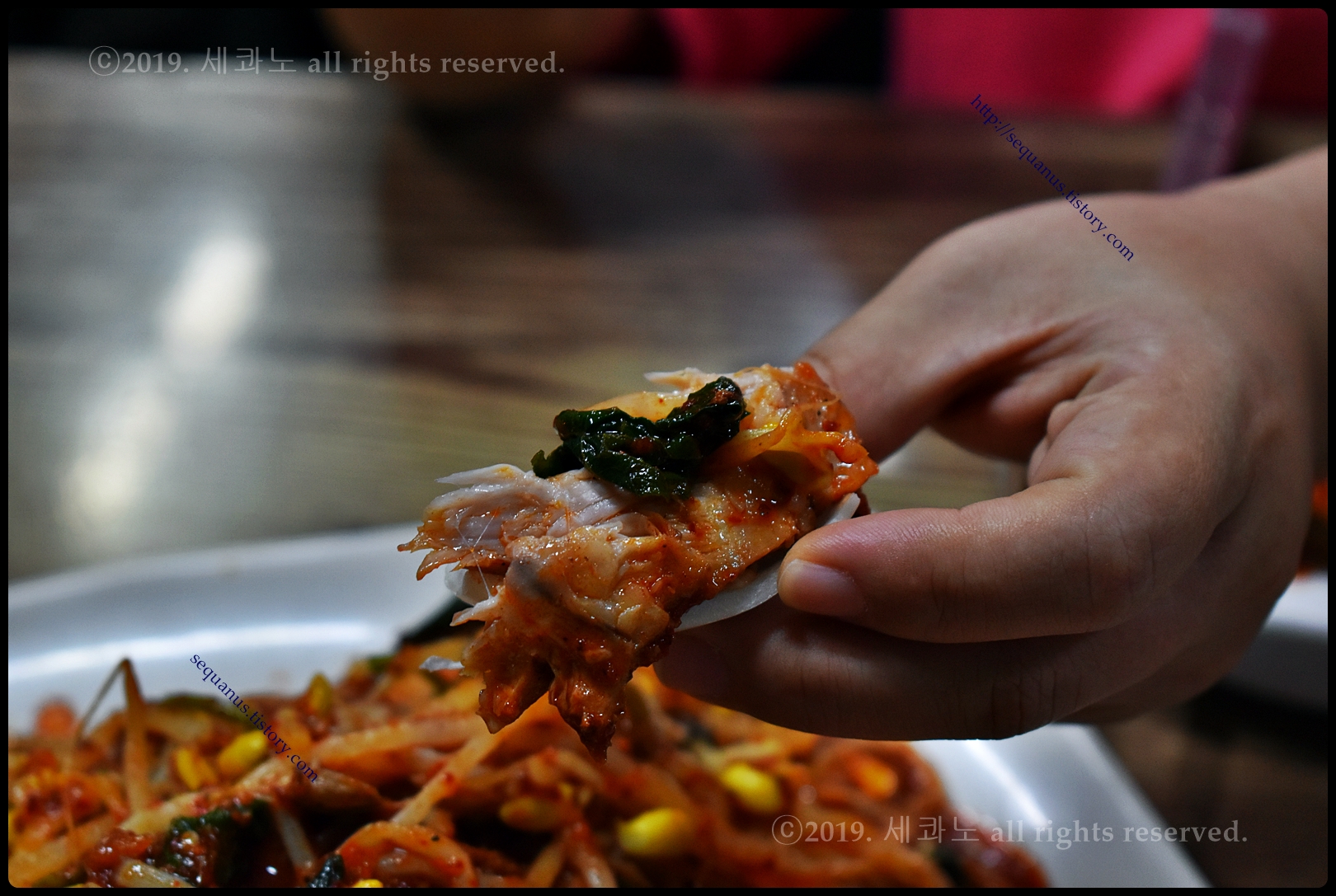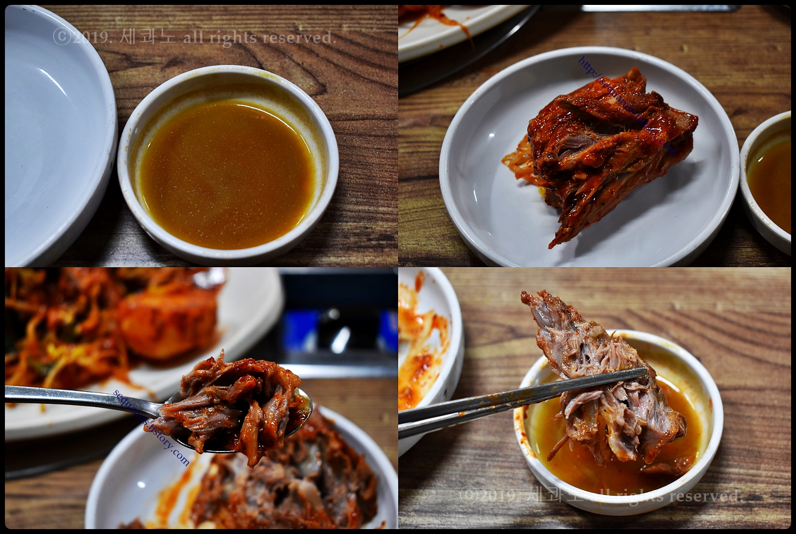 살 점 하나 잘 뜯어서 겨자 베이스 양념장 찍어 먹으면 되고