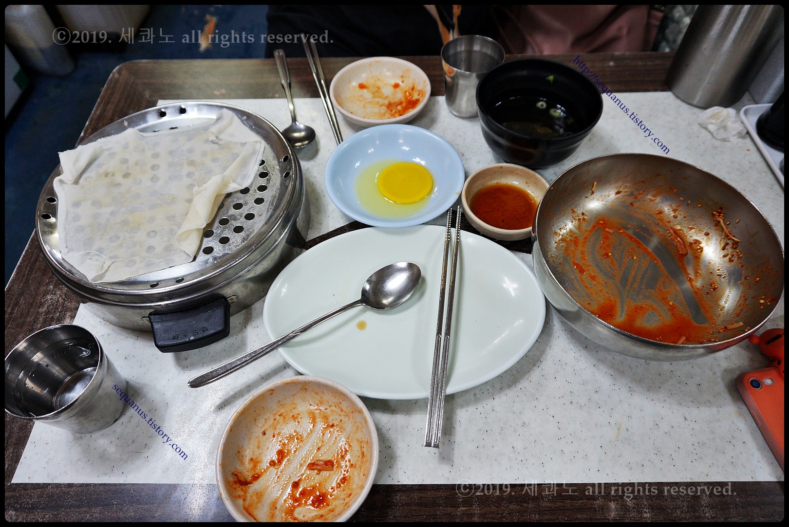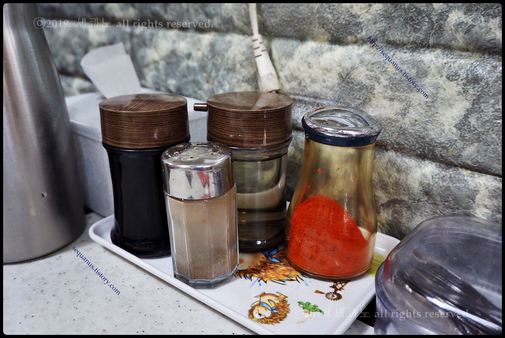테이블마다 간장, 후추, 식초, 고춧가루가 준비되어 있었다.