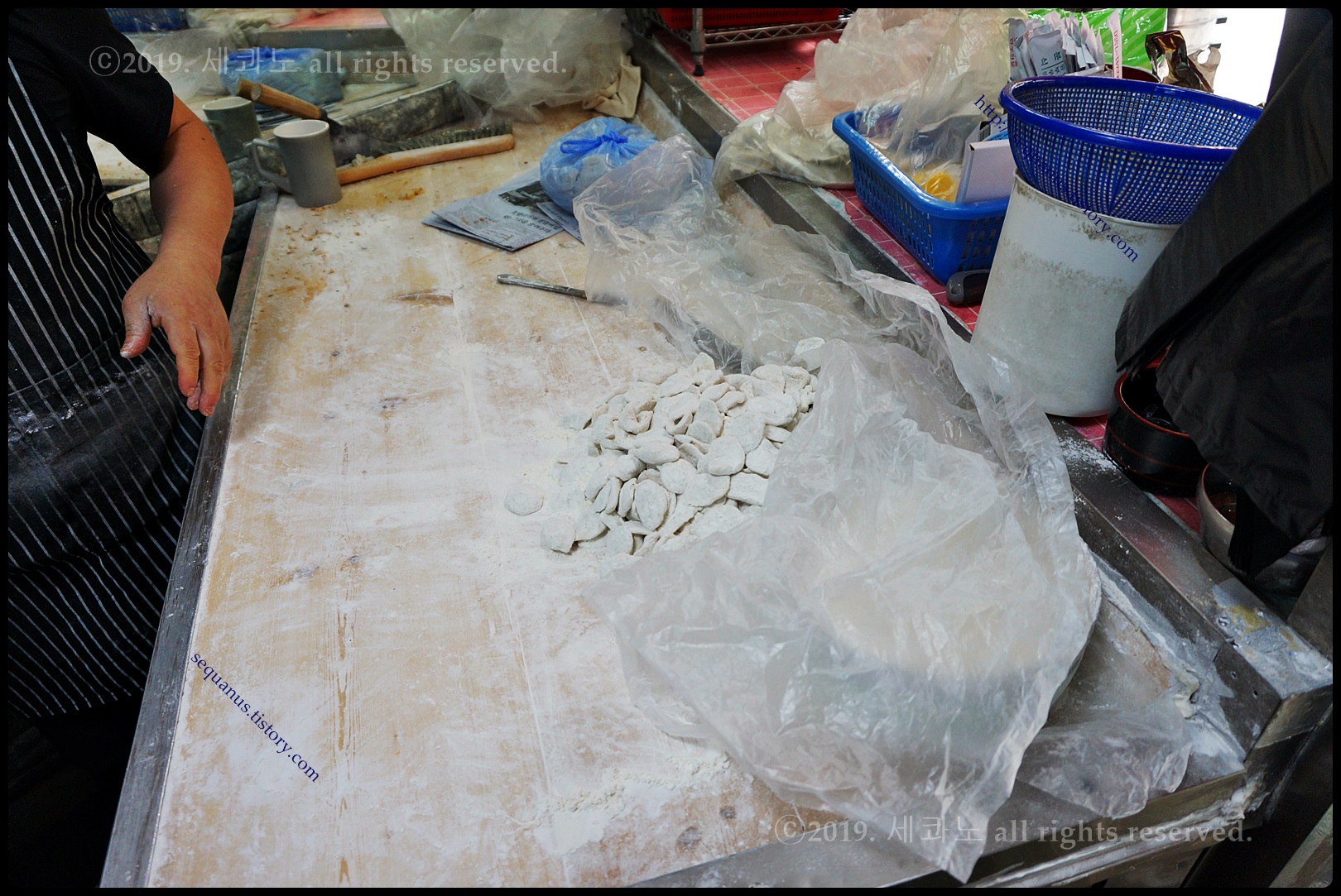 가게 입구 만두 빚는 판에