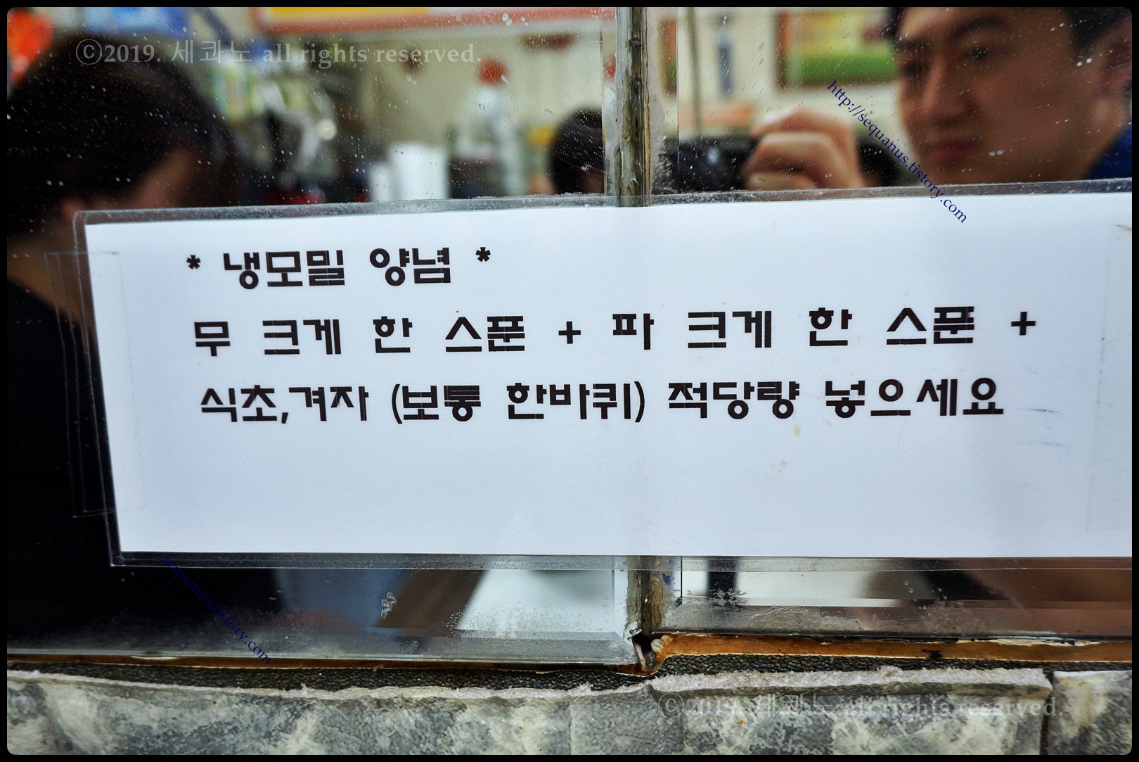 벽에 냉모밀 양념, 맛있게 먹는 방법이 나와있고