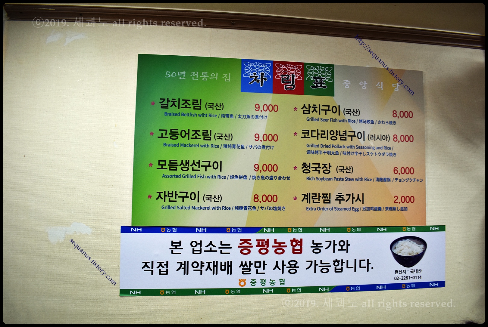 50년 전통의 남대문 갈치조림 맛집 중앙식당 메뉴판, 가격