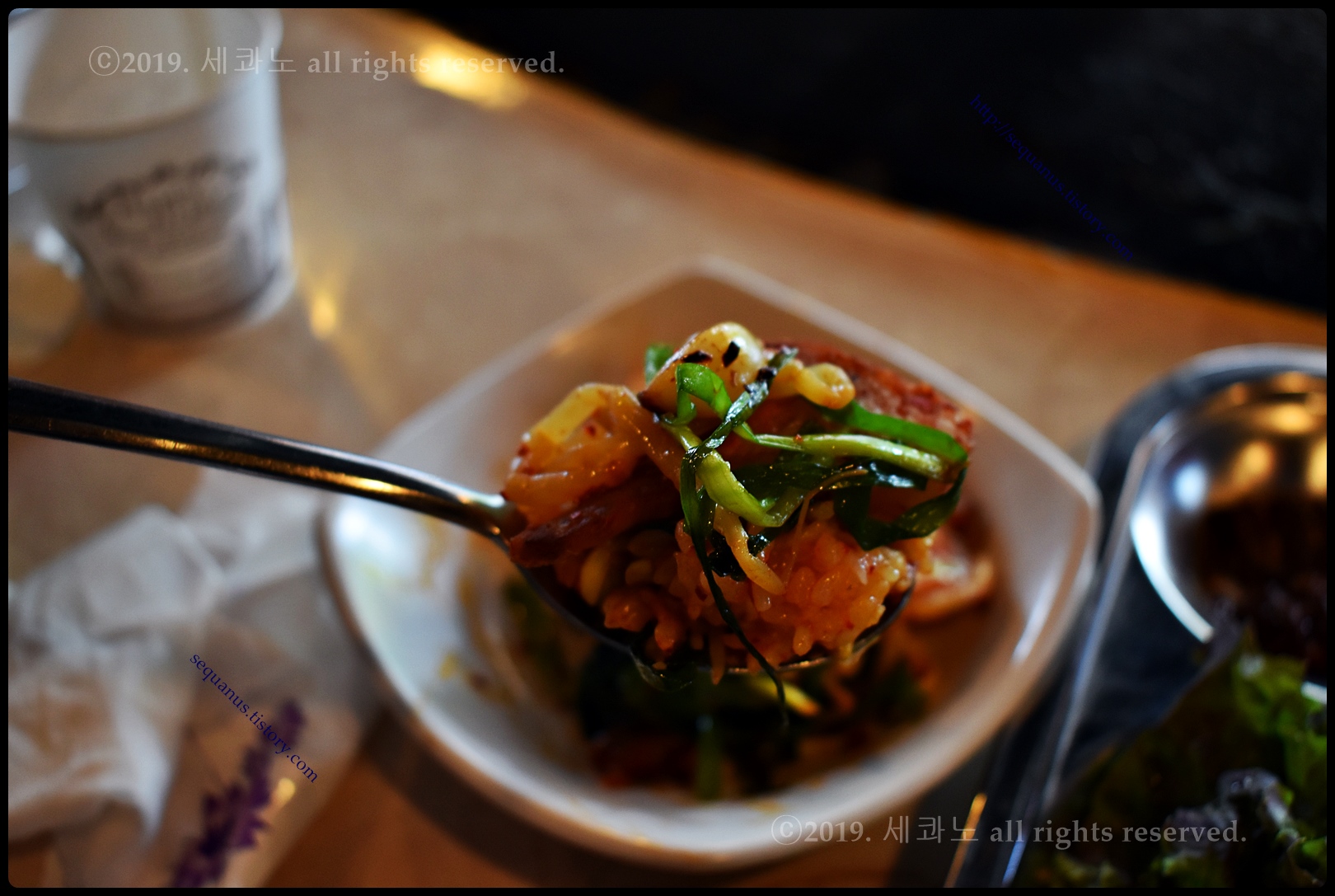 반찬으로 나온 무생채나 양파절임을 넣어 싸 먹어보았다.