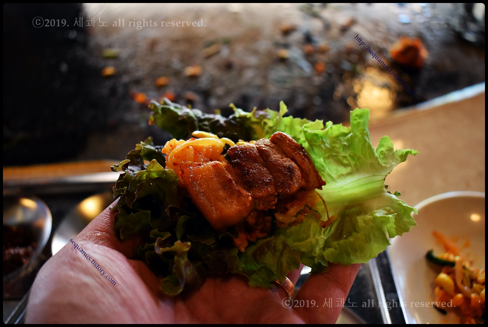그 위에 고기까지 한 점 더 올려 같이 먹어주고