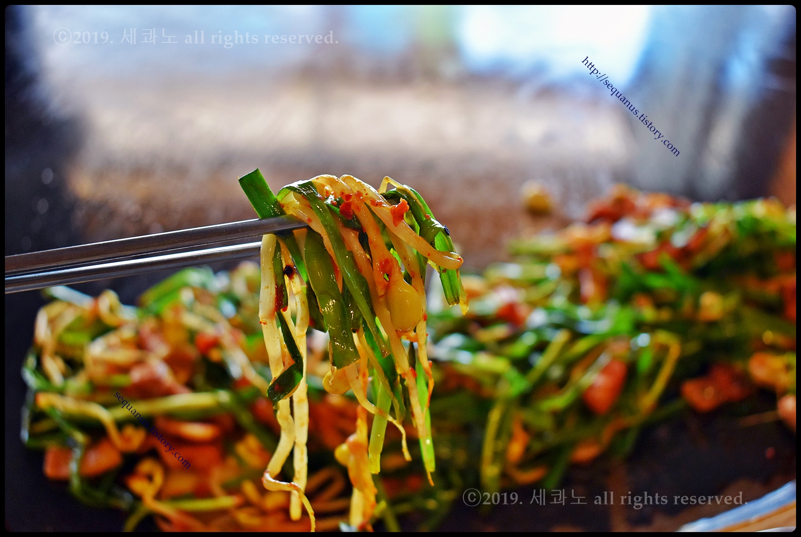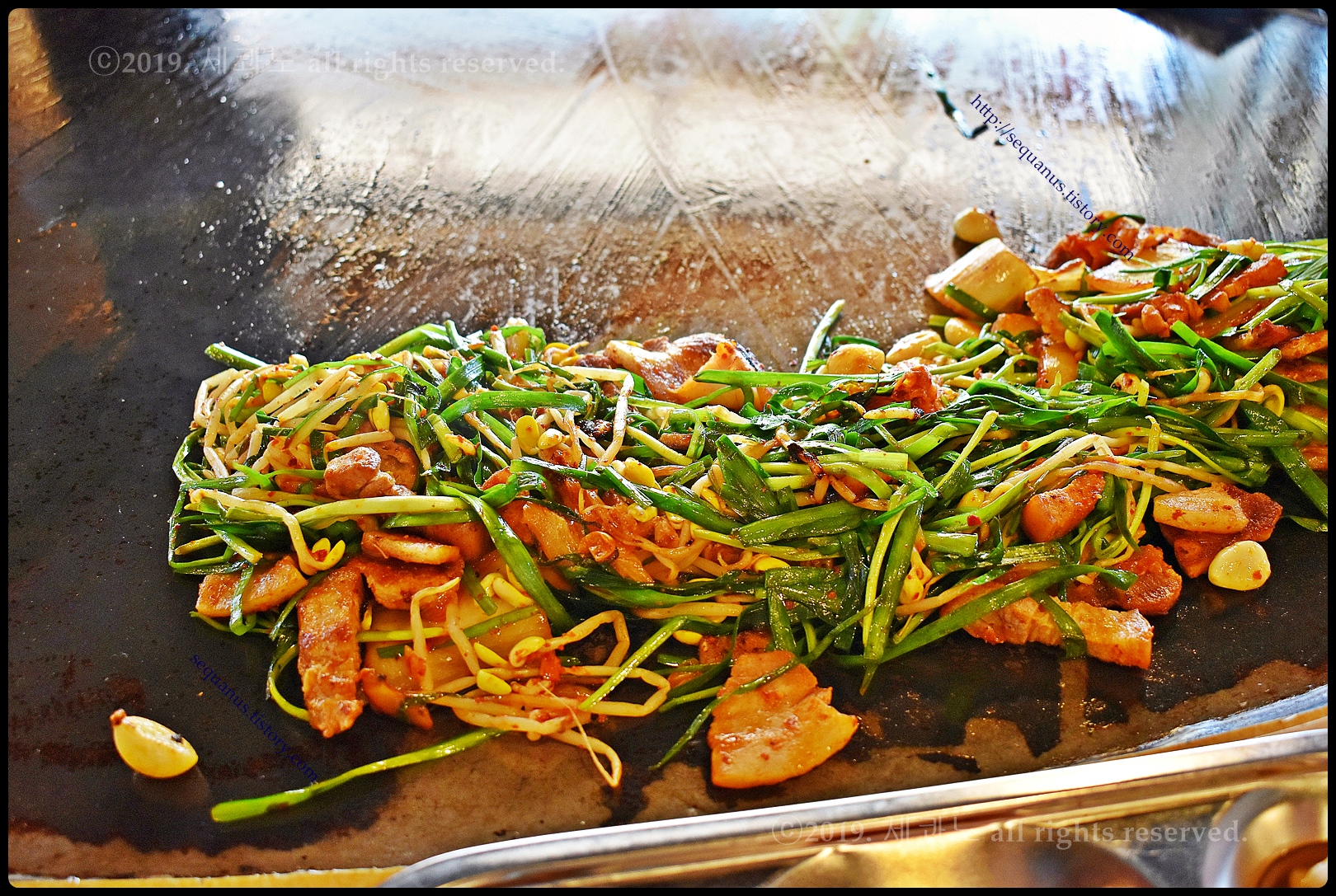 고기 위에 콩나물, 부추와 통마늘까지 먹어보았으면