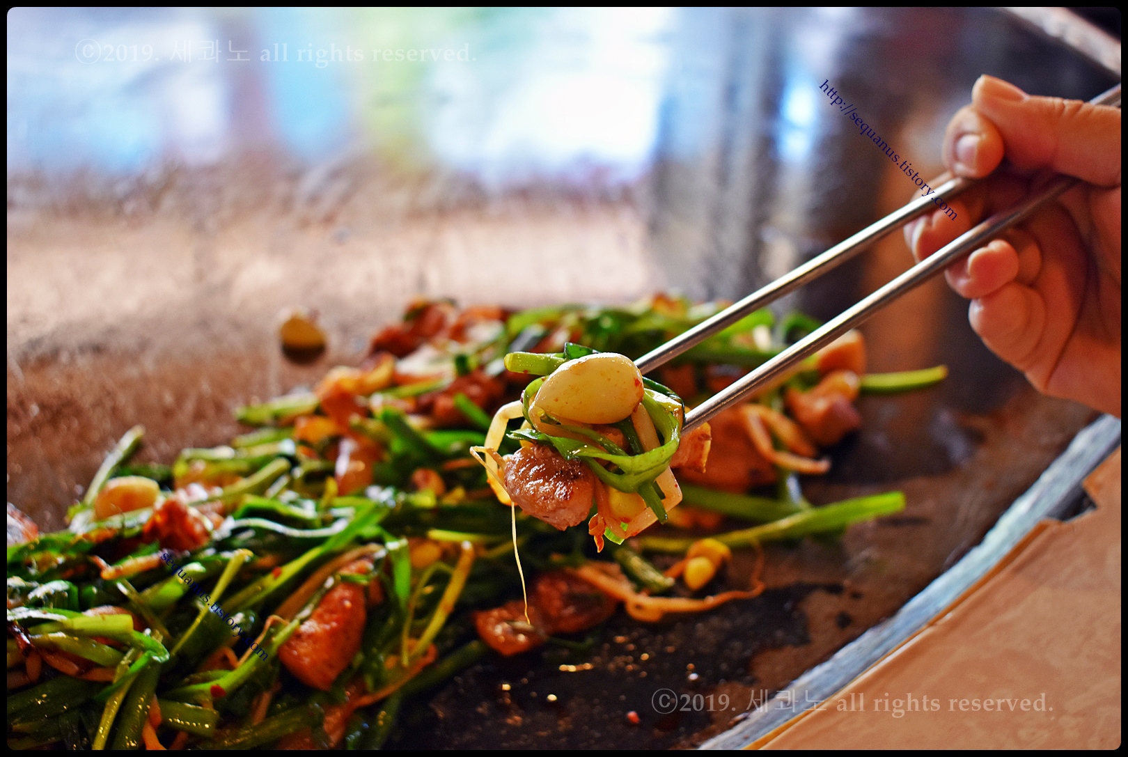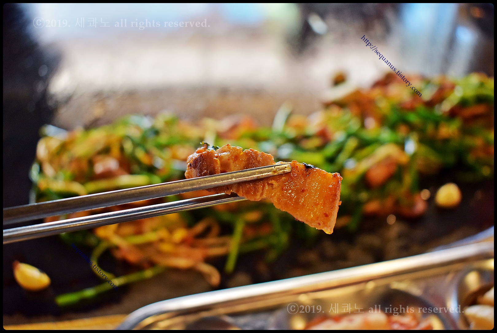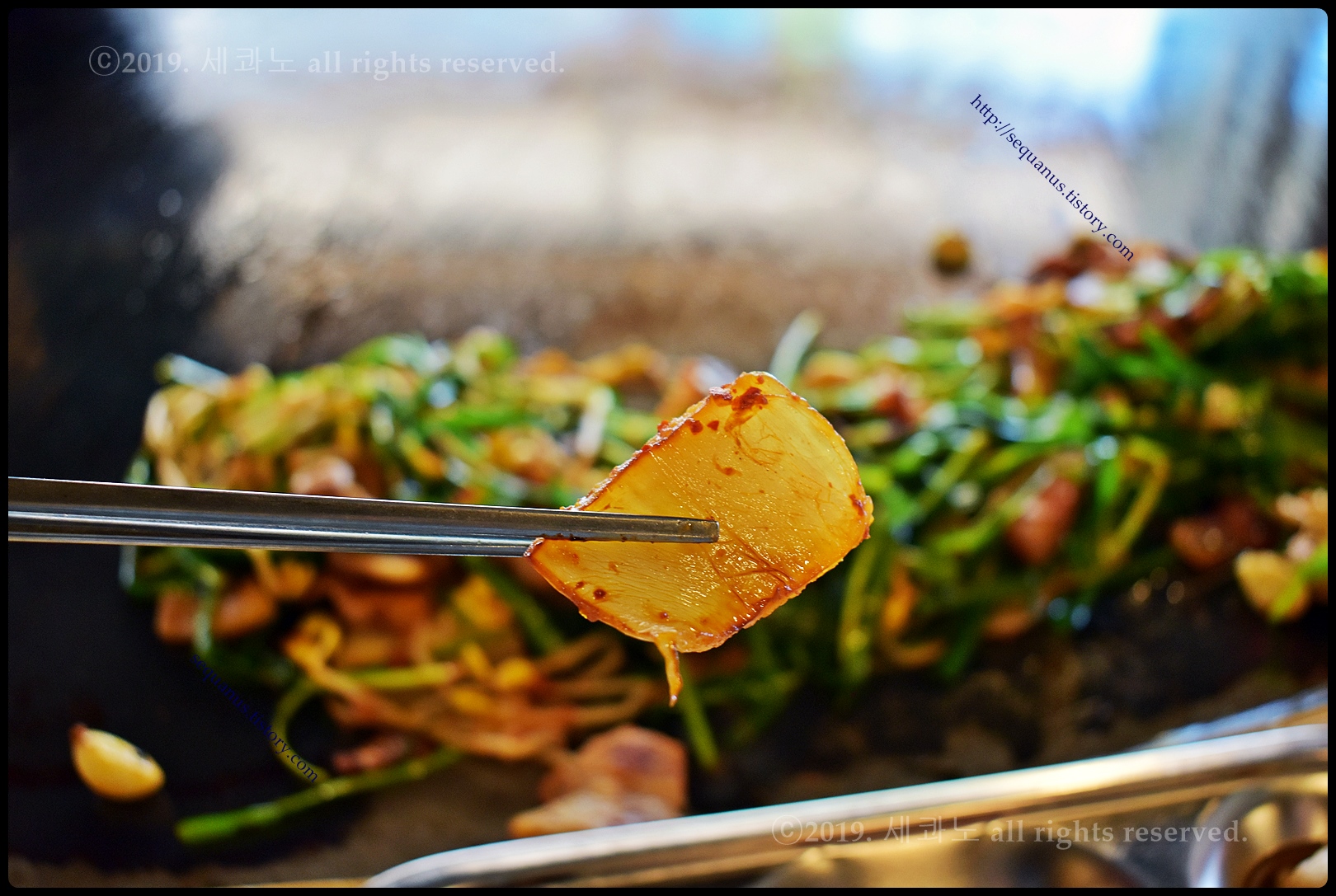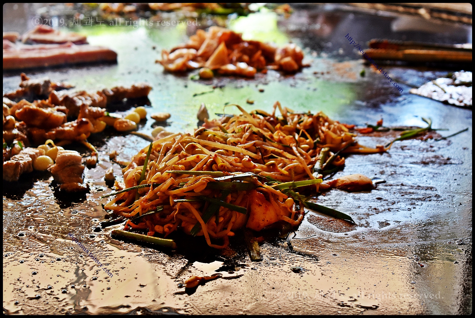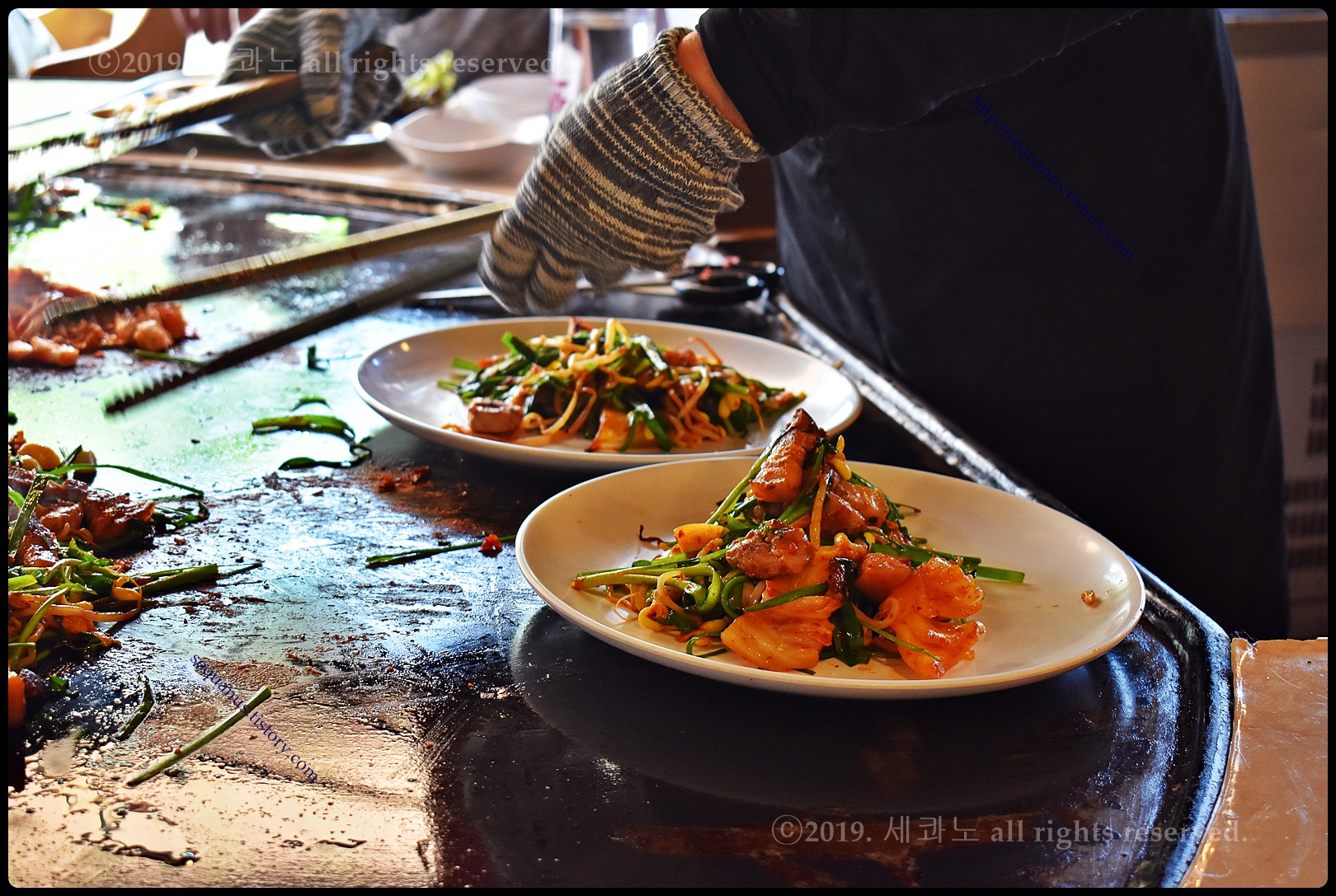 철판 위에서 고기와 함께 볶아져서 나오기는 하지만