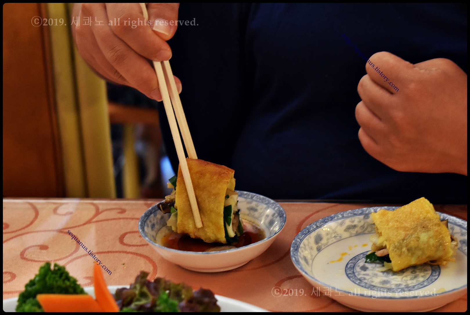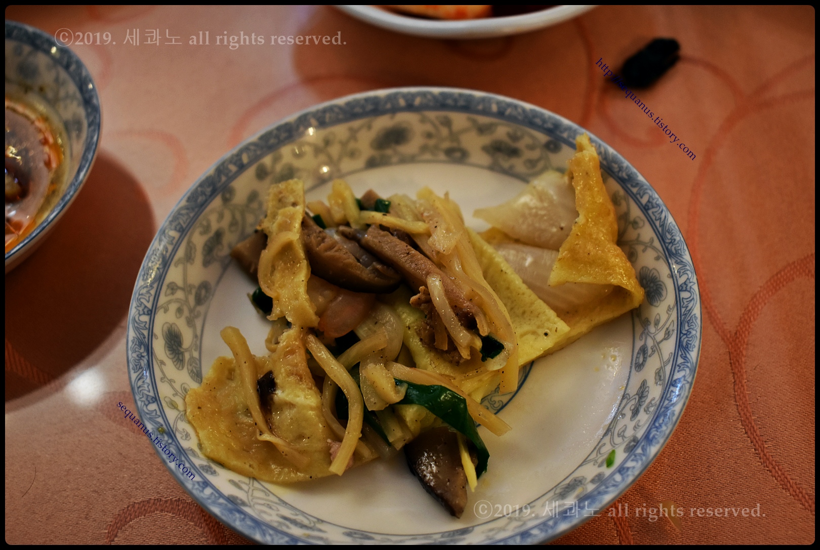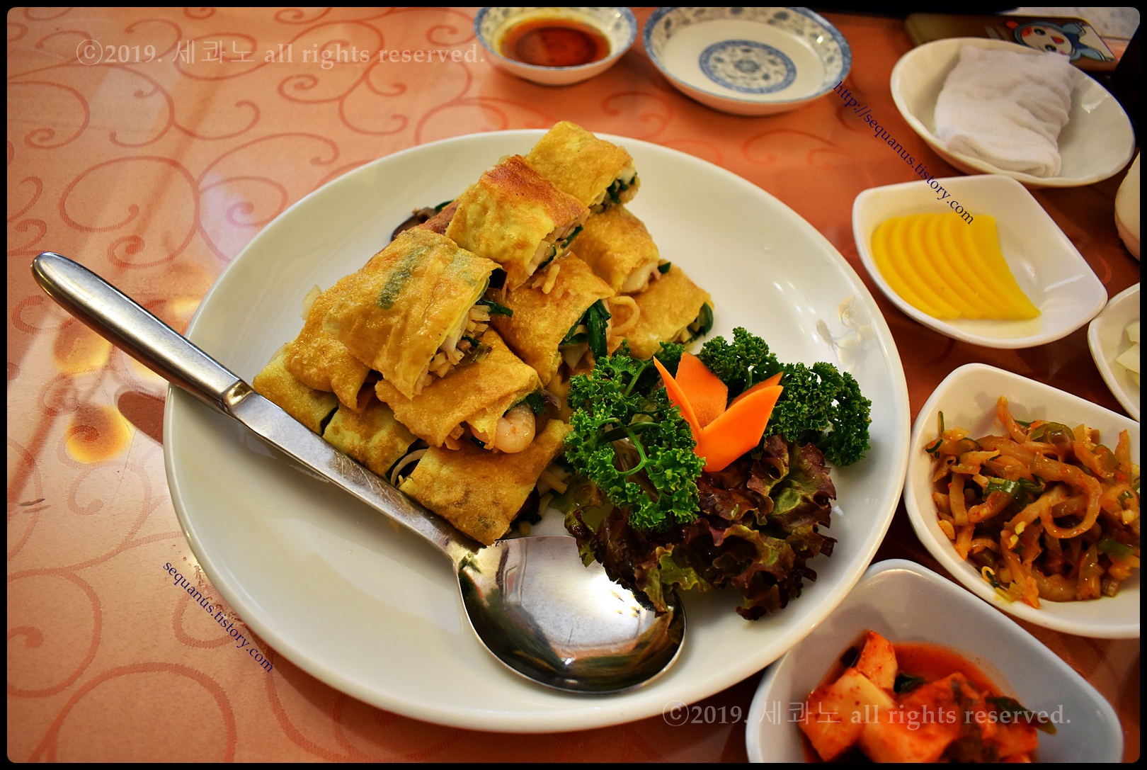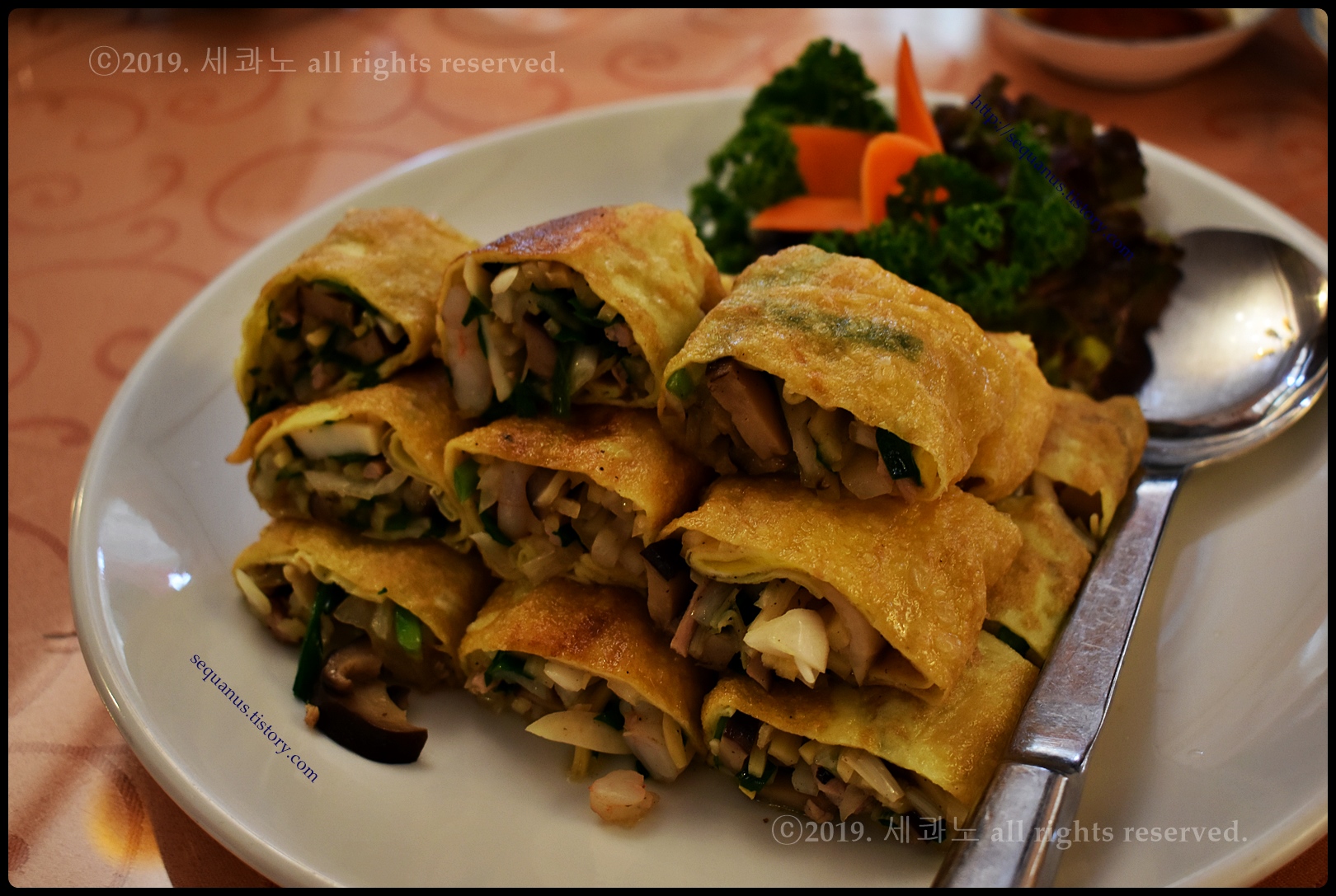 얇은 계란 피, 지단 안쪽으로 각양각색의 다양한 야채, 그리고 해물, 고기 등이 들어 있었다.