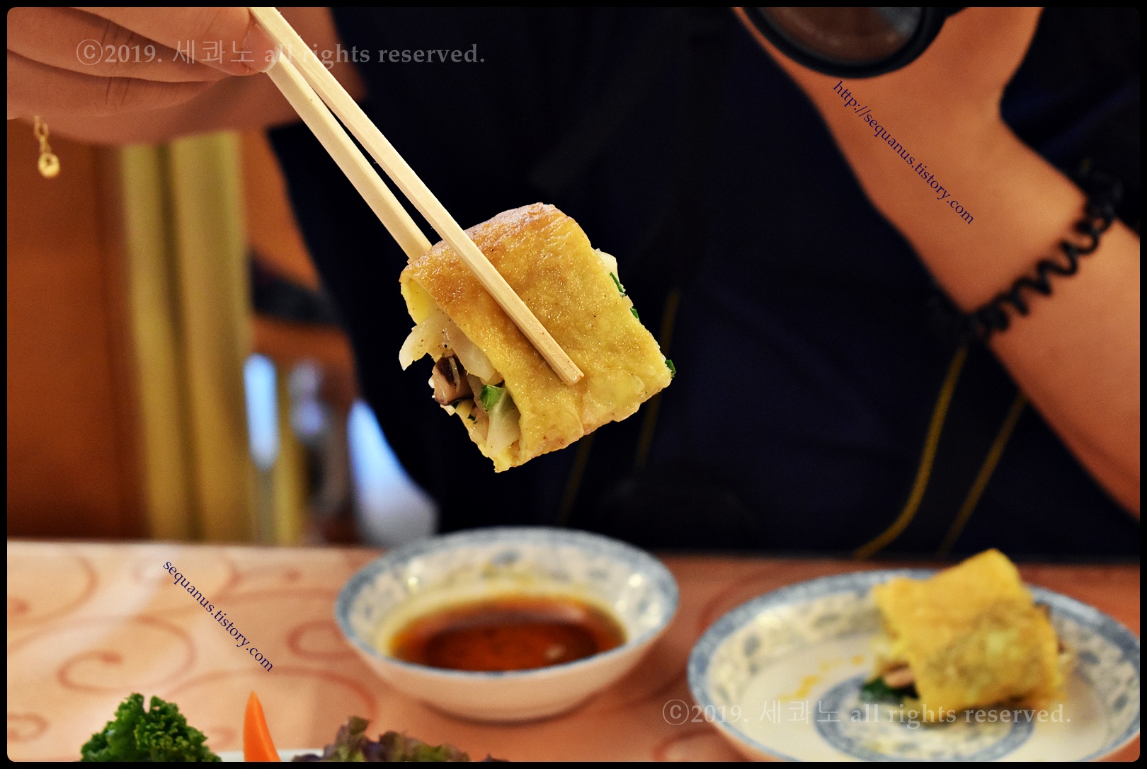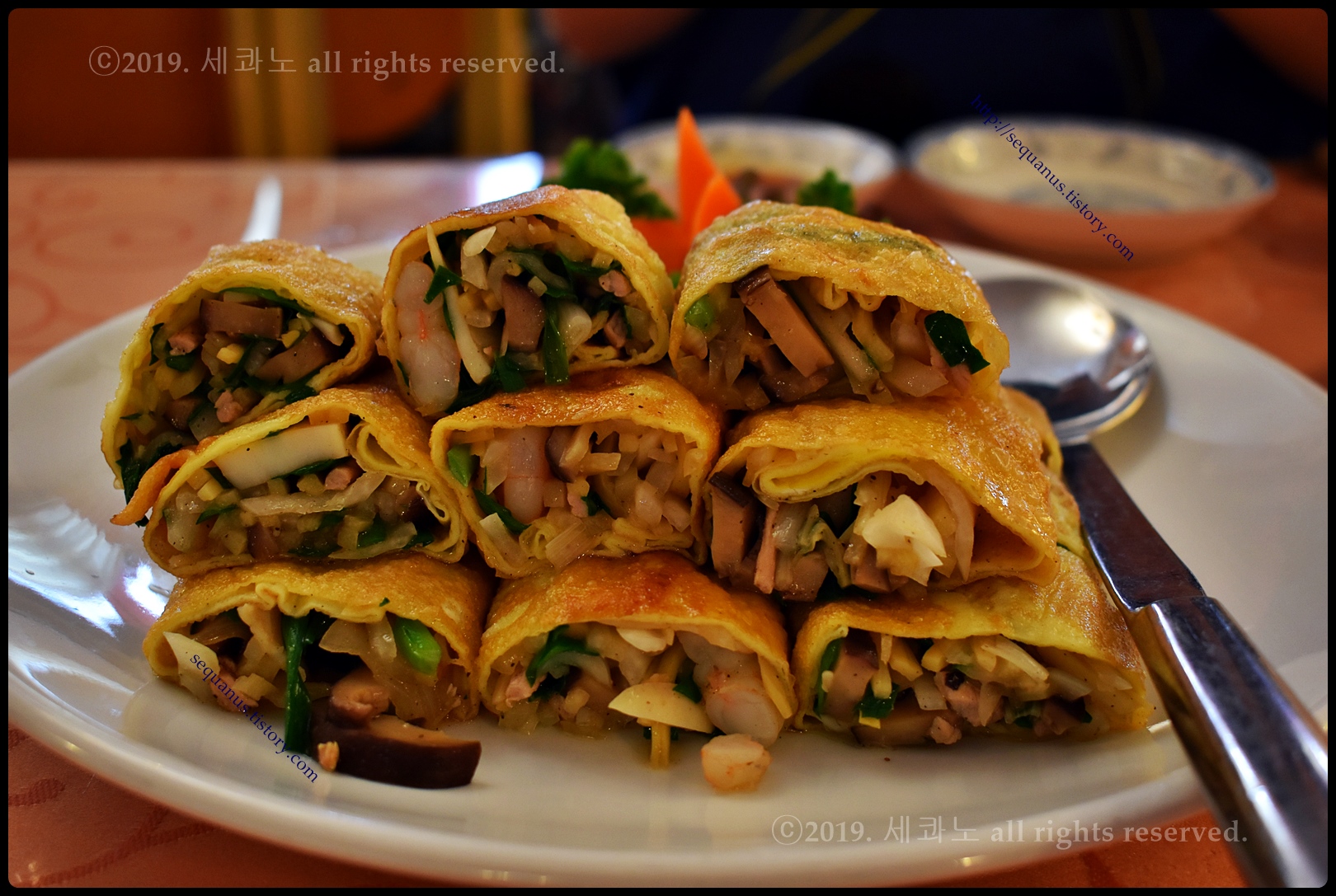 얇은 계란 피, 지단 안쪽으로 각양각색의 다양한 야채, 그리고 해물, 고기 등이 들어 있었다.