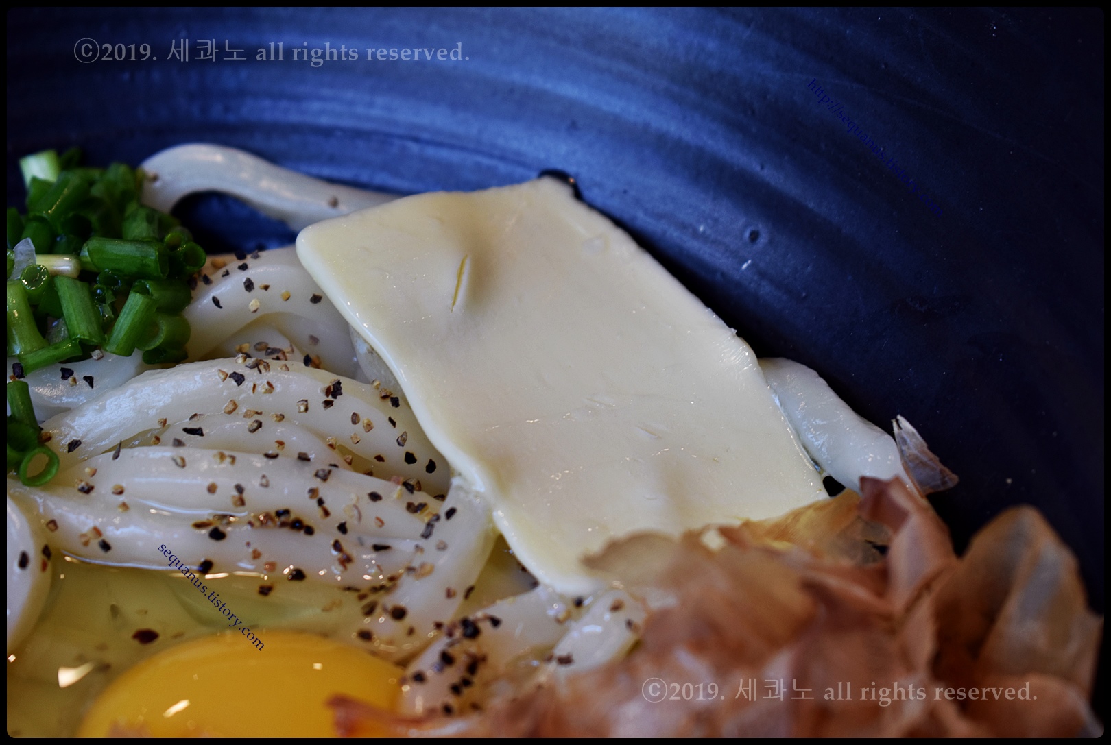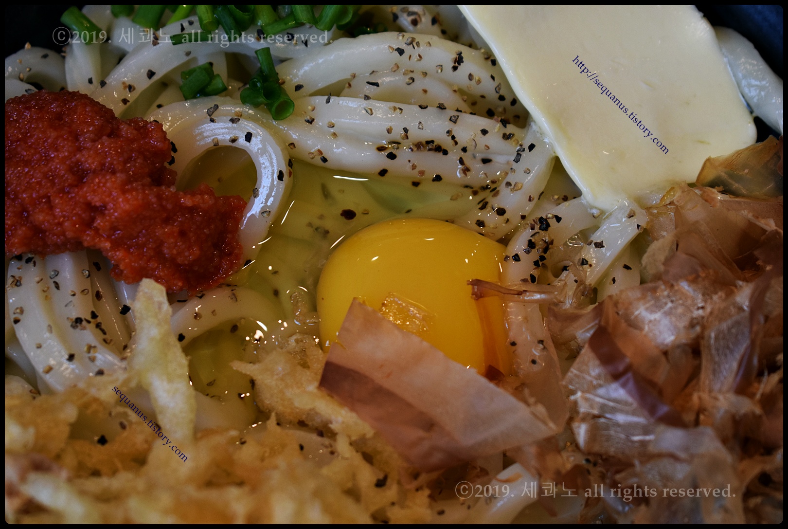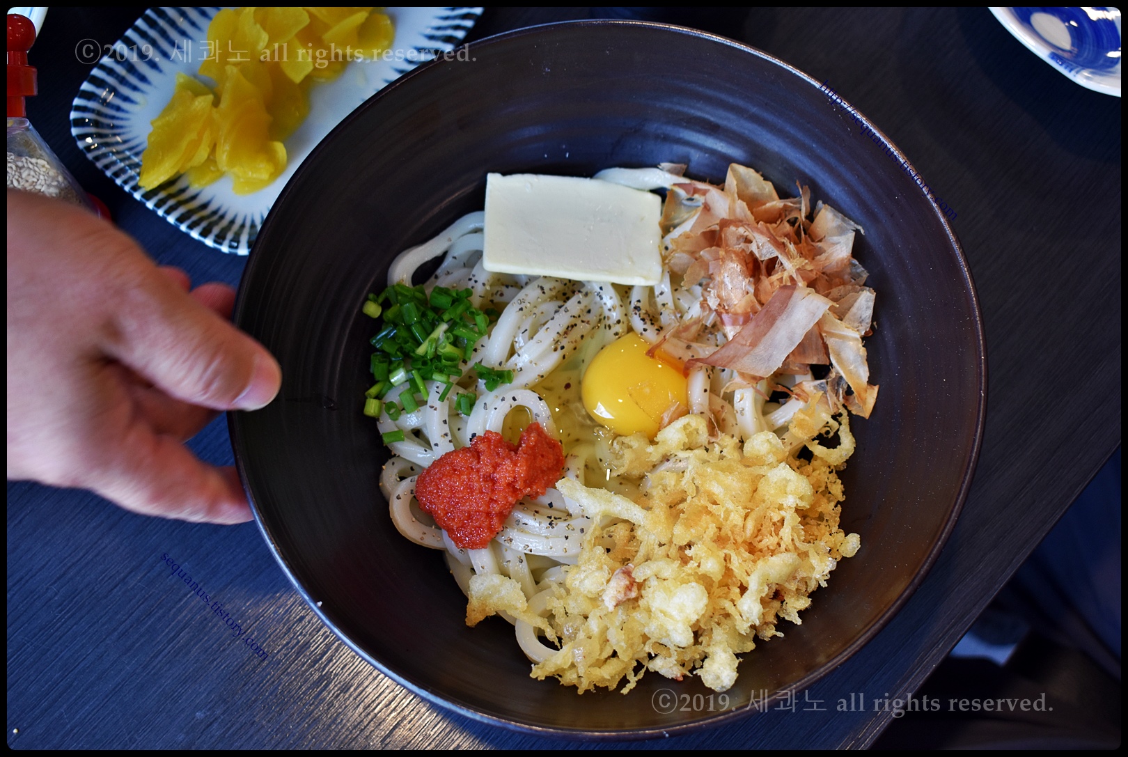 계란과 이즈니 버터, 명란을 함께 비벼 먹는 우동이다.