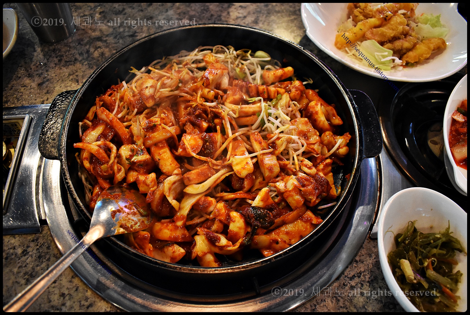 철판 위에 양념이 된 갑오징어를 올리자 지글지글
