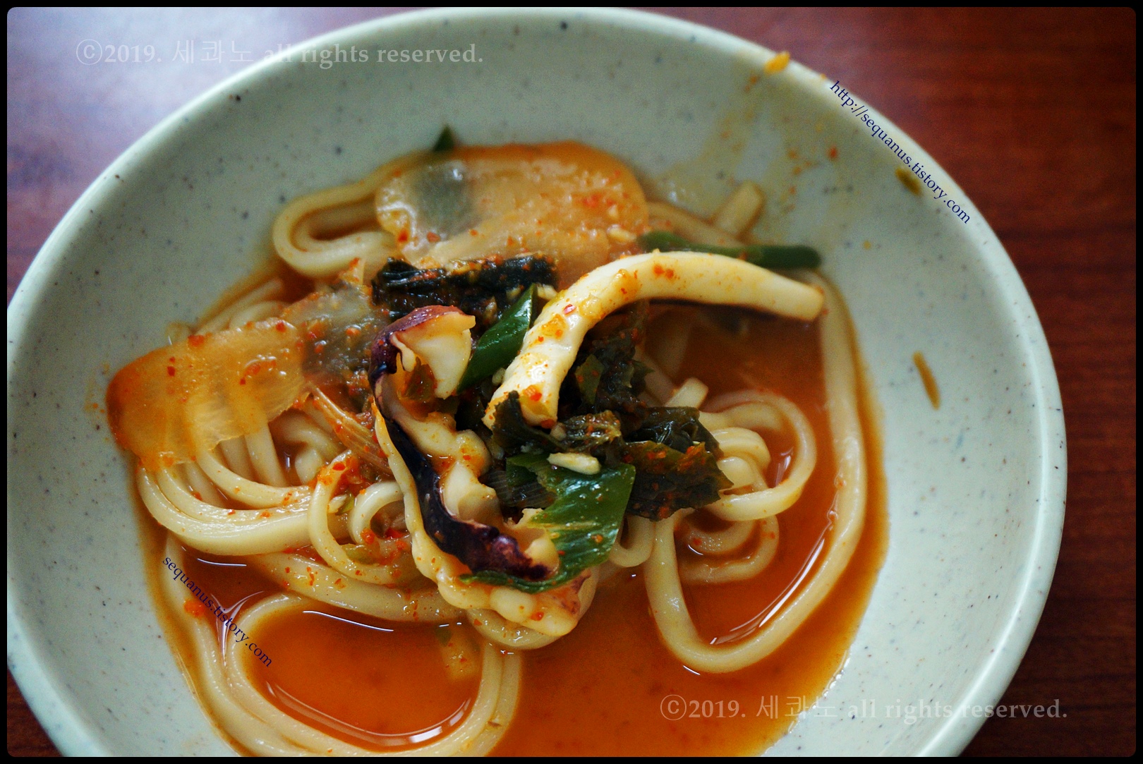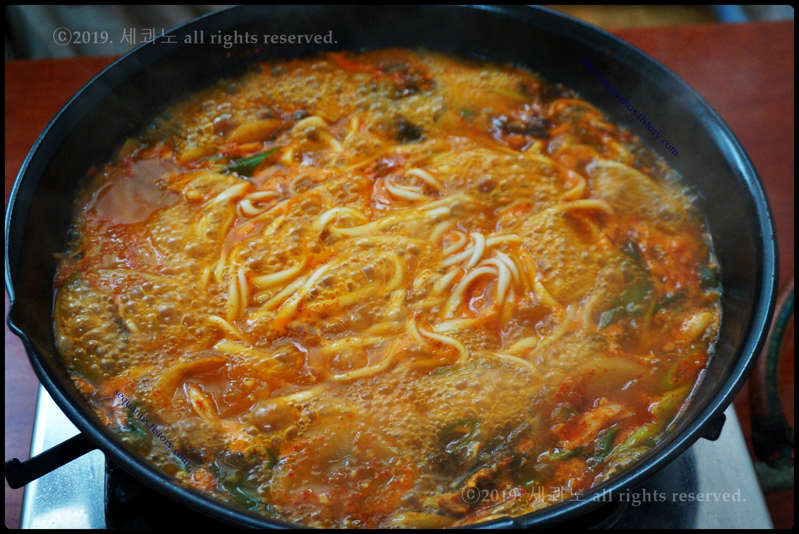 오징어찌개에 칼국수 면을 넣어서 먹는 것으로