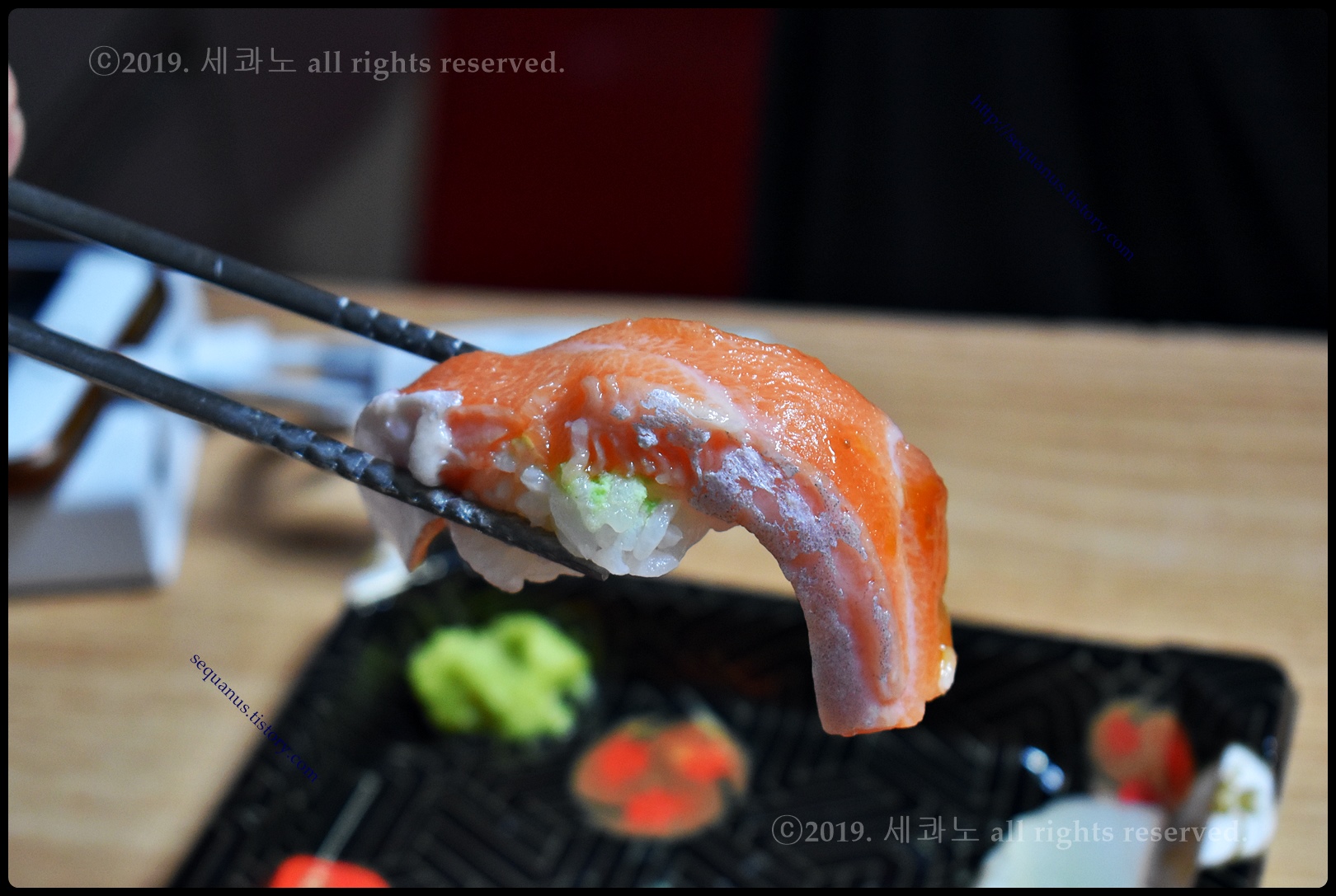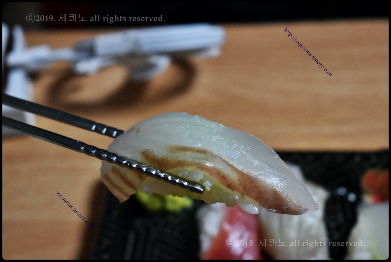 좌측처럼 초밥을 들어 찍는 것이 아니라